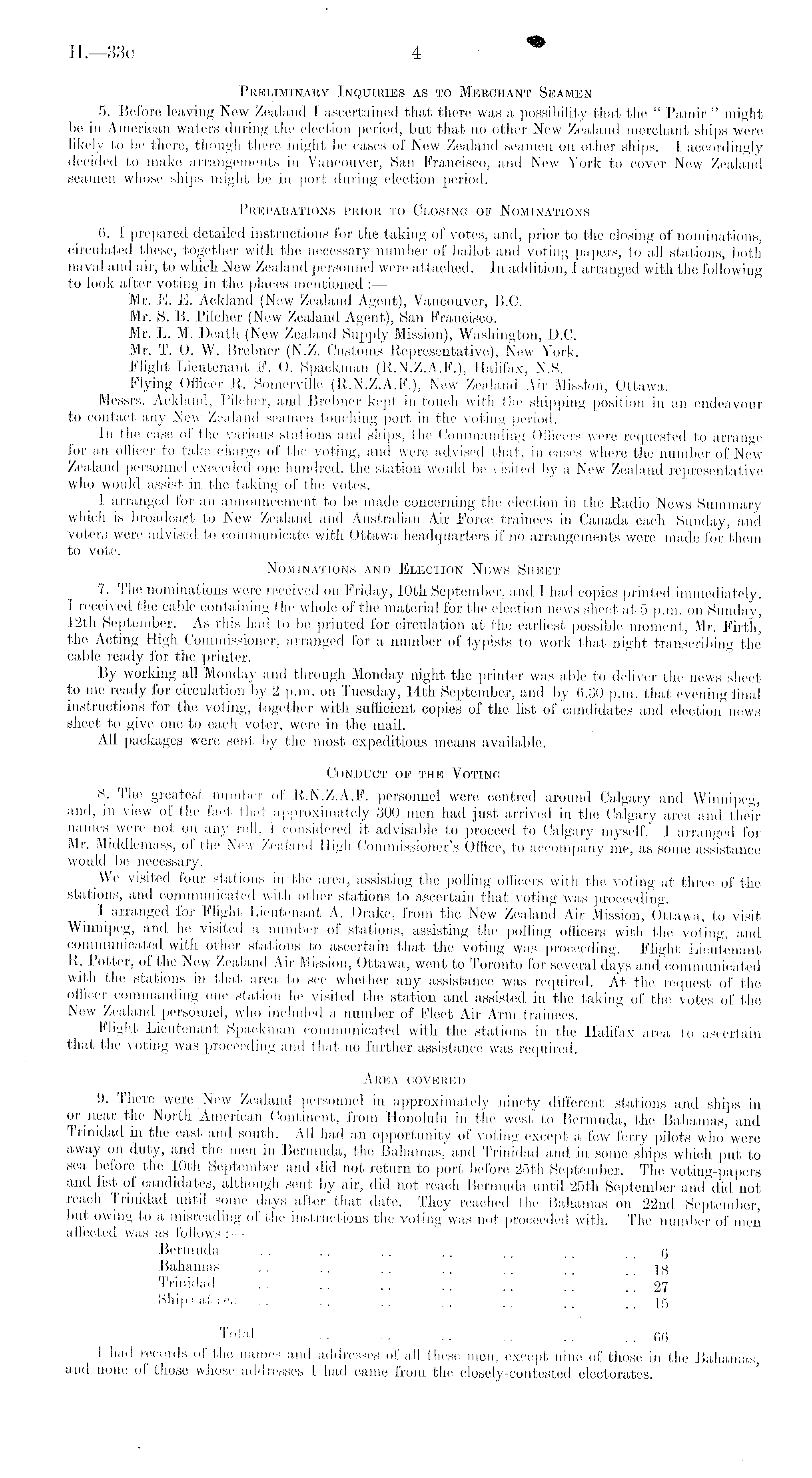 Preliminary Inquiries as to Merchant Seamen 5. Before leaving New Zealand I ascertained that there was a possibility that the " Pamir " might be in American waters during the election period, but that no other New Zealand merchant ships were likely to be there, though there might be cases of New Zealand seamen on other ships. I accordingly decided to make arrangements in Vancouver, San Francisco, and New York to cover New Zealand seamen whose ships might be in port during election period. Preparations prior to Closing of Nominations 6. I prepared detailed instructions for the taking of votes, and, prior to the closing of nominations, circulated these, together with the necessary number of ballot and voting papers, to all stations, both naval and air, to which New Zealand personnel were attached. In addition, I arranged with the following to look after voting in the places mentioned :— ■ Mr. E. E. Ackland (New Zealand Agent), Vancouver, B.C. Mr. S. B. Pilcher (New Zealand Agent), San Francisco. Mr. L. M. Death (New Zealand Supply Mission), Washington, B.C. Mr. T. 0. W. Brebner (N.Z. Customs Representative), New York. Flight Lieutenant F. 0. Spackman (R.N.Z.A.F.), Halifax, N.S. Flying Officer R. Somcrville (R.N.Z.A.F.), New Zealand Air Mission, Ottawa. Messrs. Ackland, Pilcher, and Brebner kept in touch with the shipping position in an endeavour to contact any New Zealand seamen touching port in the voting period. In the case of the various stations and ships, the Commanding Officers were requested to arrange for an officer to take charge of the voting, and were advised that, in cases where the number of New Zealand personnel exceeded one hundred, the station would be visited by a New Zealand representative who would assist in the taking of the votes. I arranged for an announcement to be made concerning the election in the Radio. News Summary which is broadcast to New Zealand and Australian Air Force trainees in Canada each Sunday, and voters were advised to communicate with Ottawa headquarters if no arrangements were made for them to vote. Nominations and Election News Sheet 1. The nominations were received on Friday, 10th September, and I had copies printed immediately. 1 received the cable containing the whole of the material for the election news sheet at 5 p.m. on Sundav, 12th September. As this had to be printed for circulation at the earliest possible moment, Mr. the Acting High Commissioner, arranged for a number of typists to work that night transcribing the cable ready for the printer. By working all Monday and through Monday night the printer was able to deliver the news sheet to me ready for circulation by 2 p.m. on Tuesday, 14th September, and by 6.30 p.m. that evening final instructions for the voting, together with sufficient copies of the list of candidates and election news sheet to give one to each voter, were in the mail. All packages were sent by the most expeditious means available. Conduct of the Voting 8. The greatest number of R.N.Z.A.F. personnel were centred around Calgary and Winnipeg, and, in view of the fact that approximately 300 men had just arrived in the Calgary area and their names were not on any roll, i considered it advisable to proceed to Calgary myself. 1 arranged for Mr. Middlemass, of the New Zealand High Commissioner's Office, to accompany me, as some assistance would be necessary. We visited four stations in the area, assisting the polling officers with the voting at three of the stations, and communicated with other stations to ascertain that voting was proceeding. I airanged for Flight Lieutenant A. Drake, from the New Zealand Air Mission, Ottawa, to visit Winnipeg, and he visited a number of stations, assisting the polling officers with the voting, and communicated with other stations to ascertain that the voting was proceeding. Flight Lieutenant R. Potter, of the New Zealand Air Mission, Ottawa, went to Toronto for several days and communicated with the stations in that area to sec whether any assistance was required. At the request of the officer commanding one station he visited the station and assisted in the taking of the votes of the New Zealand personnel, who included a number of Fleet Air Arm trainees. I light Lieutenant Spackman communicated with the stations in the Halifax area to ascertain that the voting was proceeding and that no further assistance was required. Area covered 9. There were New Zealand personnel in approximately ninety different stations and ships in or near the North American Continent, from Honolulu in the west to Bermuda, the Bahamas, and Trinidad in the east and south. All had an opportunity of voting except a few ferry pilots who were away on duty, and the men in Bermuda, the Bahamas, and Trinidad and in some ships which put to sea before the 10th September and did not return to port before 25th September. The voting-papers and list of candidates, although sent by air, did not reach Bermuda until 25th September and did not reach lrinidad until some days after that date. They reached the Bahamas on 22nd September, but owing to a misreading of the instructions the voting was not proceeded with. The number of men affected was as follows :— Bermuda .. .. .. .. . .. 6 Bahamas . . .. . . .. .. .. 18 Trinidad .. .. .. . . . , _ _ . . 27 Ships at sea .. .. ~ ~ , _ _ _ .. 15 Total .. .. .. .. .. ..66' I had records ol the names and addresses of all these men, except nine of those in the Bahamas and none of those whose addresses I had came from the closely-contested electorates.