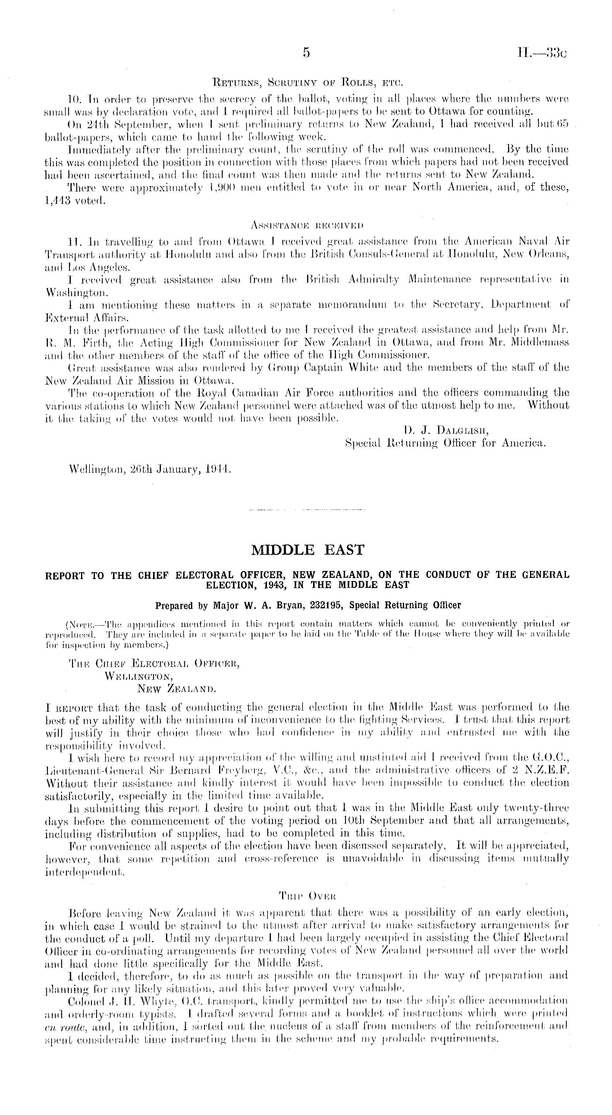 Beturns, Scrutiny of Bolls, etc. 10. In order to preserve the secrecy of the ballot, voting in all places where the numbers were small was by declaration vote, and I required all ballot-papers to be sent to Ottawa for counting, On 24th September, when I sent preliminary returns to New Zealand, I had received all but 65 ballot-papers, which came to hand the following week. Immediately after the preliminary count, the scrutiny of the roll was commenced. By the time this was completed the position in connection with those places from which papers had not been received had been ascertained, and the final count was then made and the returns sent to New Zealand. There were approximately 1,900 men entitled to vote in or near North America, and, of these, 1,443 voted. Assistance received 11. In travelling to and from Ottawa I received great assistance from the American Naval Air Transport authority at Honolulu and also from the British Consuls-General at Honolulu, New Orleans, and Los Angeles. I received great assistance also from the British Admiralty Maintenance representative in Washington. I am mentioning these matters in a separate memorandum to the Secretary, Department of External Affairs. In the performance of the task allotted to mo I received the greatest assistance and help from Mr. B. M. Firth, the Acting High Commissioner for New Zealand in Ottawa, and from Mr. Middlemass and the other members of the staff of the office of the High Commissioner. Great assistance was also rendered by Group Captain White and the members of the staff of the New Zealand Air Mission in Ottawa. The co-operation of the Boyal Canadian Air Force authorities and the officers commanding the various stations to which New Zealand personnel were attached was of the utmost help to me. Without it the taking of the votes would not have been possible. D. J. Dalglish, Special Be/turning Officer for America. Wellington, 26th January, 1944.