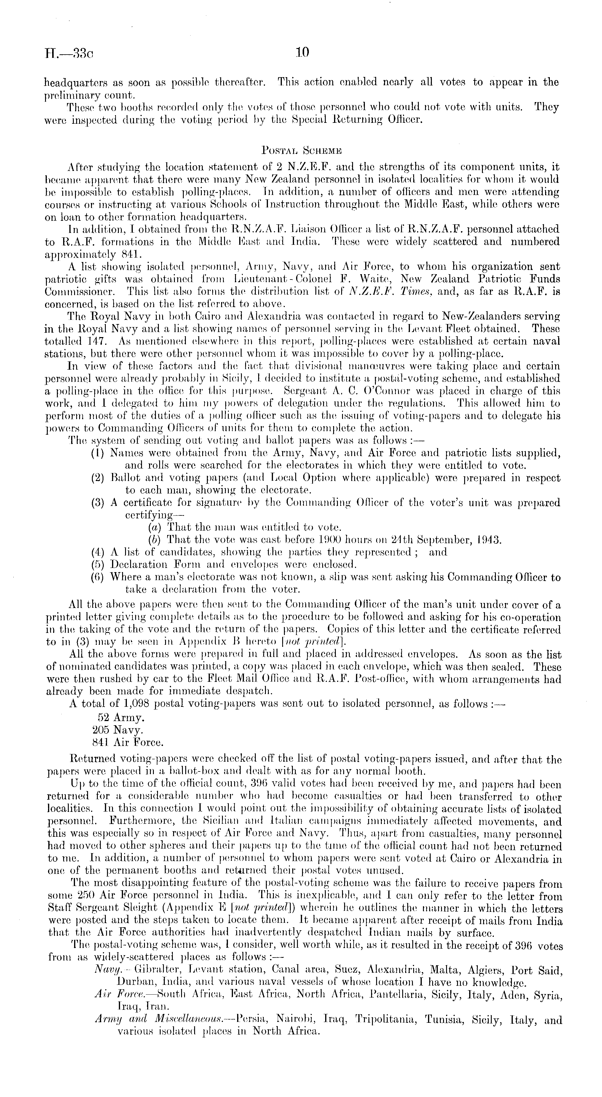 headquarters as soon as possible thereafter. This action enabled nearly all votes to appear in the preliminary count. These two booths recorded only the votes of those personnel who could not vote with units. They were inspected during the voting period by the Special Returning Officer. Postal Scheme After studying the location statement of 2 N.Z.E.F. and the strengths of its component units, it became apparent that there were many New Zealand personnel in isolated localities for whom it would be impossible to establish polling-places. In addition, a number of officers and men were attending courses or instructing at various Schools of Instruction throughout the Middle East, while others were on loan to otjier formation headquarters. In addition, I obtained from the R.N.Z.A.F. Liaison Officer a list of R.N.Z.A.F. personnel attached to R.A.F. formations in the Middle Bast and India. These were widely scattered and numbered approximately 841. A list showing isolated personnel, Army, Navy, and Air Force, to whom his organization sent patriotic gifts was obtained from Lieutenant - Colonel F. Waite, Now Zealand Patriotic Funds Commissioner. This list also forms the distribution list of N.Z.E.F. Times, and, as far as R.A.F. is concerned, is based on the list referred to above. The Royal Navy in both Cairo and Alexandria was contacted in regard to New-Zealanders serving in the Royal Navy and a list showing names of personnel serving in the Levant Fleet obtained. These totalled 147. As mentioned elsewhere in this report, polling-places were established at certain naval stations, but there were other personnel whom it was impossible to cover by a polling-place. In view of these factors and the fact that divisional manoeuvres were taking place and certain personnel were already probably in Sicily, I decided to institute a postal-voting scheme, and established a polling-place in the office for this purpose. Sergeant A. C. O'Connor was placed in charge of this work, and I delegated to him my powers of delegation under the regulations. This allowed him to perform most of the duties of a polling officer such as the issuing of voting-papers and to delegate his powers to Commanding Officers of units for them to complete the action. The system of sending out voting and ballot papers was as follows : — (I.) Names were obtained from the Army, Navy, and Air Force and patriotic lists supplied, and rolls were searched for the electorates in which they were entitled to vote. (2) Ballot and voting papers (and Local Option where applicable) were prepared in respect to each man, showing the electorate. (3) A certificate for signature by the Commanding Officer of the voter's unit was prepared certifying — (a) That the man was entitled to vote. (b) That the vote was cast before 1900 hours on 24th September, 1943. (4) A list of candidates, showing the parties they represented; and (5) Declaration Form and envelopes were enclosed. (6) Where a man's electorate was not known, a slip was sent asking his Commanding Officer to take a declaration from the voter. All the above papers were then sent to the Commanding Officer of the man's unit under cover of a printed letter giving complete details as to the procedure to be followed and asking for his co-operation in the taking of the vote and the return of the papers. Copies of this letter and the certificate referred to in (3) may be seen in Appendix B hereto [not printed]. All the above forms were prepared in full and placed in addressed envelopes. As soon as the list of nominated candidates was printed, a copy was placed in each envelope, which was then sealed. These were then rushed by car to the Fleet Mail Office and R.A.F. Post-office, with whom arrangements had already been made for immediate despatch. A total of 1,098 postal voting-papers was sent out to isolated personnel, as follows : — 52 Army. 205 Navy. 841 Air Force. Returned voting-papers were checked off the list of postal voting-papers issued, and after that the papers were placed in a ballot-box and dealt with as for any normal booth. Up to the time of the official count, 396 valid votes had been received by me, and papers had been returned for a considerable number who had becomc casualties or had been transferred to other localities. In this connection I would point out the impossibility of obtaining accurate lists of isolated personnel. Furthermore, the Sicilian and Italian campaigns immediately affected movements, and this was especially so in respect of Air Force and Navy. Thus, apart from casualties, many personnel had moved to other spheres and their papers up to the time of the official count had not been returned to me. In addition, a number of personnel to whom papers were sent voted at Cairo or Alexandria in one of the permanent booths and returned their postal votes unused. The most disappointing feature of the postal-voting scheme was the failure to receive papers from some 250 Air Force personnel in India. This is inexplicable, and I can only refer to the letter from Staff Sergeant Sleight (Appendix E [not printed]) wherein he outlines the manner in which the letters were posted and the steps taken to locate them. It became apparent after receipt of mails from India that the Air Force authorities had inadvertently despatched Indian mails by surface. The postal-voting scheme was, 1 consider, well worth while, as it resulted in the receipt of 396 votes from as widely-scattered places as follows : — Navy.—Gibralter, Levant station, Canal area, Suez, Alexandria, Malta, Algiers, Port Said, Durban, India, and various naval vessels of whose location I have no knowledge. Air Force. —South Africa, East Africa, North Africa, Pantellaria, Sicily, Italy, Aden, Syria, Iraq, Iran. Army and Miscellaneous.—Persia, Nairobi, Iraq, Tripolitania, Tunisia, Sicily, Italy, and various isolated places in North Africa.