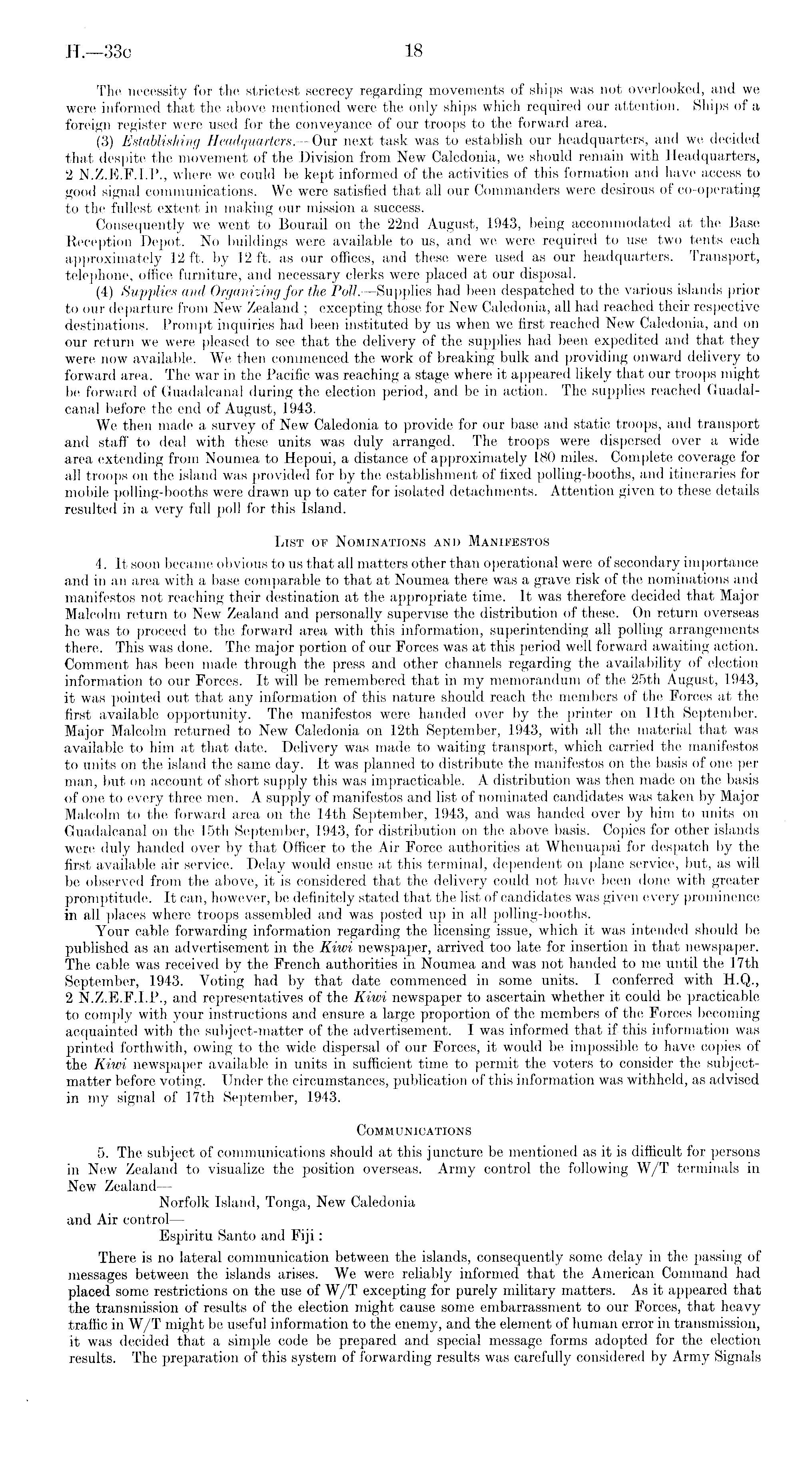 The necessity for the strictest secrecy regarding movements of ships was not overlooked, and we were informed that the above mentioned were the only ships which required our attention. Ships of a foreign register were used for the conveyance of our troops to the forward area. (3) Establishing Headquarters. —Our next task was to establish our headquarters, and we decided that despite the movement of the Division from New Caledonia, we should remain with Headquarters, 2 N.Z.E.F.1.P., where we could be kept informed of the activities of this formation and have access to good signal communications. We were satisfied that all our Commanders were desirous of co-operating to the fullest extent in making our mission a success. Consequently we went to Bourail on the 22nd August, 1943, being accommodated at the Base Reception Depot. No buildings were available to us, and we were required to use two tents each approximately 12 ft. by 12 ft. as our offices, and these were used as our headquarters. Transport, telephone, office furniture, and necessary clerks were placed at our disposal. (4) Supplies and Organizing for the Poll. —Supplies had been despatched to the various islands prior to our departure from New Zealand ; excepting those for New Caledonia, all had reached their respective destinations. Prompt inquiries had been instituted by us when we first reached New Caledonia, and on our return we were pleased to see that the delivery of the supplies had been expedited and that they were now available. We then commenced the work of breaking bulk and providing onward delivery to forward area. The war in the Pacific was reaching a stage where it appeared likely that our troops might be forward of Guadalcanal during the election period, and be in action. The supplies reached Guadalcanal before the end of August, 1943. We then made a survey of New Caledonia to provide for our base and static troops, and transport and staff to deal with these units was duly arranged. The troops were dispersed over a wide area extending from Noumea to Hepoui, a distance of approximately 180 miles. Complete coverage for all troops on the island was provided for by the establishment of fixed polling-booths, and itineraries for mobile polling-booths were drawn up to cater for isolated detachments. Attention given to these details resulted in a very full poll for this island. List of Nominations and Manifestos 4. It soon became obvious to us that all matters other than operational were of secondary importance and in an area with a base comparable to that at Noumea there was a grave risk of the nominations and manifestos not reaching their destination at the appropriate time. It was therefore decided that Major Malcolm return to New Zealand and personally supervise the distribution of these. On return overseas he was to proceed to the forward area with this information, superintending all polling arrangements there. This was done. The major portion of our Forces was at this period well forward awaiting action. Comment has been made through the press and other channels regarding the availability of election information to our Forces. It will be remembered that in my memorandum of the 25th August, 1943, it was pointed out that any information of this nature should reach the members of the Forces at the first available opportunity. The manifestos were handed over by the printer on 11th September. Major Malcolm returned to New Caledonia on 12th September, 1943, with all the material that was available to him at that date. Delivery was made to waiting transport, which carried the manifestos to units on the island the same day. It was planned to distribute the manifestos on the basis of one per man, but on account of short supply this was impracticable. A distribution was then made on the basis of one to every three men. A supply of manifestos and list of nominated candidates was taken by Major Malcolm to the forward area on the 14th September, 1943, and was handed over by him to units on Guadalcanal on the 15th September, 1943, for distribution on the above basis. Copies for other islands were duly handed over by that Officer to the Air Force authorities at Whenuapai for despatch by the first available air service. Delay would ensue at this terminal, dependent on plane service, but, as will be observed from the above, it is considered that the delivery could not have been done with greater promptitude. It can, however, be definitely stated that the list of candidates was given every prominence in all places where troops assembled and was posted up in all polling-booths. Your cable forwarding information regarding the licensing issue, which it was intended should be published as an advertisement in the Kiwi newspaper, arrived too late for insertion in that newspaper. The cable was received by the French authorities in Noumea and was not handed to me until the 17th September, 1943. Voting had by that date commenced in some units. I conferred with H.Q., 2 N.Z.E.F.1.P., and representatives of the Kiwi newspaper to ascertain whether it could be practicable to comply with your instructions and ensure a large proportion of the members of the Forces becoming acquainted with the subject-matter of the advertisement. I was informed that if this information was printed forthwith, owing to the wide dispersal of our Forces, it would be impossible to have copies of the Kiwi newspaper available in units in sufficient time to permit the voters to consider the subjectmatter before voting. Under the circumstances, publication of this information was withheld, as advised in my signal of 17th September, 1943. Communications 5. The subject of communications should at this juncture be mentioned as it is difficult for persons in New Zealand to visualize the position overseas. Army control the following W/T terminals in New Zealand — Norfolk Island, Tonga, New Caledonia and Air control — Espiritu Santo and Fiji: There is no lateral communication 