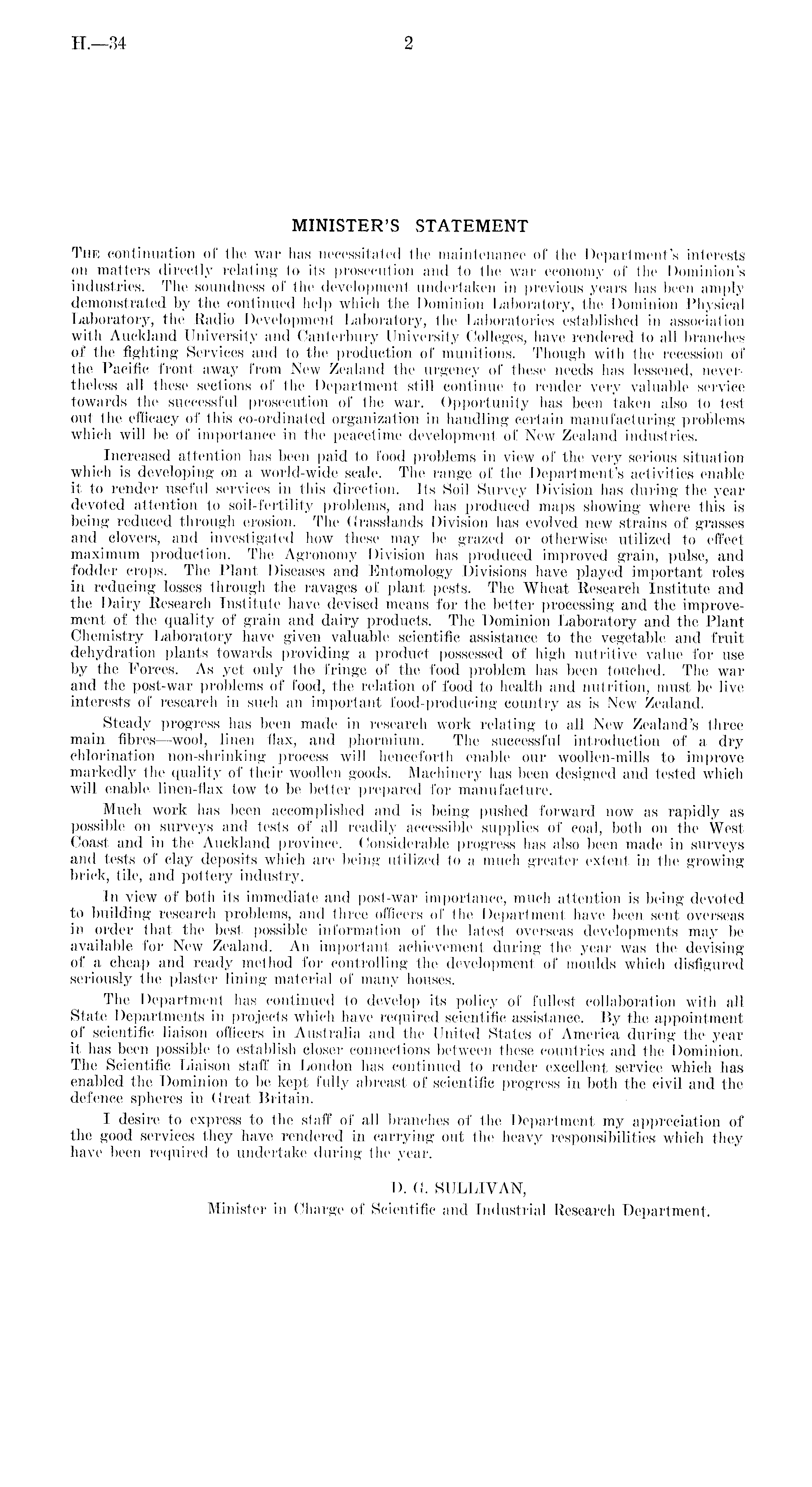 MINISTER'S STATEMENT The continuation of the war lias necessitated the maintenance of the Department's interests on matters directly relating to its prosecution and to the war economy of the Dominion's industries. The soundness of the development undertaken in previous years lias been amply demonstrated by the continued help which the Dominion Laboratory, the Dominion Physical Laboratory, the Radio Development Laboratory, the Laboratories established in association with Auckland University and Canterbury University Colleges, have rendered to all branches of the fighting Services and to the production of munitions, Though with the recession of the Pacific front away from New Zealand the urgency of these needs has lessened, nevertheless all these sections of the Department still continue to render very valuable service towards the successful prosecution of the war. Opportunity has been taken also to testout the efficacy of this co-ordinated organization in handling certain manufacturing problems which will be of importance in the peacetime development of New Zealand industries. Increased attention has been paid to food problems in view of the very serious situation which is developing on a world-wide scale. The range of the Department's activities enable it to render useful services in this direction. Its Soil Survey Division has during the year devoted attention to soil-fertility problems, and has produced maps showing where this is being reduced through erosion. The Grasslands Division has evolved new strains of grasses and clovers, and investigated how these may be grazed or otherwise utilized to effect maximum production. The Agronomy Division has produced improved grain, pulse, and fodder crops. The Plant Diseases and Entomology Divisions have played important roles in reducing losses through the ravages of plant pests. The Wheat Research Institute and the Dairy Research Institute have devised means for the better processing and the improvement of the quality of grain and dairy products. The Dominion Laboratory and the Plant Chemistry Laboratory have given valuable scientific assistance to the vegetable and fruit dehydration plants towards providing a product possessed of high nutritive value for use by the Forces. As yet only the fringe of the food problem has been touched. The war and the post-war problems of food, the relation of food to health and nutrition, must be live interests of research in such an important food-producing country as is New Zealand. Steady progress has been made in research work relating to all New Zealand's three main fibres—wool, linen flax, and phormium. The successful introduction of a dry chlorination non-shrinking process will henceforth enable our woollen-mills to improve markedly the quality of their woollen goods. Machinery has been designed and tested which will enable linen-flax tow to be better prepared for manufacture. Much work has been accomplished and is being pushed forward now as rapidly as possible on surveys and tests of all readily accessible supplies of coal, both on the West Coast and in the Auckland province. Considerable progress has also been made in surveys and tests of clay deposits which are being utilized to a much greater extent in the growing brick, tile, and pottery industry. In view of both its immediate and post-war importance, much attention is being devoted to building research problems, and three officers of the Department have been sent overseas in order that the best possible information of the latest overseas developments may be available for New Zealand. An important achievement during the year was the devising of a cheap and ready method for controlling the development of moulds which disfigured seriously the plaster lining material of many houses. The Department has continued to develop its policy of fullest collaboration with all State Departments in projects which have required scientific assistance. By the appointment of scientific liaison officers in Australia and the United States of America during the year it has been possible to establish closer connections between these countries and the Dominion.The Scientific Liaison staff in London has continued to render excellent service which has enabled the Dominion to be kept fully abreast of scientific progress in both the civil and the defence spheres in Great Britain. I desire to express to the staff of all branches of the Department my appreciation of the good services they have rendered in carrying out the heavy responsibilities which they have been required to undertake during the year. D. G. SULLIVAN, Minister in Charge of Scientific and Industrial Research Department.