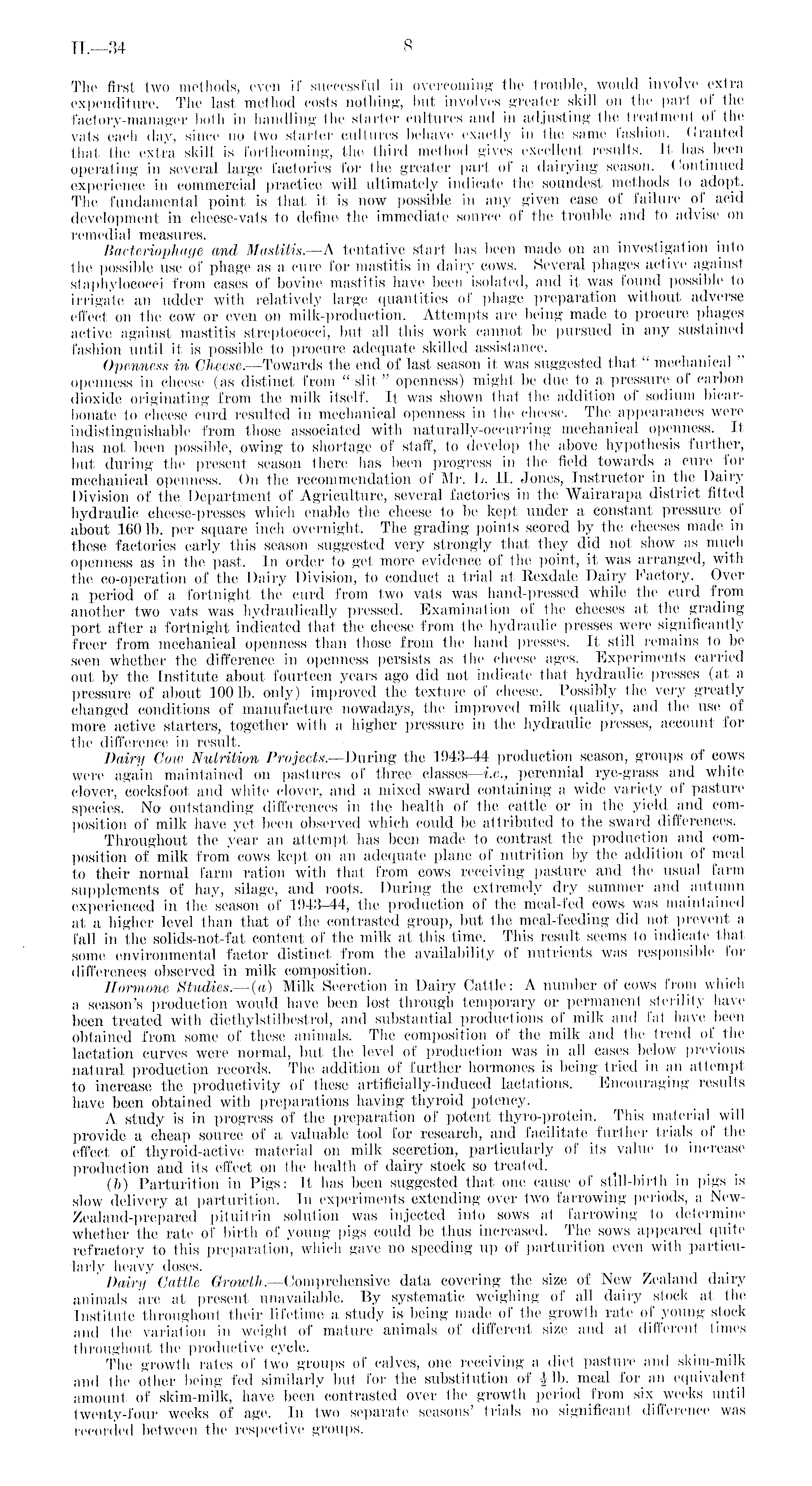 The first two methods, even if successful in overcoming the trouble, would involve extra expenditure. The last method costs nothing, but involves greater skill on the part of the factory-manager both in handling the starter cultures and in adjusting the treatment of the vats each day, since no two starter cultures behave exactly in the same fashion. Granted that the extra skill is forthcoming, the third method gives excellent results. It has been operating in several large factories for the greater part of a dairying season. Continued experience in commercial practice will ultimately indicate the soundest methods to adopt. The fundamental point is that it is now possible in any given case of failure of acid development in cheese-vats to define the immediate source of the trouble and to advise on remedial measures. Bacteriophage and Mastitis.—A tentative start has been made on an investigation into the possible use of phage as a cure for mastitis in dairy cows. Several phages active against staphylococci from cases of bovine mastitis have been isolated, and it was found possible to irrigate an udder with relatively large quantities of phage preparation without adverse effect on the cow or even on milk-production. Attempts are being made to procure phages active against mastitis streptococci, but all this work cannot be pursued in any sustained fashion until it is possible to procure adequate skilled assistance. Openness in Cheese.-—Towards the end of last season it was suggested that " mechanical " openness in cheese (as distinct from " slit" openness) might be due to a pressure of carbon dioxide originating from the milk itself. It was shown that the addition of sodium bicarbonate to cheese curd resulted in mechanical openness in the cheese. The appearances were indistinguishable from those associated with naturally-occurring mechanical openness. It has not been possible, owing to shortage of staff, to develop the above hypothesis further, but during the present season there has been progress in the field towards a cure for mechanical openness. On the recommendation of Mr. L. 11. Jones, Instructor in the Dairy Division of the Department of Agriculture, several factories in the Wairarapa district fitted hydraulic cheese-presses which enable the cheese to be kept under a constant pressure of about 160 lb. per square inch overnight. The grading points scored by the cheeses made in these factories early this season suggested very strongly that they did not show as much openness as in the past. In order to get more evidence of the point, it was arranged, with the co-operation of the Dairy Division, to conduct a trial at Rexdale Dairy Factory. Over a period of a fortnight the curd from two vats was hand-pressed while the curd from another two vats was hydraulically pressed. Examination of the cheeses at the grading port after a fortnight indicated that the cheese from the hydraulic presses were significantly freer from mechanical openness than those from the hand presses. It still remains to be seen whether the difference in openness persists as the cheese ages. Experiments carried out by the Institute about fourteen years ago did not indicate that hydraulic presses (at a pressure of about 100 lb. only) improved the texture of cheese. Possibly the very greatly changed conditions of manufacture nowadays, the improved milk quality, and the use of more active starters, together with a higher pressure in the hydraulic presses, account for the difference in result. Dairy Cow Nutrition Projects.—During the 1943-44 production season, groups of cows were again maintained on pastures of three classes —i.e., perennial rye-grass and white clover, cocksfoot and white clover, and a mixed sward containing a wide variety of pasture species. No outstanding differences in the health of the cattle or in the yield, and composition of milk have yet been observed which could be attributed to the sward differences. Throughout the year an attempt has been made to contrast the production and composition of milk from cows kept on an adequate plane of nutrition by the addition of meal to their normal farm ration with that, from cows receiving pasture and the usual farm supplements of hay, silage, and roots. During the extremely dry summer and autumn experienced in the season of 1943-44, the production of the meal-fed cows was maintained at a higher level than that of the contrasted group, but the meal-feeding did not prevent a. fall in the solids-not-fat content of the milk at this time. This result seems to indicate that some environmental factor distinct from the availability of nutrients was responsible for differences observed in milk composition. Hormone Studies.—(a) Milk Secretion in Dairy Cattle: A number of cows from which a season's production would have been lost through temporary or permanent sterility have been treated with diethylstilbestrol, and substantial productions of milk and fat have been obtained from some of these animals. The composition of the milk and the trend of the lactation curves were normal, but the level of production was in all cases below previous natural production records. The addition of further hormones is being tried in an attempt to increase the productivity of these artificially-induced lactations. Encouraging results have been obtained with preparations having thyroid potency. A study is in progress of the preparation of potent thyro-protein. This material will provide a cheap source of a valuable tool for research, and facilitate further trials of the effect of thyroid-active material on milk secretion, particularly of its value to increase production and its effect on the health of dairy stock so treated. ♦ . . . . (b) Parturition in Pigs: It has been suggested that one cause of still-birth in pigs is slow delivery at parturition. In experiments extending over two farrowing periods, a New-Zealand-prepared pituitrin solution was injected into sows at farrowing to d