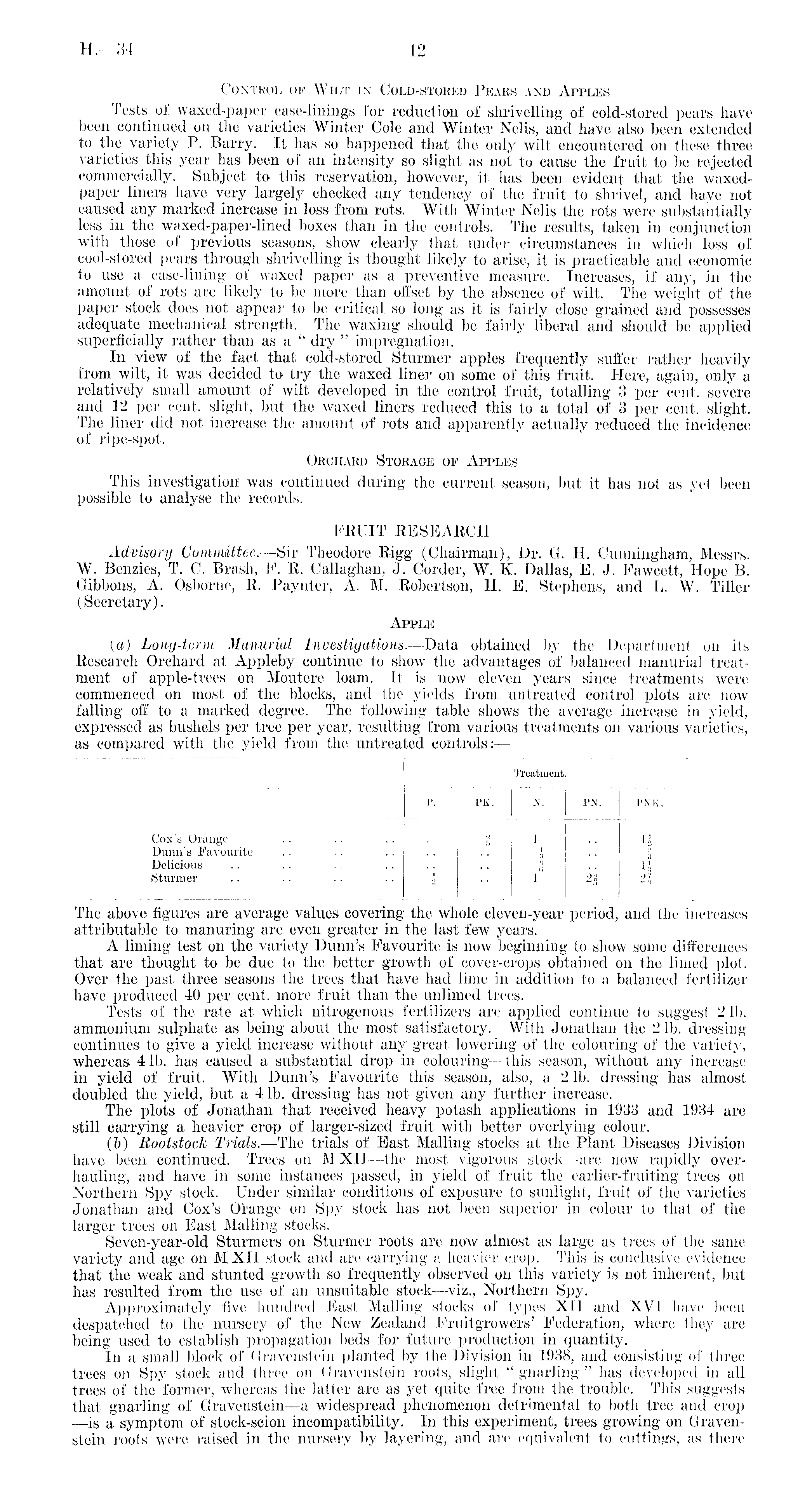 Control of Wilt in Cold-stored Pears and Apples Tests of waxed-paper case-linings for reduction of shrivelling of cold-stored pears have been continued on the varieties Winter Cole and Winter Nelis, and have also been extended to the variety P. Barry. It has so happened that the only wilt encountered on these three varieties this year has been of an intensity so slight as not to cause the fruit to be rejected commercially. Subject to this reservation, however, it has been evident that the waxedpaper liners have very largely checked any tendency of the fruit to shrivel, and have not caused any marked increase in loss from rots. With Winter Nelis the rots were substantially less in the waxed-paper-lined boxes than in the controls. The results, taken in conjunction with those of previous seasons, show clearly that under circumstances in which loss of cool-stored pears through shrivelling is thought likely to arise, it is practicable and economic to use a case-lining of waxed paper as a preventive measure. Increases, if any, in the amount of rots are likely to be more than offset by the absence of wilt. The weight of the paper stock does not appear to be critical so long as it is fairly close grained and possesses adequate mechanical strength. The waxing should be fairly liberal and should be applied superficially rather than as a " dry " impregnation. In view of the fact that cold-stored Sturmer apples frequently suffer rather heavily from wilt, it was decided to try the waxed liner on some of this fruit. Here, again, only a relatively small amount of wilt developed in the control fruit, totalling 3 per cent, severe and 12 per cent, slight, but the waxed liners reduced this to a total of 3 per cent, slight. The liner did not increase the amount of rots and apparently actually reduced the incidence of ripe-spot. Orchard Storage of Apples This investigation was continued during the current season, but it has not as yet been possible to analyse the records. FRUIT RESEARCH Advisory Committee,—Sir Theodore Rigg (Chairman), Dr. G. H. Cunningham, Messrs. W. Benzies, T. C. Brash, F. R. Callaghan, J. Corder, W. K. Dallas, E. J. Fawcett, Hope B. Gibbons, A. Osborne, R. Paynter, A. M. Robertson, H. E. Stephens, and L. W. Tiller (Secretary).