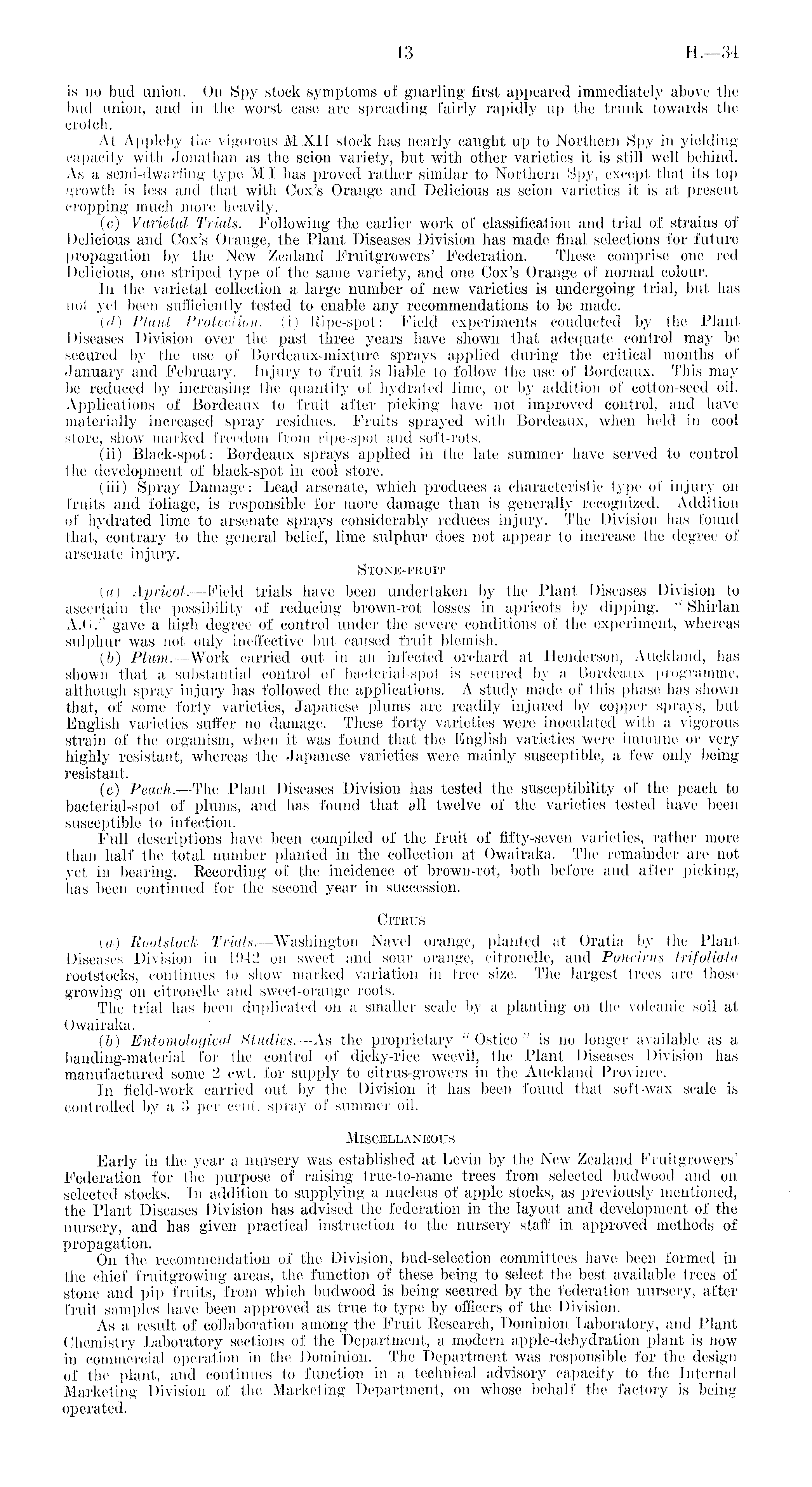 is no bud union. On Spy stock symptoms of gnarling first appeared immediately above the bud union, and in the worst ease are spreading fairly rapidly up the trunk towards the crotch. At Appleby the vigorous M XII stock has nearly caught up to Northern Spy in yielding capacity with Jonathan as the scion variety, but with other varieties it is still well behind. As a semi-dwarfing type M I has proved rather similar to Northern Spy, except that its top growth is less and that with Cox's Orange and Delicious as scion varieties it is at present cropping much more heavily. (c) Varietal Trials. —Following the earlier work of classification and trial of strains of Delicious and Cox's Orange, the Plant Diseases Division has made final selections for future propagation by the New Zealand Fruitgrowers' Federation. These comprise one red Delicious, one striped type of the same variety, and one Cox's Orange of normal colour. In the varietal collection a large number of new varieties is undergoing trial, but has not yet been sufficiently tested to enable any recommendations to be made. (d) Plant Protection.—(i) Ripe-spot: Field experiments conducted by the Plant Diseases Division over the past three years have shown that adequate control may be secured by the use of Bordeaux-mixture sprays applied during the critical months of January and February. Injury to fruit is liable to follow the use of Bordeaux. This may be reduced by increasing the quantity of hydrated lime, or by addition of cotton-seed oil. Applications of Bordeaux to fruit after picking have not improved control, and have materially increased spray residues. Fruits sprayed with Bordeaux, when held in cool store, show marked freedom from ripe-spot and soft-rots. (ii) Black-spot: Bordeaux sprays applied in the late summer have served to control the development of black-spot in cool store. (iii) Spray Damage: Lead arsenate, which produces a characteristic type of injury on fruits and foliage, is responsible for more damage than is generally recognized. Addition of hydrated lime to arsenate sprays considerably reduces injury. The Division lias found that, contrary to the general belief, lime sulphur does not appear to increase the degree of arsenate injury. Stone-fruit (а) Apricot.—Field trials have been undertaken by the Plant Diseases Division to ascertain the possibility of reducing brown-rot losses in apricots by dipping. " Shirlan A.CI." gave a high degree of control under the severe conditions of the experiment, whereas sulphur was not only ineffective but caused fruit blemish. (б) Plum. —Work carried out in an infected orchard at Henderson, Auckland, lias shown that a substantial control of bacterial-spot is secured by a Bordeaux programme, although spray injury has followed the applications. A study made of this phase has shown that, of some forty varieties, Japanese plums are readily injured by copper sprays, but English varieties suffer 110 damage. These forty varieties were inoculated with a vigorous strain of the organism, when it was found that the English varieties were immune or very highly resistant, whereas the Japanese varieties were mainly susceptible, a few only being resistant. (0) Peach.—'The Plant Diseases Division has tested the susceptibility of the peach to bacterial-spot of plums, and has found that all twelve of the varieties tested have been susceptible to infection. Full descriptions have been compiled of the fruit of fifty-seven varieties, rather more than half the total number planted in the collection at Owairaka. The remainder are not yet in bearing. Recording of the incidence of brown-rot, both before and after picking, has been continued for the second year in succession. Citrus (a) Bootstock Trials.—Washington Navel orange, planted at Oratia by the Plant Diseases Division in 1942 011 sweet and sour orange, citronelle, and Pmtcirus trifoliata rootstocks, continues to show marked variation in tree size. The largest trees are those growing 011 citronelle and sweet-orange roots. The trial has been duplicated on a smaller scale by a planting on the volcanic soil at Owairaka. (b) Entomological Studies.—As the proprietary " Ostico "is no longer available as a banding-material for the control of dicky-rice weevil, the Plant Diseases Division has manufactured some 2 cwt. for supply to citrus-growers in the Auckland Province. In field-work carried out by the Division it has been foimd that soft-wax scale is controlled by a 3 per cent, spray of summer oil. Miscellaneous Early in the year a nursery was established at Levin by the New Zealand Fruitgrowers' Federation for the purpose of raising true-to-name trees from selected budwood and 011 selected stocks. 111 addition to supplying a nucleus of apple stocks, as previously mentioned, the Plant Diseases Division has advised the federation in the layout and development of the nursery, and has given practical instruction to the nursery staff in approved methods of propagation. On the recommendation of the Division, bud-selection committees have been formed in the chief fruitgrowing areas, the function of these being to select the best available trees of stone and pip fruits, from which budwood is being secured by the federation nursery, after fruit samples have been approved as true to type by officers of the Division. As a result of collaboration among the Fruit Research, Dominion Laboratory, and Plant Chemistry Laboratory sections of the Department, a modern apple-dehydration plant is now in commercial operation in the Dominion. The Department was responsible for the design of the plant, and continues to function in a technical advisory capacity to the Internal Marketing Division of the Marketing Department, on whose behalf the factory is being operated.