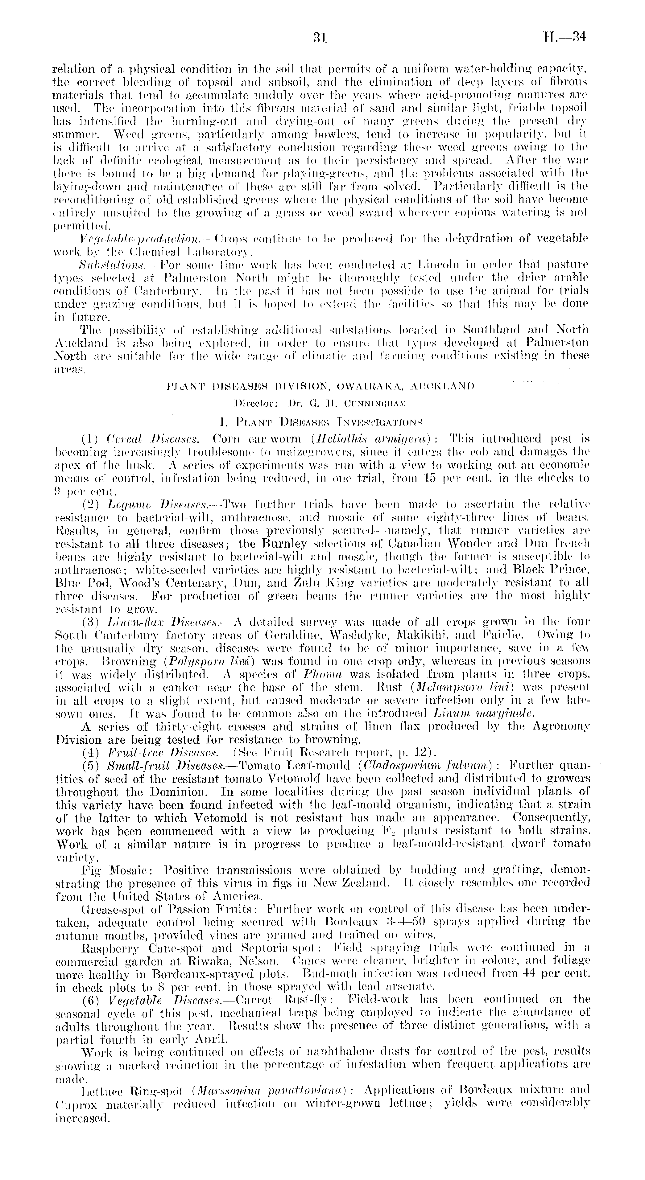 relation of a physical condition in the soil that permits of a uniform water-holding capacity, the correct blending of topsoil and subsoil, and the elimination of deep layers of fibrous materials that tend to accumulate unduly over the years where acid-promoting manures are used. The incorporation into this fibrous material of sand and similar light, friable topsoil has intensified the burning-out and drying-out, of many greens during the present dry summer. Weed greens, particularly among bowlers, tend to increase in popularity, but it is difficult to arrive at a satisfactory conclusion regarding these weed greens owing to the lack of definite ecological, measurement as to their persistency and spread. After the war there is bound to be a big demand for playing-greens, and the problems associated with the laying-down and maintenance of these are still far from solved. Particularly difficult is the reconditioning of old-established greens where the physical conditions of the soil have become entirely unsuited 1o the growing of a grass or weed sward wherever copious watering is not permitted. Vegetable-production.—Crops continue to be produced for the dehydration of vegetable work by the Chemical Laboratory. Substations.-—For some time work has been conducted at Lincoln in order that pasture types selected at Palmerston North might be thoroughly tested under the drier arable conditions of Canterbury. In the past it has not been possible to use the animal for trials under grazing conditions, but it is hoped to extend the facilities so that this may be done in future. The possibility of establishing additional substations located in Southland and North Auckland is also being explored, in order to ensure that types developed at Palmerston North are suitable for the wide range of climatic and farming conditions existing in these areas. PLANT DISEASES DIVISION, OWAIIiAKA, AUCKLAND Director: Dr. G. H. Cunningham I. Plant Diseases Investigations (1) Cereal Diseases.—Com ear-worm (Heliothis armigera) : This introduced pest, is becoming increasingly troublesome to maizegrowers, since it enters the cob and damages the apex of the husk. A series of experiments was run with a view to working out an economic means of control, infestation being reduced, in one trial, from 15 per cent, in the checks to 9 per cent. (2) Legume Diseases. —Two further trials have been made to ascertain the relative resistance to bacterial-wilt, anthracnose, and mosaic of some eighty-three lines of beans. Results, in general, confirm those previously secured —namely, that runner varieties are resistant to all three diseases; the Burnley selections of Canadian Wonder and Dun french beans are highly resistant to bacterial-wilt and mosaic, though the former is susceptible to anthracnose; white-seeded varieties are highly resistant to bacterial-Wilt; and Black Prince, Blue Pod, Wood's Centenary, Dun, and Zulu King varieties are moderately resistant to all three diseases. For production of green beans the runner varieties are the most highly resistant to grow. (3) Linen-flax Diseases.■ —A detailed survey was made of all crops grown in the four South Canterbury factory areas of Geraldine, Washdyke, Makikihi, and Fairlie. Owing to the unusually dry season, diseases were found to be of minor importance, save in a few crops. Browning (Polyspora linti) was found in one crop only, whereas in previous seasons it was widely distributed. A species of Phoma was isolated from plants in three crops, associated with a canker near the base of the stem. Rust (Melampsora. lini) was present in all crops to a slight extent, but caused moderate or severe infection only in a few latesown ones. It was found to be common also on the introduced Linum marginale. A series of thirty-eight crosses and strains of linen flax produced by the Agronomy Division are being tested for resistance to browning. (4) Fruit-tree Diseases. (See Fruit Research report, p. 12). (5) Small-fruit Diseases'.—Tomato Leaf-mould ( Cladosporium fulvum) : Further quantities of seed of the resistant tomato Vetomold have been collected and distributed to growers throughout the Dominion. In some localities during the past season individual plants of this variety have been found infected with the leaf-mould organism, indicating that a strain of the latter to which Vetomold is not resistant has made an appearance. Consequently, work has been commenced with a view to producing F 2 plants resistant to both strains. Work of a similar nature is in progress to produce a leaf-mould-resistant dwarf tomato variety. Fig Mosaic: Positive transmissions were obtained by budding and grafting, demonstrating the presence of this virus in figs in New Zealand. It closely resembles one recorded from the United States of America. Grease-spot of Passion Fruits: Further work on control of this disease has been undertaken, adequate control being secured with Bordeaux 3-4-50 sprays applied during the autumn months, provided vines are pruned and trained on wires. Raspberry Cane-spot and Septoria-spot: Field spraying trials were continued in a commercial garden at Riwaka, Nelson. Canes were cleaner, brighter in colour, and foliage more healthy in Bordeaux-sprayed plots. Bud-moth infection was reduced from 44 per cent, in check plots to 8 per cent, in those sprayed with lead arsenate. (6) Vegetable Diseases.—Carrot Rust-fly: Field-work has been continued on the seasonal cycle of this pest, mechanical traps being employed to indicate the abundance of adults throughout the year. Results show the presence of three distinct generations, with a partial fourth in early April. Work is being continued on effects of naphthalene dusts for control of the pest, results showing a marked reduction in the percentage of infestation when frequent applications are made. Lettuce Ring-spot (Marssonina panattomana) : Applications of Bordeaux mixture and Cuprox materially reduced infection on winter-grown lettuce; yi