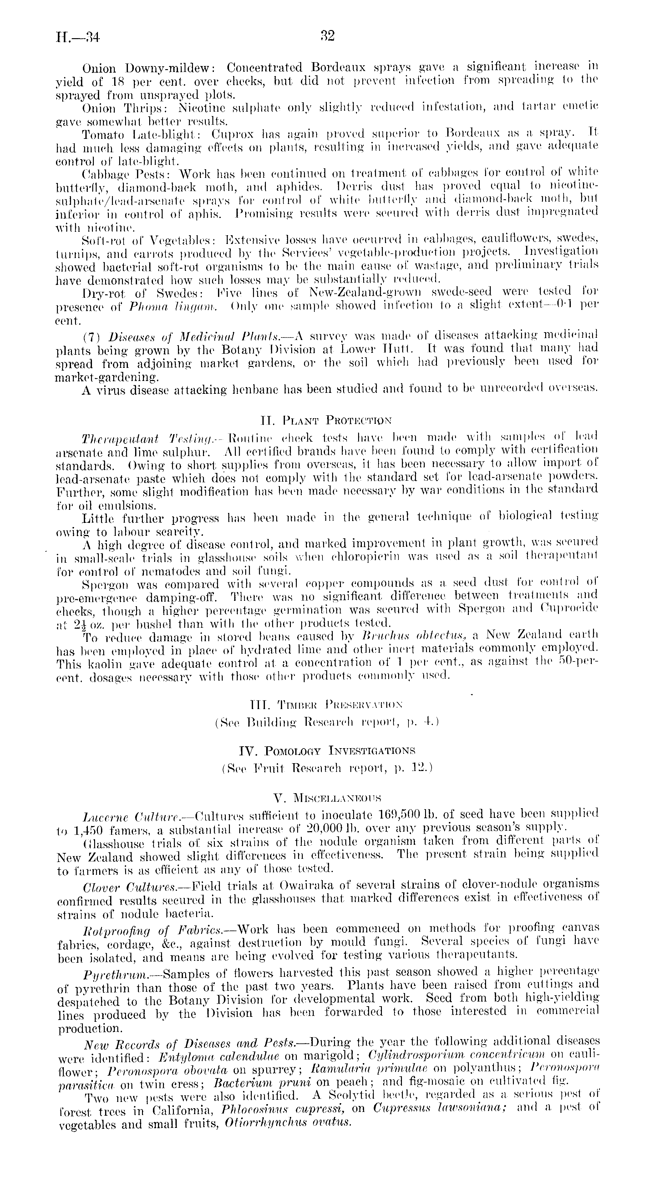 Onion Downy-mildew: Concentrated Bordeaux sprays gave a significant increase in yield of 18 per cent, over cheeks, but did not prevent infection from spreading to the sprayed from unsprayed plots. Onion Thrips: Nicotine sulphate only slightly reduced infestation, and tartar emetic gave somewhat better results. Tomato Late-blight: Cuprox has again proved superior to Bordeaux as a spray. It had much less damaging effects on plants, resulting in increased yields, and gave adequate control of late-blight. Cabbage Pests: Work has been continued on treatment of cabbages for control of white butterfly, diamond-back moth, and aphides. Derris dust has proved equal to nicotine-sulphate/lead-arsenate sprays for control of white butterfly and diamond-back moth, but inferior in control of aphis. Promising results were secured with derris dust impregnated with nicotine. Soft-rot of Vegetables: Extensive losses have occurred in cabbages, cauliflowers, swedes, turnips, and carrots produced by the Services' vegetable-production projects. Investigation showed bacterial soft-rot organisms to be the main cause of wastage, and preliminary trials have demonstrated how such losses may be substantially reduced. Dry-rot of Swedes: Five lines of New-Zealand-grown swede-seed were tested for presence of Phoina lingam. Only one sample showed infection to a slight extent —0-1 per cent. (7) Diseases of Medicinal Plants.—A survey was made of diseases attacking medicinal plants being grown by the Botany Division at Lower Hutt. It was found that many had spread from adjoining market gardens, or the soil which had previously been used for market-gardening. A virus disease attacking henbane has been studied and found to be unrecorded overseas. 11. Plant Protection Th e rap cut ant Testing.—Routine check tests have been made with samples of lead arsenate and lime sulphur. All certified brands have been found to comply with certification standards. Owing to short supplies from overseas, it has been necessary to allow import of lead-arsenate paste which does not comply with the standard set for lead-arsenate powders. Further, some slight modification has been made necessary by war conditions in the standard for oil emulsions. Little further progress has been made in the general technique of biological testing owing to labour scarcity. A high degree of disease control, and marked improvement in plant growth, was secured in small-scale trials in glasshouse soils when ehloropicrin was used as a soil therapeutant for control of nematodes and soil fungi. Spergon was compared witli several copper compounds as a, seed dust for control ol pre-emergence damping-off. There was no significant difference between treatments and checks, though a higher percentage germination was secured with Spergon and Cuprocide at 2| oz. per bushel than with the other products tested. To reduce damage in stored beans caused by Bruchus obtectus, a New Zealand earth has been employed in place of hydrated lime and other inert materials commonly employed. This kaolin gave adequate control at a concentration of 1 per cent,, as against the 50-per-cent, dosages necessary with those other products commonly used. 111. Timber Preservation (See Building Research report, p. 4.) IV. Pomology Investigations (See.Fruit Research report, p. 12.) V. Miscellaneous Lucerne Culture. —Cultures sufficient to inoculate 169,500 lb. of seed have been supplied to 1,450 famers, a substantial increase of 20,000 lb. over any previous season's supply. Glasshouse trials of six strains of the nodule organism taken from different parts of New Zealand showed slight differences in effectiveness. The present strain being supplied to farmers is as efficient as any of those tested. Clover Cultures. —Field trials at Owairaka of several strains of clover-nodule organisms confirmed results secured in the glasshouses that marked differences exist in effectiveness of strains of nodule bacteria. Rot proofing of Faibrics.—Work has been commenced on methods for proofing canvas fabrics, cordage, &c., against destruction by mould fungi. Several species of fungi have been isolated, and means are being evolved for testing various therapeutants. Pyrethrum. —Samples of flowers harvested this past season showed a higher percentage of pyrethrin than those of the past two years. Plants have been raised from cuttings and despatched to the Botany Division for developmental work. Seed from both high-yielding lines produced by the Division has been forwarded to those interested in commercial production. New Records of Diseases and Pests.—During the year the following additional diseases were identified: Entyloma calendulae on marigold; Cylindrosponum concentricum on cauliflower; Peronosporaobovata on spurrey; Ramularia primulae on polyanthus; Peronospora parasitica on twin cress; BcDcterium pruni on peach; and fig-mosaic on cultivated fig. Two new pests were also identified. A Scolytid beetle, regarded as a serious pest of forest trees in California, Phloeosinus cupressi, on Cupressus lawsoniana; and a pest of vegetables and small fruits, Otiorrhynchus ovatus,