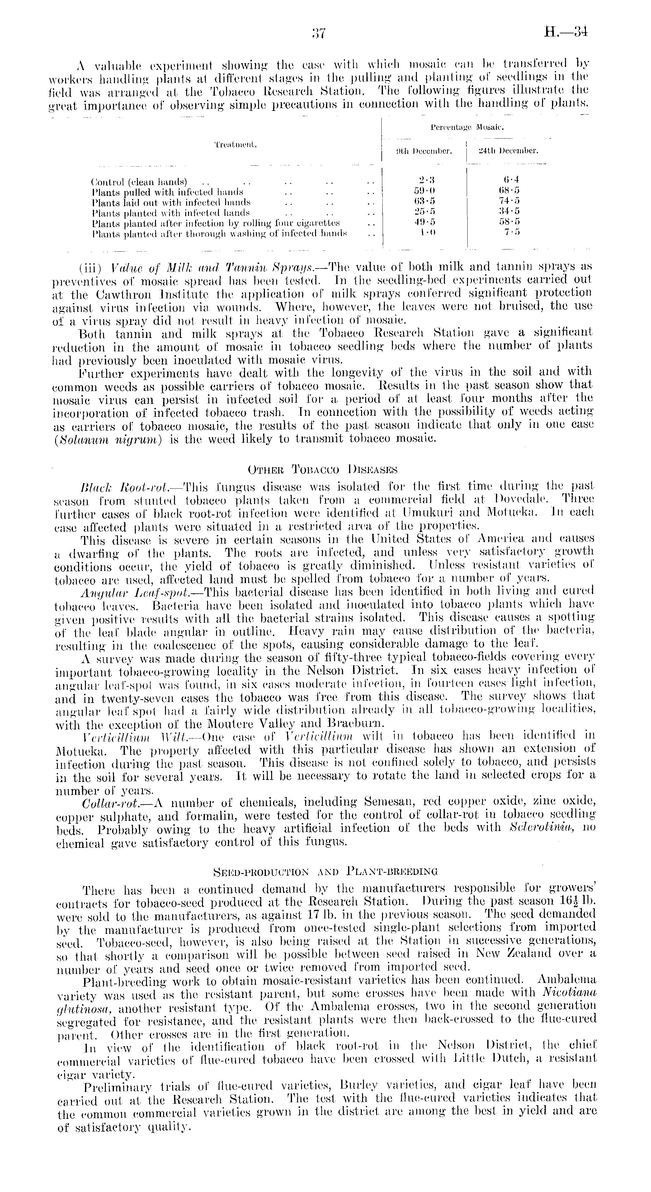 Percentage Mosaic. Treatment. Oth December. 24th December. Control (clean hands) .. .. .. •• •• 2'3 6-4 Plants pulled with infected hands .. . . • ■ 59-0 08-5 Plants laid out with infected hands .. .. .. G3-5 74-5 Plants planted with infected hands .. .. .. 25 • 5 34-5 Plants planted after infection by rolling four cigarettes .. 49-5 68-5 Plants planted after thorough washing of infected hands .. i - 0 7-5