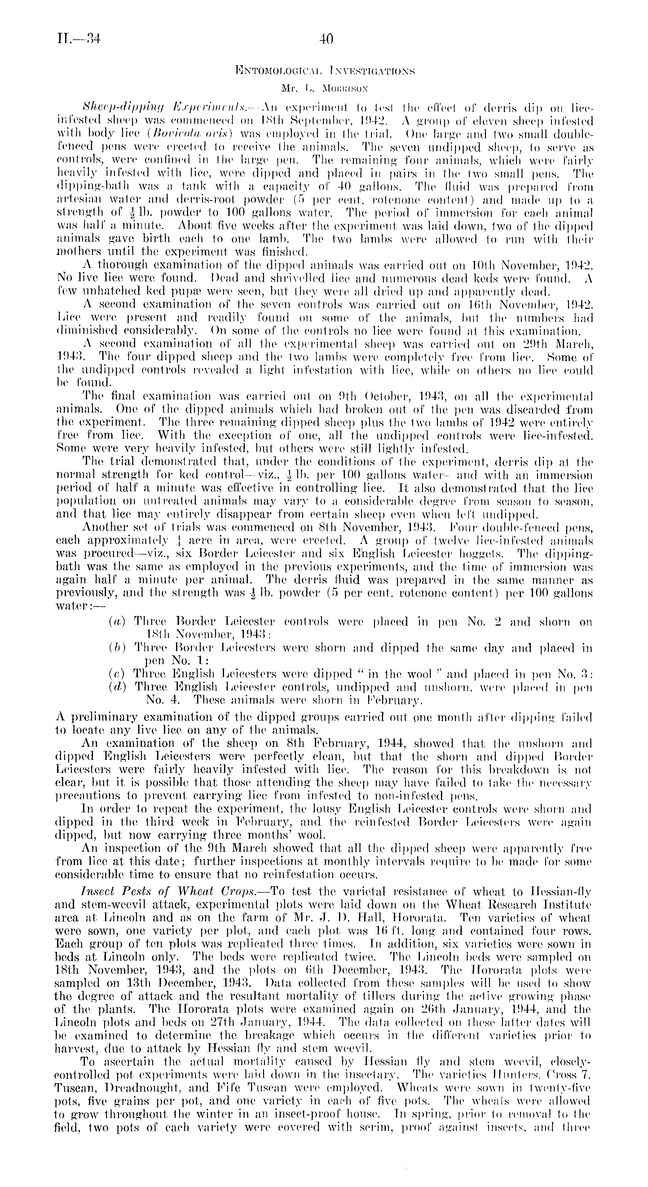 Entomological Investigations Mr. L. Morrison Sheep-dipping Experiments.—An experiment to test the effect of derris dip on liceinfested sheep was commenced on 18th September, 1942. A group of eleven sheep infested with body lice (Bovicola ovis) was employed in the trial. One large and two small doublefenced pens were erected to receive the animals. The seven undipped sheep, to serve as controls, were confined in the large pen. The remaining four animals, which were fairly heavily infested with lice, were dipped and placed in pairs in the two small pens. The dipping-bath was a tank with a capacity of 40 gallons. The fluid was prepared from artesian water and derris-root powder (5 per cent, rotenone content) and made up to a strength of % lb. powder l to 100 gallons water. The period of immersion for each animal was half a minute. About five weeks after the experiment was laid down, two of the dipped animals gave birth each to one lamb. The two lambs were allowed to run with their mothers until the experiment was finished. A thorough examination of the dipped animals was carried out on 10th November, 1042. No live lice were found. Dead and shrivelled lice and numerous dead keds were found. A few unhatched ked pupae were seen, but they were all dried up and apparently dead. A second examination of the seven controls was carried out on 16th November, 1942. Lice were present and readily found on some of the animals, but the numbers had diminished considerably. On some of the controls no lice were found at this examination. A second examination of all the experimental sheep was carried out on 29th March, 1943. The four dipped sheep and the two lambs were completely free from lice. Some of the undipped controls revealed a light infestation with lice, while oil others no lice could be found. The final examination was carried out on 9th October, 1943, on all the experimental animals. One of the dipped animals which had broken out of the pen was discarded from the experiment. The three remaining dipped sheep plus the two lambs of 1942 were entirely free from lice. With the exception of one, all the undipped controls were lice-infested. Some were very heavily infested, but others were still lightly infested. The trial demonstrated that, under the conditions of the experiment, derris dip at the normal strength for ked control—viz., -J 11). per 100 gallons water —and with an immersion period of half a minute was effective in controlling lice. It also demonstrated that the lice population on untreated animals may vary to a considerable degree from season to season, and that lice may entirely disappear from certain sheep even when left undipped. Another set of trials was commenced on Bth November, 1943. Four double-fenced pens, each approximately \ acre in area, were erected. A group of twelve lice-infested animals was procured—viz., six Border Leicester and six English Leicester hoggets. The dippingbath was the same as employed in the previous experiments, and the time of immersion was again half a minute per animal. The derris fluid was prepared in the same manner as previously, and the strength was | lb. powder (5 per cent, rotenone content) per 100 gallons wafer: — («) Three Border Leicester controls were placed in pen No. 2 and shorn on 18th November, 1943: (b) Three Border Leicesters were shorn and dipped the same day and placed in pen No. 1: (c) Three English Leicesters were dipped " in the wool " and placed in pen No. 3: (d) Three English Leicester controls, undipped and unshorn, were placed in pen No. 4. These animals were shorn in February. A preliminary examination of the dipped groups carried out one month after dipping failed to locate any live lice on any of the animals. An examination of the sheep on Bth February, 1944, showed that the unshorn and dipped English Leicesters were perfectly clean, but. that the shorn and dipped Border Leicesters were fairly heavily infested with lice. The reason for this breakdown is not clear, but it is possible that those attending the sheep may have failed to take the necessary precautions to prevent carrying lice from infested to non-infested pens. In order to repeat the experiment, the lousy English Leicester controls were shorn and dipped in the third week in February, and. the reinfested Border Leicesters were again dipped, but now carrying three months' wool. An inspection of the 9th March showed that all the dipped sheep were apparently free from lice at this date; further inspections at monthly intervals require to be made for some considerable time to ensure that no rcinfestation occurs. Insect Pests of Wheat Crops.—To test the varietal resistance of wheat to Hessian-fly and stem-weevil attack, experimental plots were laid down on the Wheat Research Institute area at Lincoln and as on the farm of Mr. J. D. Hall, Hororata. Ten varieties of wheat were sown, one variety per plot, and each plot was 16 ft. long and contained four rows. Each group of ten plots was replicated three times. In addition, six varieties were sown in beds at Lincoln only. The beds were replicated twice. The Lincoln beds were sampled on 18th November, 1943, and the plots on 6th December, 1943. The Hororata plots were sampled on 13th December, 1943. Data collected from these samples will be used to show the degree of attack and the resultant mortality of tillers during the active growing phase of the plants. The Hororata plots were examined again on 26th January, 1944, and the Lincoln plots and beds on 27th January, 1944. The data collected on these latter dates will be examined to determine the breakage which occurs in the different varieties prior to harvest, due to attack by Hessian fly and stem weevil. To ascertain the actual mortality caused by Hessian fly and stem weevil, closelycontrolled pot experiments were laid down in the insectary. The varieties Hunters, Cross 7, Tuscan, Dreadnought, and Fife Tuscan were employed. Wheats were sown in twenty-five pots, fi
