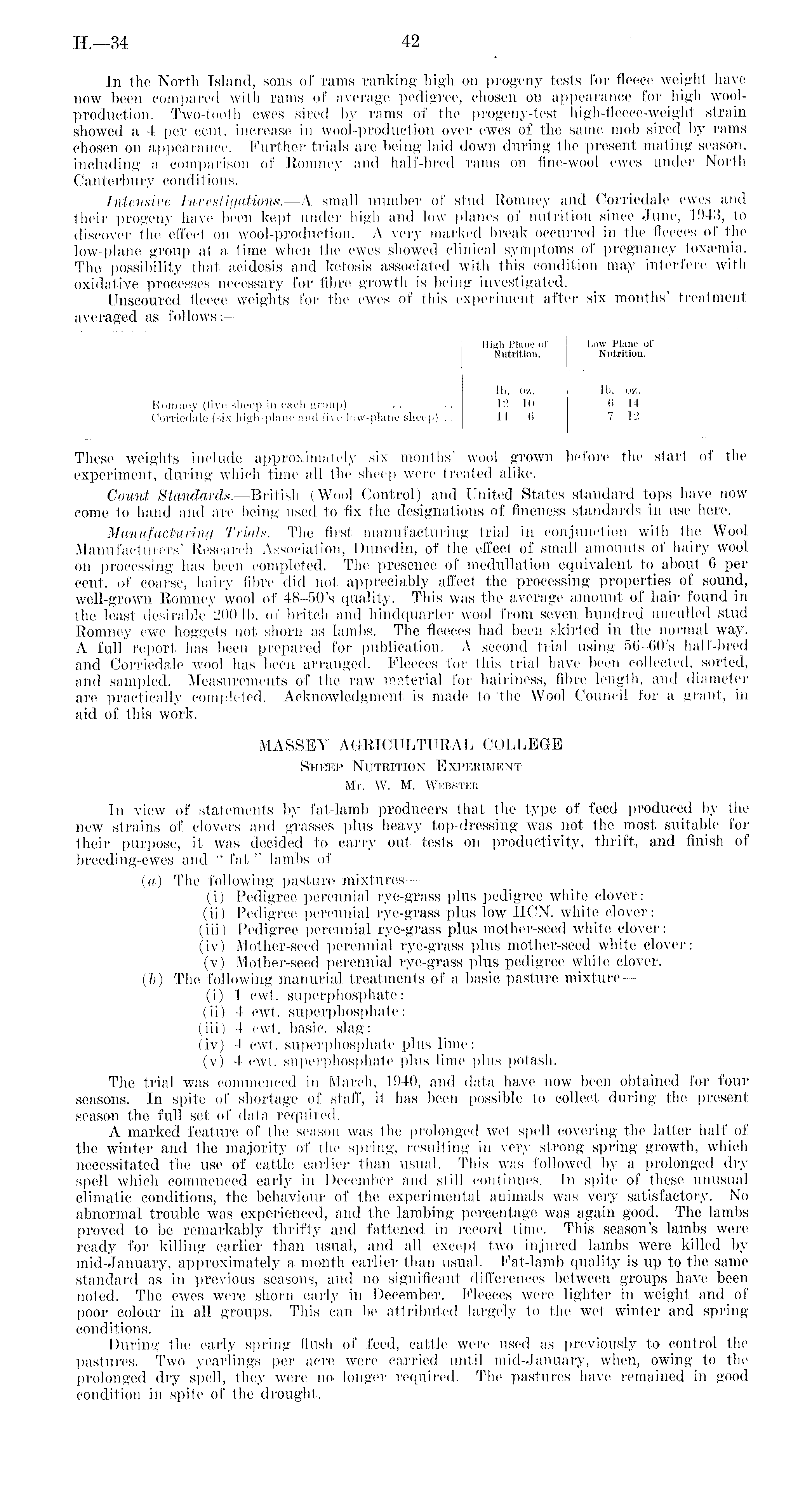These weights include approximately six months' wool grown before the start of the experiment, daring which time all the sheep were treated alike. Count Standards. —British (Wool Control) and United States standard tops have now come to hand and are being used to fix the designations of fineness standards in use here. Manufacturing Trials.—The first manufacturing trial in conjunction with the Wool Manufacturers' Research Association, Dunedin, of the effect of small amounts of hairy wool on processing has been completed. The presence of medullation equivalent to about 6 per cent, of coarse, hairy fibre did not appreciably affect the processing properties of sound, well-grown Romney wool of 48-50's quality. This was the average amount of hair found in the least desirable 2001b. of britch and hindquarter wool from seven hundred unculled stud Romney ewe hoggets not shorn as lambs. The fleeces had been skirted in the normal way. A full report has been prepared for publication. A second trial using 56-60's half-bred and Corriedale wool has been arranged. Fleeces for this trial have been collected, sorted, and sampled. Measurements of the raw material for hairiness, fibre length, and diameter are practically completed. Acknowledgment is made to "the Wool Council for a grant, in aid of this work. MASSBY AGRICULTURAL COLLEGE Sheep Nutrition Experiment Mr. W. M. Webster In view of statements by fat-lamb producers that the type of feed produced by the new strains of clovers and grasses plus heavy top-dressing was not the most suitable for their purpose, it was decided to carry out tests on productivity, thrift, and finish of breeding-ewes and " fat" lambs of— (a) The following pasture mixtures — (i) Pedigree perennial rye-grass plus pedigree white clover: (ii) Pedigree perennial rye-grass plus low HCN. white clover: (iii) Pedigree perennial rye-grass plus mother-seed white clover: (iv) Mother-seed perennial rye-grass plus mother-seed white clover: (v) Mother-seed perennial rye-grass plus pedigree white clover. (b) The following manurial treatments of a basic pasture mixture — (i) 1 cwt. superphosphate: (ii) 4 cwt. superphosphate: (iii) 4 cwt. basic, slag: (iv) 4 cwt, superphosphate plus lime : (v) 4 cwt. superphosphate plus lime plus potash. The trial was commenced in March, 1940, and data have now been obtained for four seasons. In spite of shortage of staff, it has been possible to collect during the present season the full set of data required. A marked feature of the season was the prolonged wet spell covering the latter half of the winter and the majority of the spring, resulting in very strong spring growth, which necessitated the use of cattle earlier than usual. This was followed by a prolonged dry spell which commenced early in December and still continues. In spite of these unusual climatic conditions, the behaviour of the experimental animals was very satisfactory. No abnormal trouble was experienced, and the lambing percentage was again good. The lambs proved to be remarkably thrifty and fattened in record time. This season's lambs were ready for killing earlier than usual, and all except two injured lambs were killed by mid-January, approximately a month earlier than usual. Fat-lamb quality is up to the same standard as in previous seasons, and no significant differences between groups have been noted. The ewes were shorn early in December. Fleeces were lighter in weight and of poor colour in all groups. This can be attributed largely to the wet winter and spring conditions. During the early spring flush of feed, cattle were used as previously to control the pastures. Two yearlings per acre were carried until mid-January, when, owing to the prolonged dry spell, they were no. longer required. The pastures have remained in good condition in spite of the drought.