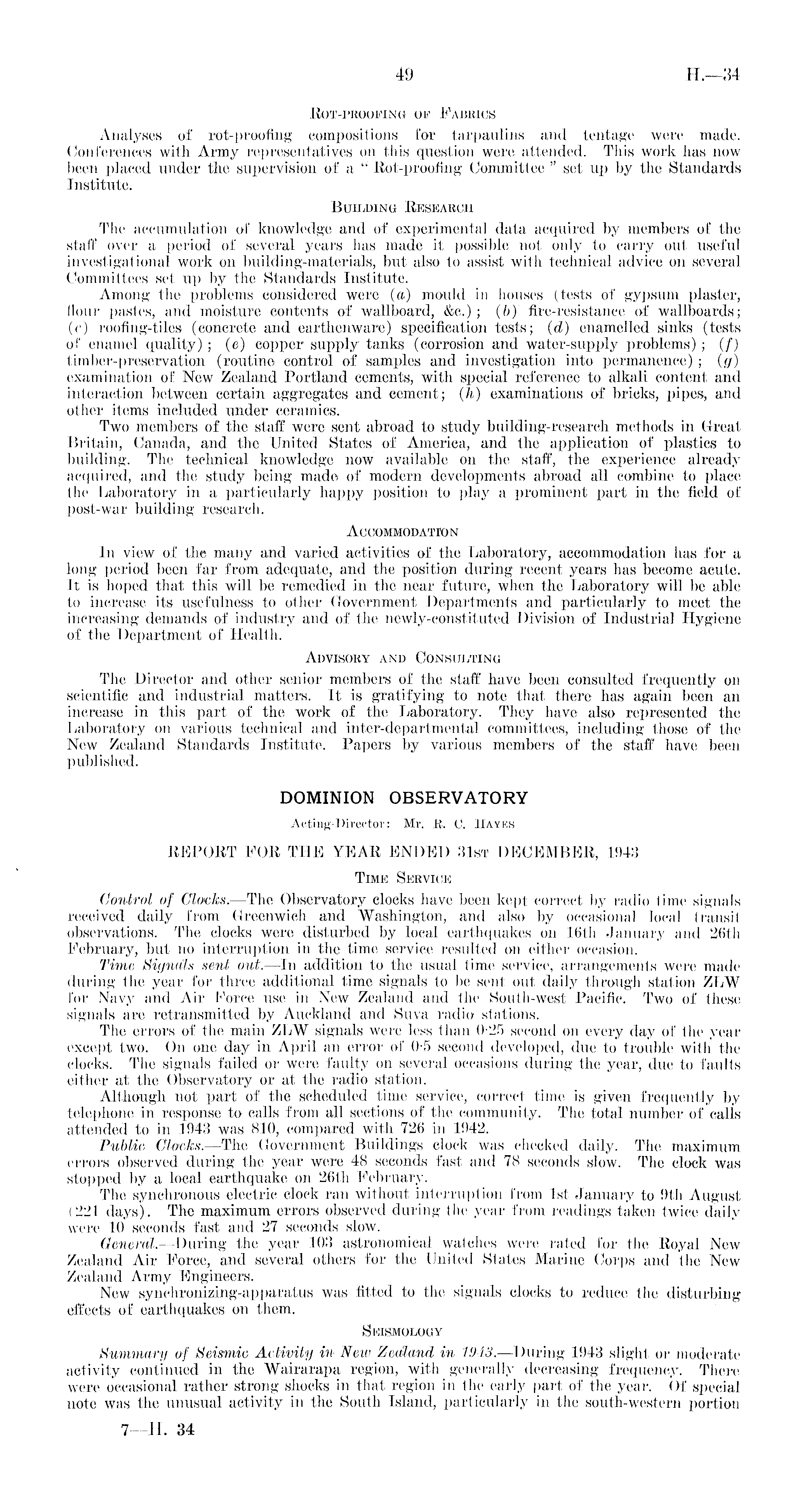 Rot-proofing of Fabrics Analyses of rot-proofing compositions for tarpaulins and tentage were made. Conferences with Army representatives on this question were attended. This work has now been placed under the supervision of a " Rot-proofing Committee " set up by the Standards Institute. Building Research The accumulation of knowledge and of experimental data acquired by members of the staff: over a period of several years has made it possible not only to carry out useful investigational work on building-materials, but also to assist with technical advice on several Committees set up by the Standards Institute. Among the problems considered were (a.) mould in houses (tests of gypsum plaster, flour pastes, and moisture contents of wallboard, &c.) ; (b)' fire-resistance of wallboards; (c) roofing-tiles (concrete and earthenware) specification tests; (d) enamelled sinks (tests of enamel quality); (e) copper supply tanks (corrosion and water-supply problems) ; (/) timber-preservation (routine control of samples and investigation into permanence) ; (g) examination of New Zealand Portland cements, with special reference to alkali content and interaction between certain aggregates and cement; (h) examinations of bricks, pipes, and other items included under ceramics. Two members of the staff were sent abroad to study building-research methods in Great Britain, Canada, and the United States of America, and the application of plastics to building. The technical knowledge now available on the staff, the experience already acquired, and the study being made of modern developments abroad all combine to place the Laboratory in a particularly happy position to play a prominent part in the field of post-war building research. Accommodation In view of the many and varied activities of the Laboratory, accommodation has for a long period been far from adequate, and the position during recent years has become acute. It is hoped that this will be remedied in the near future, when the Laboratory will be able to increase its usefulness to other Government Departments and particularly to meet the increasing demands of industry and of the newly-constituted Division of Industrial Hygiene of the Department of Health. Advisory and Consulting The Director and other senior members of the staff have been consulted frequently on scientific and industrial matters. It is gratifying to note that there has again been an increase in this part of the work of the Laboratory. They have also represented the Laboratory on various technical and inter-departmental committees, including those of the New Zealand Standards Institute. Papers by various members of the staff have been published. DOMINION OBSERVATORY Acting-Director: Mr. E. C. Hayes REPORT FOR THE YEAR ENDED 31st DECEMBER, 1943 Time Service Control of Clocks. —The Observatory clocks have been kept correct by radio time signals received daily from Greenwich and Washington, and also by occasional local transit observations. The clocks were disturbed by local earthquakes on 16tli January and 26th February, but no interruption in the time service resulted on either occasion. Time Signals sent out.—ln addition to the usual time service, arrangements were made during the year for three additional time signals to be sent out daily through station ZLW for Navy and Air Force use in New Zealand and the South-west Pacific. Two of these signals arc retransmitted by Auckland and Suva radio stations. The errors of the main ZLW signals were less than 025 second on every day of the year except two. On one day in April an error of 0-5 second developed, due to trouble with the clocks. The signals failed or were faulty on several occasions during the year, due to faults either at the Observatory or at the radio station. Although not part of the scheduled time service, correct time is given frequently by telephone in response to calls from all sections of the community. The total number of calls attended to in 1943 was 810, compared with 726 in 1942. Public Clocks. —The Government Buildings clock was checked daily. The maximum errors observed during the year were 48 seconds fast and 78 seconds slow. The clock was stopped by a local earthquake on 26th February. The synchronous electric clock ran without interruption from Ist January to 9th August (221 days'). The maximum errors observed during the year from readings taken twice daily were 10 seconds fast and 27 seconds slow. General. —During the year 103 astronomical watches were rated for the Royal New Zealand Air Force, and several others for the United States Marine Corps and the New Zealand Army Engineers. New synchronizing-apparatus was fitted to the signals clocks to reduce the disturbing effects of earthquakes on them. Seismology Summary of Seismic Activity in New Zealand in 1943.—During 1943 slight or moderate activity continued in the Wairarapa region, with generally decreasing frequency. There were occasional rather strong shocks in that region in the early part of the year. Of special note was the unusual activity in the South Island, particularly in the south-western portion