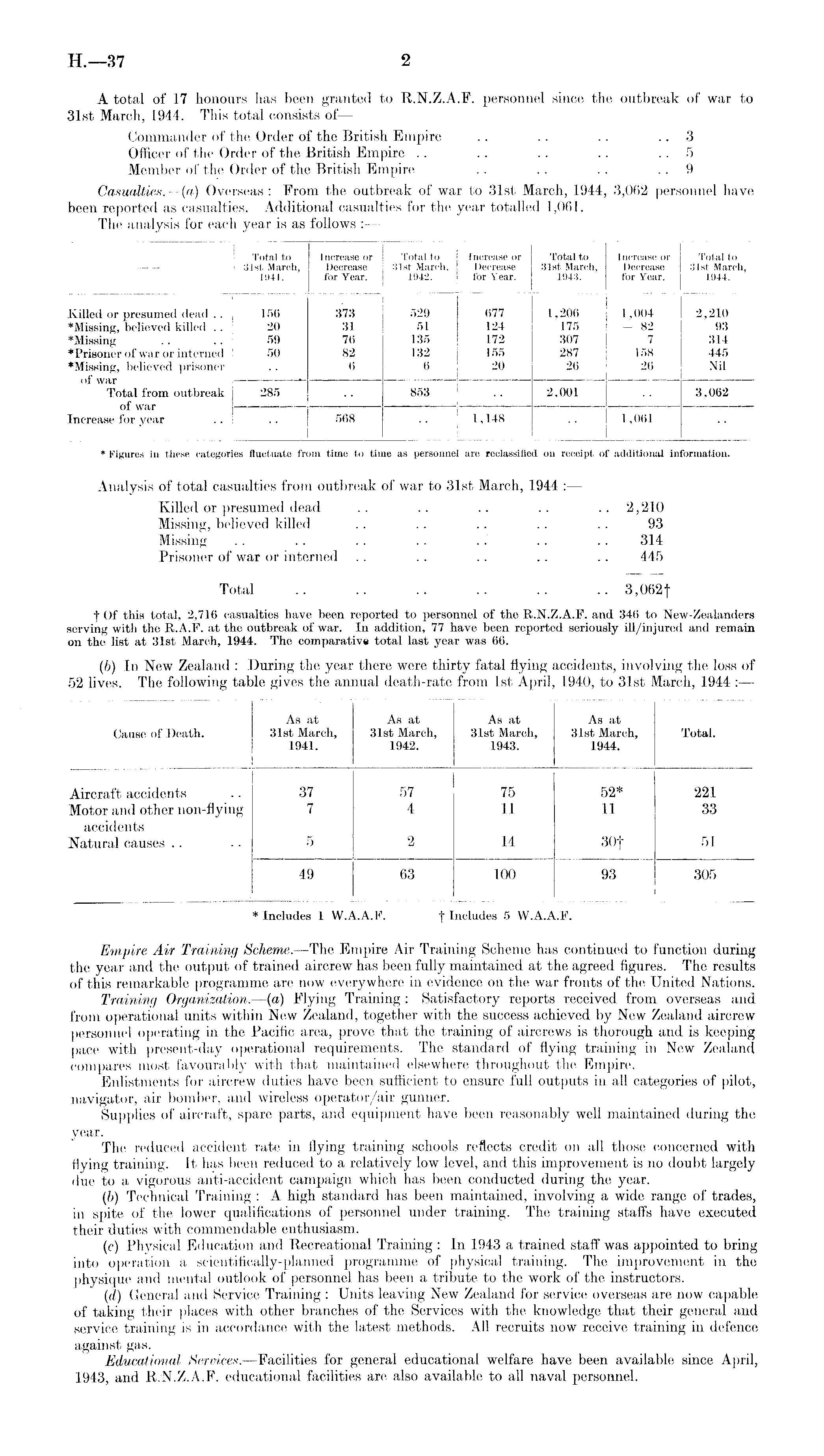 A total of 17 honours has been granted to R.N.Z.A.F. personnel since the outbreak of war to 31st March, 1944. This total consists of — Commander of the Order of the British Empire .. .. .. .. 3 Officer of the Order of the British Empire .. .. . . .. .. 5 Member of the Order of the British Empire .. . . .. . . 9 Casualties. — (a) Overseas : From the outbreak of war to 31st March, 1944, 3,062 personnel have been reported as casualties. Additional casualties for the year totalled 1,061. The analysis for each year is as follows : —