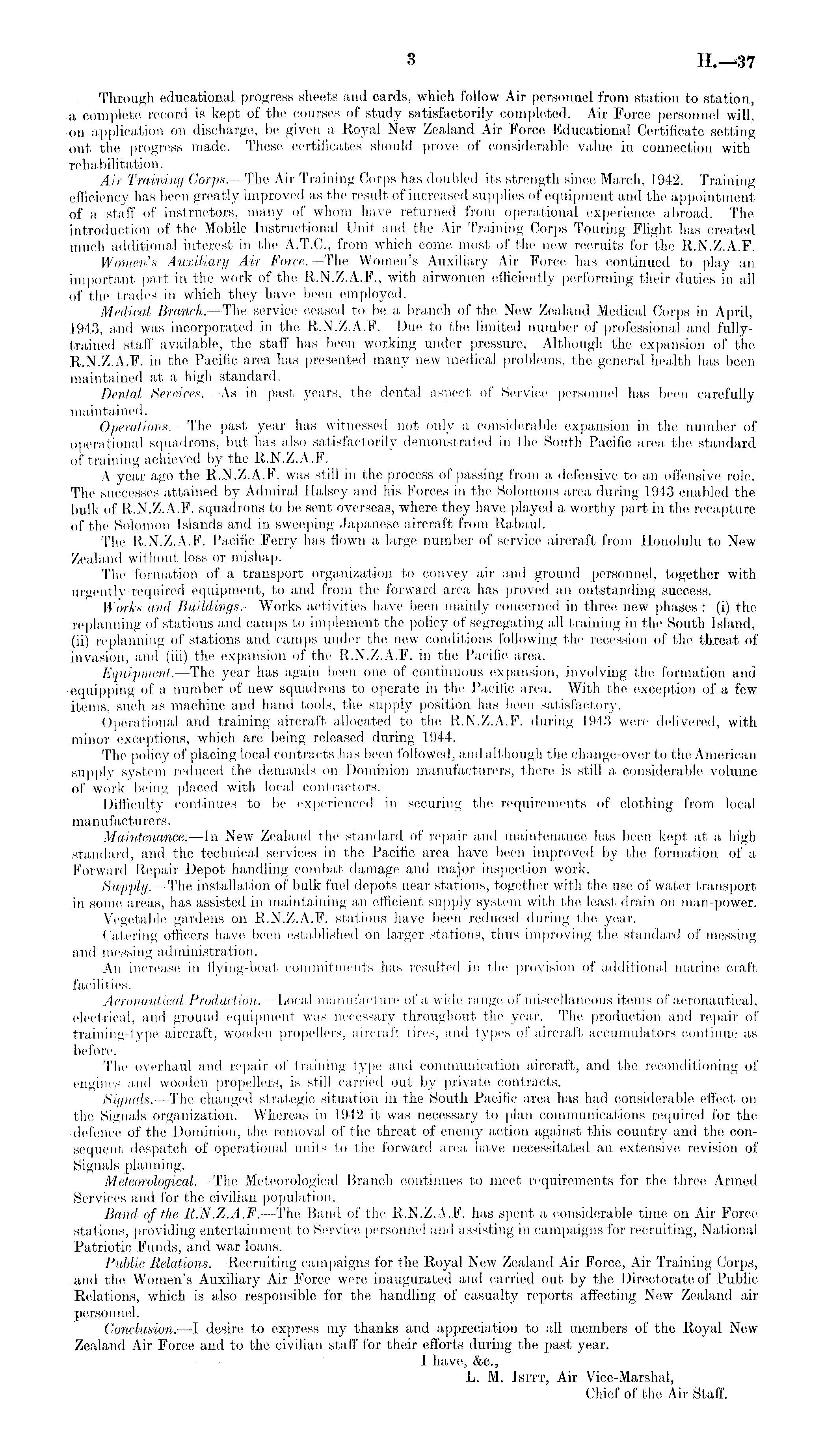 Through educational progress sheets and cards, which follow Air personnel from station to station, a complete record is kept of the courses of study satisfactorily completed. Air Force personnel will, on application on discharge, be given a Royal New Zealand Air Force Educational Certificate setting out the progress made. These certificates should prove of considerable value in connection with rehabilitation. Air Training Corps. —The Air Training Corps has doubled its strength since March, 1942. Training efficiency has been greatly improved as the result of increased supplies of equipment and the appointment of a staff of instructors, many of whom have returned from operational experience abroad. The introduction of the Mobile Instructional Unit and the Air Training Corps Touring Flight has created much additional interest in the A.T.C., from which come most of the new recruits for the R.N.Z.A.F. Women's Auxiliary Air Force. —The Women's Auxiliary Air Force has continued to play an important part in the work of the R.N.Z.A.F., with airwomen efficiently performing their duties in all of the trades in which they have been employed. Medical Branch. —The service ceased to be a branch of the New Zealand Medical Corps in April, 1943, and was incorporated in the R.N.Z.A.F. Due to the limited number of professional and fullytrained staff available, the staff has been working under pressure. Although the expansion of the R.N.Z.A.F. in the Pacific area has presented many new medical problems, the general health has been maintained at a high standard. Dental Services. —As in past years, the dental aspect of Service personnel has been carefully maintained. Operations. —The past year has witnessed not only a considerable expansion in the number of operational squadrons, but has also satisfactorily demonstrated in the South Pacific area the standard of training achieved by the R.N.Z.A.F. A year ago the R.N.Z.A.F. was still in the process of passing from a defensive to an offensive role. The successes attained by Admiral Halsey and his Forces in the Solomons area during 1943 enabled the bulk of R.N.Z.A.F. squadrons to be sent overseas, where they have played a worthy part in the recapture of the Solomon Islands and in sweeping Japanese aircraft from Rabaul. The R.N.Z.A.F. Pacific Ferry has flown a large number of service aircraft from Honolulu to New Zealand without loss or mishap. The formation of a transport organization to convey air and ground personnel, together with urgently-required equipment, to and from the forward area has proved an outstanding success. Works and Buildings.—Works activities have been mainly concerned in three new phases : (i) the replanning of stations and camps to implement the policy of segregating all training in the South Island, (ii) replanning of stations and camps under the new conditions following the recession of the threat of invasion, and (iii) the expansion of the R.N.Z.A.F. in the Pacific area. Equipment. —The year has again been one of continuous expansion, involving the formation and equipping of a number of new squadrons to operate in the Pacific area. With the exception of a few items, such as machine and hand tools, the supply position has been satisfactory. Operational and training aircraft allocated to the R.N.Z.A.F. during 1943 were delivered, with minor exceptions, which are being released during 1944. The policy of placing local contracts has been followed, and although the change-over to the American supply system reduced the demands on Dominion manufacturers, there is still a considerable volume of work being placed with local contractors. Difficulty continues to be experienced in securing the requirements of clothing from local manufacturers. Maintenance. —In New Zealand the standard of repair and maintenance has been kept at a high standard, and the technical services in the Pacific area have been improved by the formation of a Forward Repair Depot handling combat damage and major inspection work. Supply. —The installation of bulk fuel depots near stations, together with the use of water transport in some areas, has assisted in maintaining an efficient supply system with the least drain on man-power. Vegetable gardens on R.N.Z.A.F. stations have been reduced during the year. Catering officers have been established on larger stations, thus improving the standard of messing and messing administration. An increase in flying-boat commitments has resulted in the provision of additional marine craft facilities. Aeronautical Production. —Local manufacture of a wide range of miscellaneous items of aeronautical, electrical, and ground equipment was necessary throughout the year. The production and repair of training-type aircraft, wooden propellers, aircraft tires, and types of aircraft accumulators continue as before. The overhaul and repair of training type and communication aircraft, and the reconditioning of engines and wooden propellers, is still carried out by private contracts. Signals. —The changed strategic situation in the South Pacific area has had considerable effect on the Signals organization. Whereas in 1942 it was necessary to plan communications required for the defence of the Dominion, the removal of the threat of enemy action against this country and the consequent despatch of operational units to the forward area have necessitated an extensive revision of Signals planning. Meteorological. —The Meteorological Branch continues to meet requirements for the three Armed Services and for the civilian population. Band of the R.N.Z.A.F. —The Band of the R.N.Z.A.F. has spent a considerable time on Air Force stations, providing entertainment to Service personnel and assisting in campaigns for recruiting, National Patriotic Funds, and war loans. Public Relations. —Recruiting campaigns for the Royal New Zealand Air Force, Air Training Corps, and the Women's Auxiliary Air Force were inaugurated and carried out by the Direct