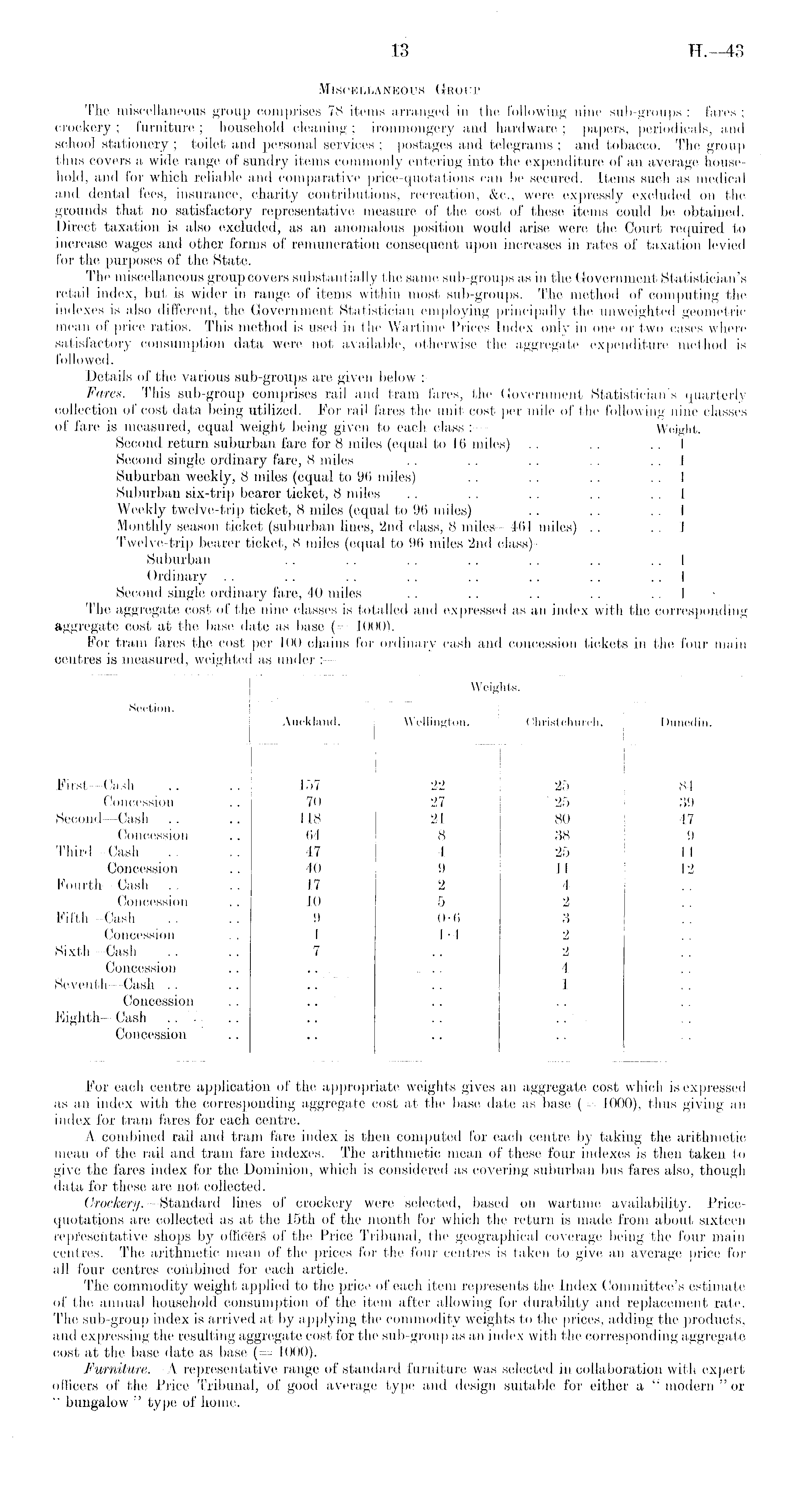 For each centre application of the appropriate weights gives an aggregate cost which is expressed as an index with the corresponding aggregate cost at the base date as base (=-■ 1000), thus giving an index for tram fares for each centre. A combined rail and tram fare index is then computed for each centre by taking the arithmetic mean of the rail and tram fare indexes. The arithmetic mean of the.se four indexes is then taken to give the fares index for the Dominion, which is considered as covering suburban bus fares also, though data for these are not collected. Crockery. Standard lines of crockery were selected, based ou wartime availability. Pricequotations are collected as at the 15th of the month for which the return is made from about sixteen representative shops by officers of the Price Tribunal, the geographical coverage being the four main centres. The arithmetic mean of the prices for the four centres is taken to give an average price for all four centres combined for each article. The commodity weight applied to the price of each item represents the Index Committee's estimate of the annual household consumption of the item after allowing for durability and replacement rate. The sub-group index is arrived at by applying the commodity weights to the prices, adding the products, and expressing the resulting aggregate cost for the sub-group as an index with the corresponding aggregate cost at the base date as base (= 1000). Furniture.- A. representative range of standard furniture was selected in collaboration with expert offioers of the Price Tribunal, of good average type and design suitable for either a " modern " or " bungalow " type of home.