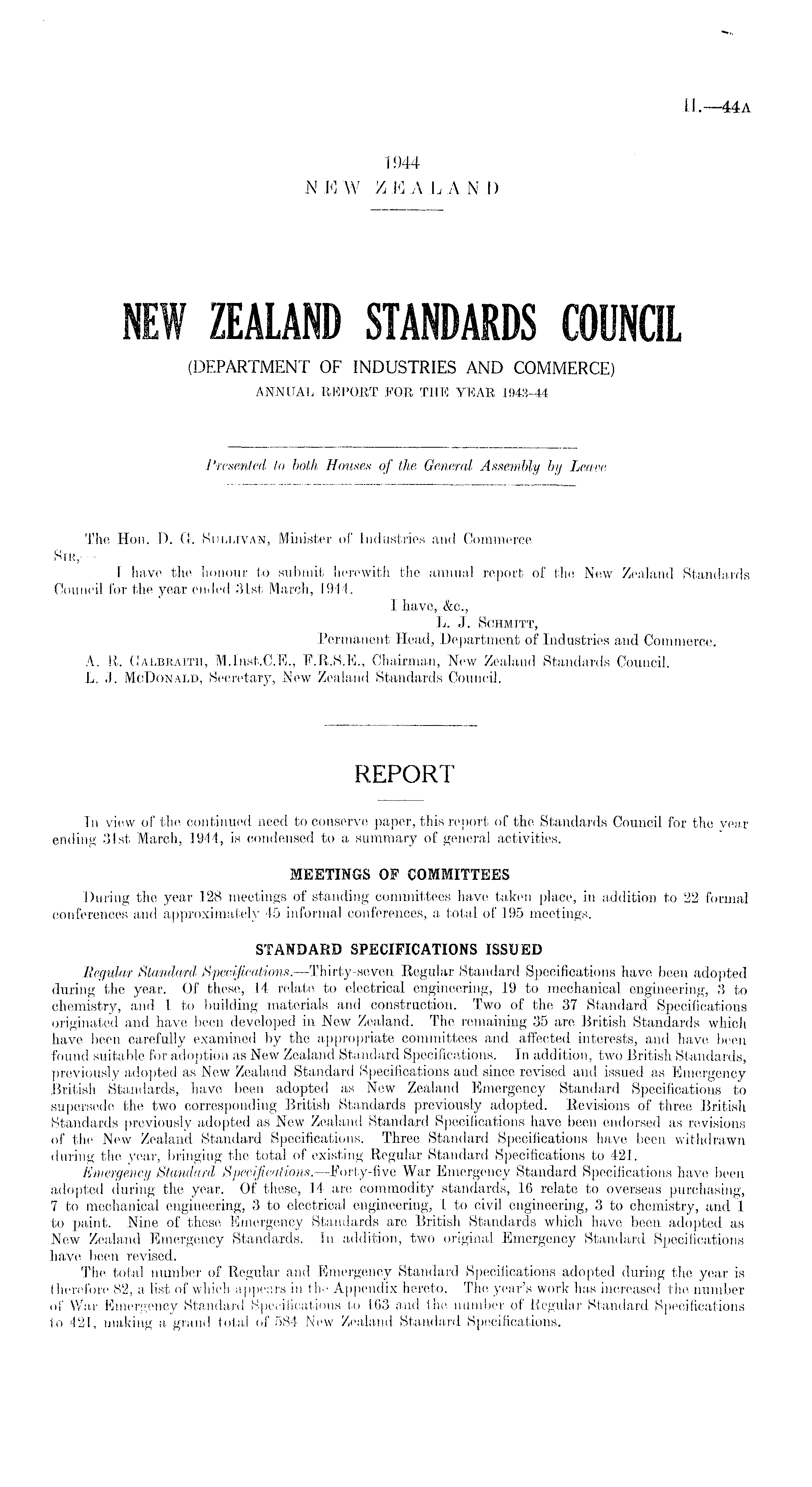 The Hon. D. G. Sullivan, Minister of Industries and Commerce Sir, — I have the honour to submit herewith the annual report of the New Zealand Standards Council for the year ended 31st March, 1944. I have, &c., L. J. Schmitt, Permanent Head, Department of Industries and Commerce. A. R. Galbraith, M.lnst.C.E., F.R.S.E., Chairman, Now Zealand Standards Council. L. J. McDonald, Secretary, New Zealand Standards Council.