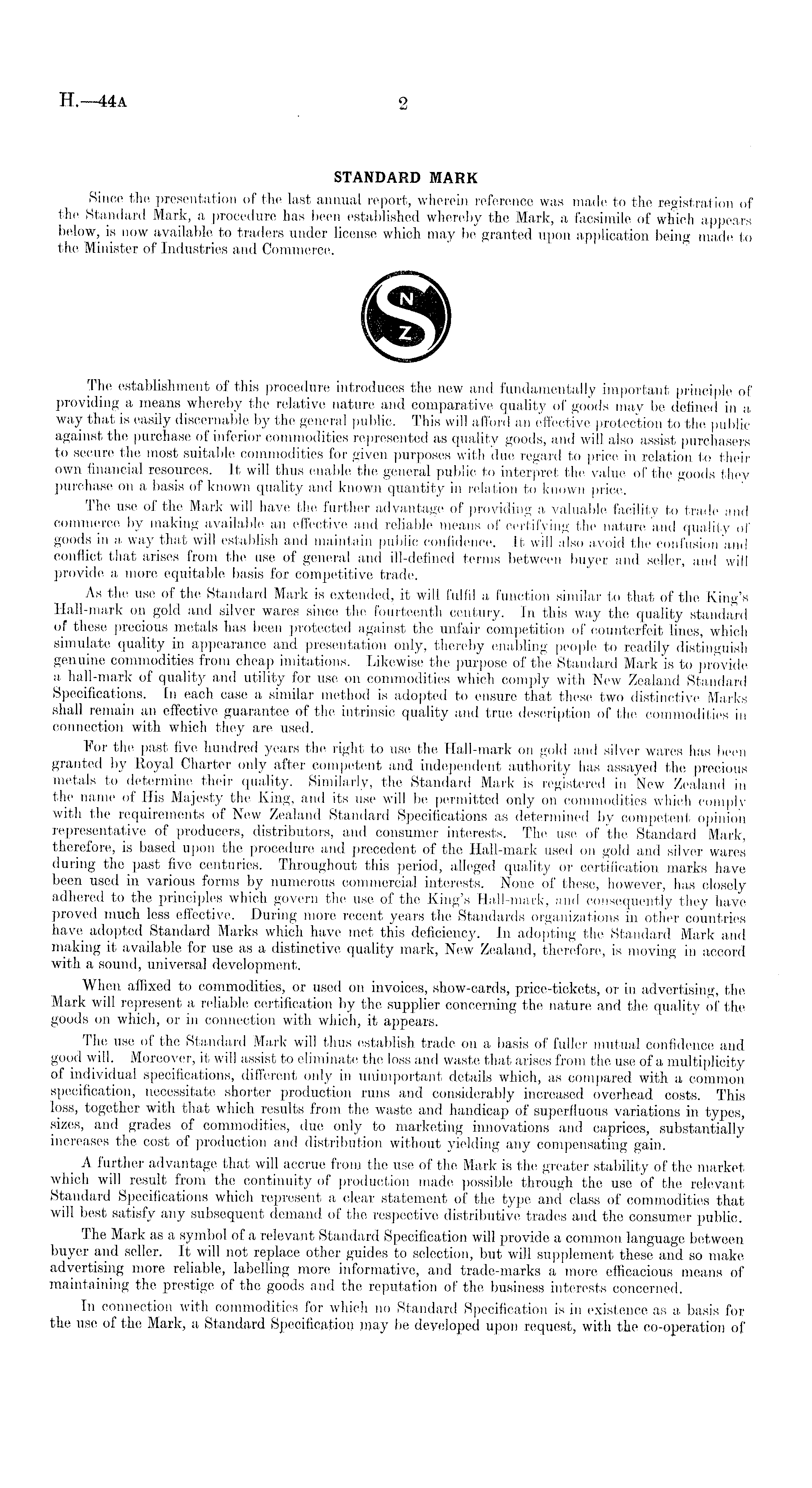The establishment of this procedure introduces the new and fundamentally important principle of a means whereby the relative nature and comparative quality of goods may be defined in a way that is easily discernable by the general public. This will afford an effective protection to the public against the purchase of inferior commodities represented as quality goods, and will also assist purchasers to secure the most suitable commodities for given purposes with "due regard to price in relation to their own financial resources. It will thus enable the general public to interpret the value of the goods they purchase on a basis of known quality and known quantity in relation to known price. The use. of the Mark will have the further advantage of providing a valuable facility to trade and commerce by making available an effective and reliable, means of certifying the nature and quality of goods in a way that will establish and maintain public confidence. It will also avoid the confusion "and conflict that arises from the use of general and ill-defined terms between buyer and seller, and will provide a more equitable basis for competitive trade. As the use of the Standard Mark is extended, it will fulfil a function similar to that of the King's Hall-mark on gold and silver wares since the fourteenth century. In this way the quality standard of these precious metals has been protected against the unfair competition of counterfeit lines, which simulate quality in appearance and presentation only, thereby enabling people to readily distinguish genuine commodities from cheap imitations. Likewise the purpose of the Standard Mark is to provide a hall-ma.rk of quality and utility for use on commodities which comply with New Zealand Standard Specifications. In each case a similar method is adopted to ensure that these two distinctive Marks shall remain an effective guarantee of the intrinsic quality and true description of the commodities in connection with which they are used. For the past five hundred years the right to use the Hall-mark on gold and silver wares has been granted by Royal Charter only after competent and independent authority has assayed the precious metals to determine their quality. Similarly, the Standard Mark is registered in New Zealand in the name of His Majesty the King, and its use will be permitted only on commodities which comply with the requirements of New Zealand Standard Specifications as determined by competent opinion representative of producers, distributors, and consumer interests. The use of the Standard Mark, therefore, is based upon the procedure and precedent of the Hall-mark used on gold and silver wares during the past five centuries. Throughout this period, alleged quality or certification marks have been used in various forms by numerous commercial interests. None of these, however, has closely adhered to the principles which govern the use of the King's Hall-mark, and consequently they have proved much less effective. During more recent years the Standards organizations in other countries have adopted Standard Marks which have met this deficiency. In adopting the Standard Mark and making it available for use as a distinctive quality mark, New Zealand, therefore, is moving in accord with a sound, universal development. When affixed to commodities, or used on invoices, show-cards, price-tickets, or in advertising, the Mark will represent a reliable certification by the supplier concerning the nature and the quality of the goods on which, or in connection with which, it appears. The use of the Standard Mark will thus establish trade on a basis of fuller mutual confidence and good will. Moreover, it will assist to eliminate the loss and waste that arises from the use of a multiplicity of individual specifications, different only in unimportant details which, as compared with a common specification, necessitate shorter production runs and considerably increased overhead costs. This loss, together with that which results from the waste and handicap of superfluous variations in types, sizes, and grades of commodities, due only to marketing innovations and caprices, substantially increases the cost of production and distribution without yielding any compensating gain. A further advantage that will accrue from the use of the Mark is the greater stability of the market which will result from the continuity of production made possible through the use of the relevant Standard Specifications which represent a clear statement of the type and class of commodities that will best satisfy any subsequent demand of the respective distributive trades and the consumer public. The Mark as a symbol of a relevant Standard Specification will provide a common language between buyer and seller. It will not replace other guides to selection, but will supplement these and so make advertising more reliable, labelling more informative, and trade-marks a more efficacious means of maintaining the prestige of the goods and the reputation of the business interests concerned. In connection with commodities for which no Standard Specification is in existence as a basis for the use of the Mark, a Standard Specification may be developed upon request, with the co-operation of