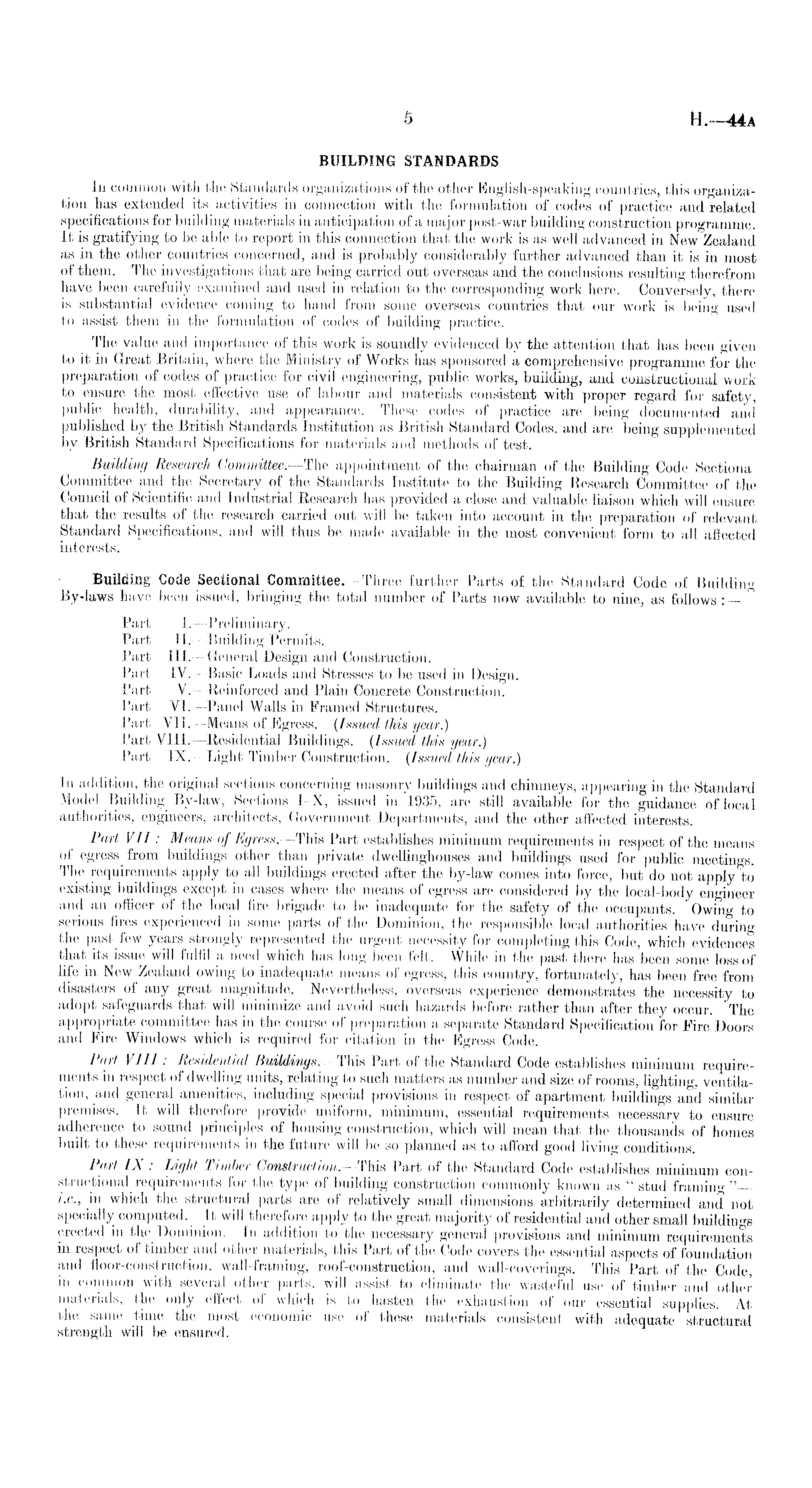 BUILDING STANDARDS in common with the Standards organizations of the other English-speaking countries, this organization has extended its activities in connection with the formulation of codes of practice and related specifications for building materials in anticipation of a major post-war building construction programme. It is gratifying to be able to report in this connection that the work is as well advanced in New Zealand as in the other countries concerned, and is probably considerably further advanced than it is in most of them. The investigations that are being carried out overseas and the conclusions resulting therefrom have been carefully examined and used in relation to the corresponding work here. Conversely, there is substantial evidence coming to hand from some overseas countries that our work is being used to assist them in the formulation of codes of building practice. The value and importance of this work is soundly evidenced by the attention that has been given to it in Great Britain, where the Ministry of Works has sponsored a comprehensive programme for the preparation of codes of practice for civil engineering, public works, building, and constructional work to ensure the most effective use of labour and materials consistent with proper regard for safety, public health, durability, and appearance. These codes of practice are being documented and published by the British Standards Institution as British Standard Codes, and are being supplemented by British Standard Specifications for materials and methods of test. Building Research Committee.—The appointment of the chairman of the Building Code Sectiona Committee and the Secretary of the Standards Institute to the Building Research Committee of the Council of Scientific and Industrial Research has provided a close and valuable liaison which will ensure that the results of the research carried out will be taken into account in the preparation of relevant Standard Specifications, and will thus be made available in the most convenient form to all affected interests. Building Code Sectional Committee.—Three further Parts of the Standard Code of Building By-laws have been issued, bringing the total number of Parts now available to nine, as follows:— ° Part I. —Preliminary. Part ll.—Building Permits. Part lll.—General Design and Construction. Part IV. —Basic Loads and Stresses to be used in Design. Part Y. —Reinforced and Plain Concrete Construction. Part VI. —Panel Walls in Framed Structures. Part VII. —Means of Egress. (Issued this year.) Part Vlll.—Residential Buildings. (Issued this year.) Part IX.—Light Timber Construction. (Issued this year.) In addition, the original sections concerning masonry buildings and chimneys, appearing in the Standard Model Building By-law, Sections I-X, issued in 1935, are still available for the guidance of local authorities, engineers, architects, Government Departments, and the other affected interests. Part VII: Means of Egress.—This Part establishes minimum requirements in respect of the means of egress from buildings other than private dwellinghouses and buildings used for public meetings. The requirements apply to all buildings erected after the by-law comes into force, but do not apply to existing buildings except in cases where the means of egress are considered by the local-body engineer and an officer of the local fire brigade to be inadequate for the safety of the occupants. Owing to serious fires experienced in some parts of the Dominion, the responsible local authorities have during the past few years strongly represented the urgent necessity for completing this Code, which evidences that its issue will fulfil a need which has long been felt. While in the past there has been some loss of life in New Zealand owing to inadequate means of egress, this country, fortunately, has been free from disasters of any great magnitude. Nevertheless, overseas experience demonstrates the necessity to adopt safeguards that will minimize and avoid such hazards before rather than after they occur. The appropriate committee has in the course of preparation a separate Standard Specification for Fire Doors and Fire Windows which is required for citation in the Egress Code. I art VIII. Residential Buildings, this Part of the Standard Code establishes minimum requirements in respect of dwelling units, relating to such matters as number and size of rooms, lighting, ventilation, and general amenities, including special provisions in respect of apartment buildings and similar premises. It will therefore provide uniform, minimum, essential requirements necessary to ensure adherence to sound principles of housing construction, which will mean that the thousands of homes built to these requirements in the future will be so planned as to afford good living conditions. Part IA . Light Timbev (construction. This Part of the Standard Code establishes minimum constructional requirements for the type of building construction commonly known as " stud framin"' " i.e., in. which the structural parts are of relatively small dimensions arbitrarily determined and not specially computed. _ It will therefore apply to the great majority of residential and other small buildings erected in the Dominion. In addition to the necessary general provisions and minimum requirements m respect ol timber and other materials, this Part of the Code covers the essential aspects of foundation and floor-construction, wall-framing, roof-construction, and wall-coverings. This Part of the Code, in common with several other parts, will assist to eliminate the wasteful use of timber and other materials, the only effect of which is to hasten the exhaustion of our essential supplies. At the same time the most economic use ol: these materials consistent with adequate structural strength will be ensured.