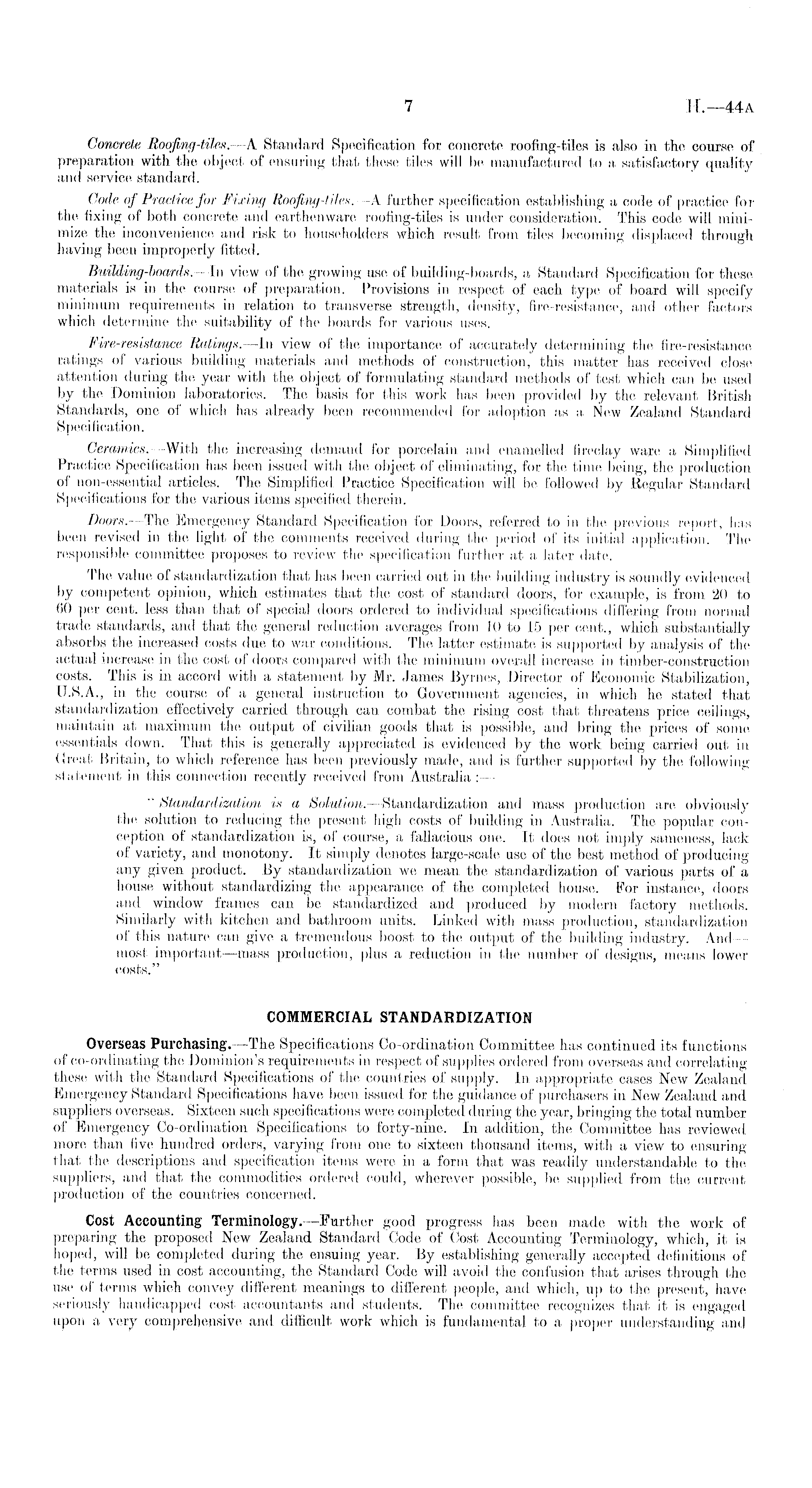 Concrete Roofing-tiles.—A Standard Specification for concrete roofing-tiles is also in the course of preparation with the object of ensuring that these tiles will be manufactured to a satisfactory quality and service standard. Code of Practice for Fixing Roofing-tiles.—A further specification establishing a code of practice for the fixing of both concrete and earthenware roofing-tiles is under consideration. This code will minimize the inconvenience and risk to householders which result from tiles becoming displaced through having been improperly fitted. Building-boards.—ln view of the growing use of building-boards, a Standard Specification for these materials is in the course of preparation. Provisions in respect of each type of board will specify minimum requirements in relation to transverse strength, density, fire-resistance, and other factors which determine the suitability of the boards for various uses. Fire-resistance Ratings.—ln view of the importance of accurately determining the fire-resistance ratings of various building materials and methods of construction, this matter has received close attention during the year with the object of formulating standard methods of test which can be used by the Dominion laboratories. The basis for this work has been provided by the relevant British Standards, one of which has already been recommended for adoption as a New Zealand Standard Specification. Ceramics. —With the increasing demand for porcelain and enamelled fireclay ware a Simplified Practice Specification has been issued with the object of eliminating, for the time being, the production of non-essential articles. The Simplified Practice Specification will be followed by Regular Standard Specifications for the various items specified therein. Doors. —The Emergency Standard Specification for Doors, referred to in the previous report, has been revised in the light of the comments received during the period of its initial application. The responsible committee proposes to review the specification further at a later date. The value of standardization that has been carried out in the building industry is soundly evidenced by competent opinion, which estimates that the cost of standard doors, for example, is from '20 to 60 per cent, less than that of special doors ordered to individual specifications differing from normal trade standards, and that the general reduction averages from 10 to 15 per cent., which substantially absorbs the increased costs due to war conditions. The latter estimate is supported by analysis of the actual increase in the cost of doors compared with the minimum overall increase in timber-construction costs. This is in accord with a statement by Mr. James Byrnes, Director of Economic Stabilization, U.S.A., in the course of a general instruction to Government agencies, in which he stated that standardization effectively carried through can combat the rising cost that threatens price ceilings, maintain at maximum the output of civilian goods that is possible, and bring the prices of some essentials down. That this is generally appreciated is evidenced by the work being carried out in Great Britain, to which reference has been previously made, and is further supported by the following statement in this connection recently received from Australia : — " Standardization is a Solution.—-Standardization and mass production are obviously the solution to reducing the present high costs of building in Australia. The popular conception of standardization is, of course, a fallacious one. It does not imply sameness, lack of variety, and monotony. It simply denotes large-scale use of the best method of producing any given product. By standardization we mean the standardization of various parts of a house without standardizing the appearance of the completed house. For instance, doors and window frames can be standardized and produced by modern factory methods. Similarly with kitchen and bathroom units. Linked with mass production, standardization of this nature can give a tremendous boost to the output of the building industry. And— most important—mass production, plus a reduction in the number of designs, means lower costs." COMMERCIAL STANDARDIZATION Overseas Purchasing.—The Specifications Co-ordination Committee has continued its functions of co-ordinating the Dominion's requirements in respect of supplies ordered from overseas and correlating these with the Standard Specifications of the countries of supply. In appropriate cases New Zealand Emergency Standard Specifications have been issued for the guidance of purchasers in New Zealand and suppliers overseas. Sixteen such specifications were completed during the year, bringing the total number of Emergency Co-ordination Specifications to forty-nine. In addition, the Committee has reviewed more than five hundred orders, varying from one to sixteen thousand items, with a view to ensuring that the descriptions and specification items were in a form that was readily understandable to the suppliers, and that the commodities ordered could, wherever possible, be supplied from the current production of the countries concerned. Cost Accounting Terminology.—Further good progress has been made with the work of preparing the proposed New Zealand Standard Code of Cost Accounting Terminology, which, it is hoped, will be completed during the ensuing year. By establishing generally accepted definitions of the terms used in cost accounting, the Standard Code will avoid the confusion that arises through the use of terms which convey different meanings to different people, and which, up to the present, have seriously handicapped cost accountants and students. The committee recognizes that it is engaged upon a very comprehensive and difficult work which is fundamental to a proper understanding and