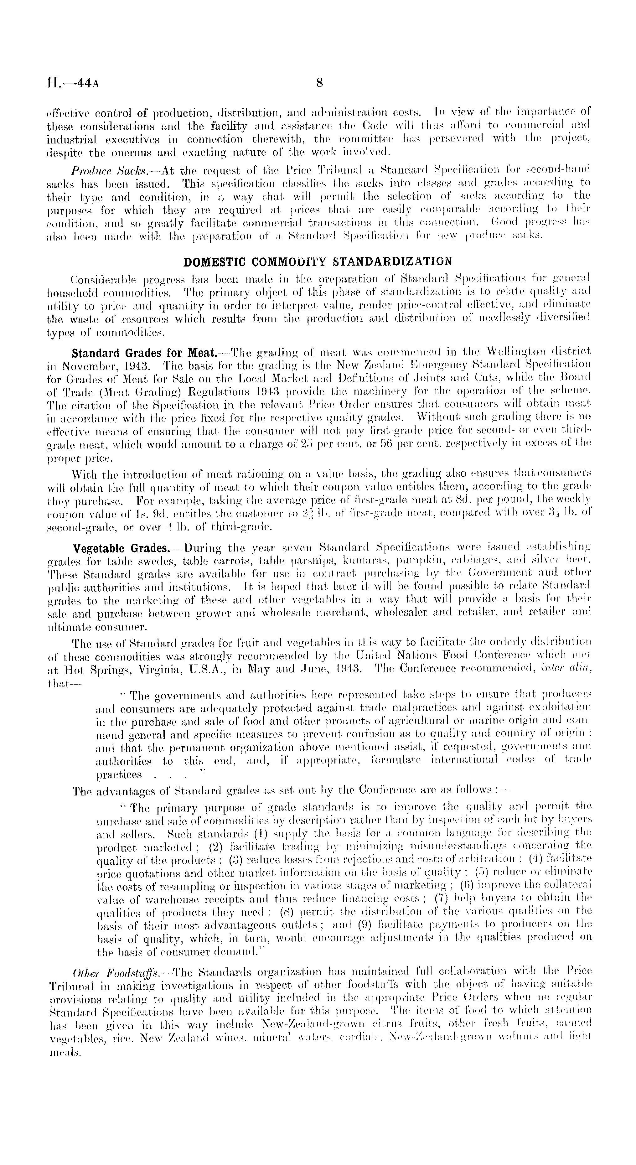 effective control of production, distribution, and administration costs. In view of the importance of these considerations and the facility and assistance the Code will thus afford to commercial and industrial executives in connection therewith, the committee has persevered with the project, despite the onerous and exacting nature of the work involved. Produce Sacks.—At the request of the Price Tribunal a Standard Specification for second-hand sacks has been issued. This specification classifies the sacks into classes and grades according to their type and condition, in a way that will permit the selection of sacks according to the purposes for which they are required at prices that are easily comparable according to their condition, and so greatly facilitate commercial transactions in this connection. Good progress has also been made with the preparation of a Standard Specification for new produce sacks. * DOMESTIC COMMODITY STANDARDIZATION Considerable progress has been made in the preparation of Standard Specifications for general household commodities. The primary object of this phase of standardization is to relate quality and utility to price and quantity in order to interpret value, render price-control effective, and eliminate the waste of resources which results from the production and distribution of needlessly diversified types of commodities. Standard Grades for Meat.—The grading of meat was commenced in the Wellington district in November, 1943. The basis for the grading is the New Zealand Emergency Standard Specification for Grades of Meat for Sale on the Local Market and Definitions of Joints and Cuts, while the Board of Trade (Meat Grading) Regulations 1943 provide the machinery for the operation of the scheme. The citation of the Specification in the relevant Price Order ensures that consumers will obtain meat in accordance with the price fixed for the respective quality grades. Without such grading there is no effective means of ensuring that the consumer will not pay first-grade price for second- or even thirdgrade meat, which would amount to a charge of 25 per cent, or 56 per cent, respectively in excess of the proper price. With the introduction of meat rationing on a value basis, the grading also ensures that consumers will obtain the full quantity of meat to which their coupon value entitles them, according to the grade they purchase. For example, taking the average price of first-grade meat at Bd. per pound, the weekly coupon value of Is. 9d. entitles the customer to 2f lb. of first-grade meat, compared with over 3£ lb. of second-grade, or over 4 lb. of third-grade. Vegetable Grades. —During the year seven Standard Specifications were issued establishing grades for table swedes, table carrots, table parsnips, kumaras, pumpkin, cabbages, and silver beet. These Standard grades are available for use in contract purchasing by the Government and other public authorities and institutions. It is hoped that later it will be found possible to relate Standard grades to the marketing of these and other vegetables in a way that will provide a basis for their sale and purchase between grower and wholesale merchant, wholesaler and retailer, and retailer and ultimate consumer. The use of Standard grades for fruit and vegetables in this way to facilitate the orderly distribution of these commodities was strongly recommended by the United Nations Food Conference which met at Hot Springs, Virginia, U.S.A., in May and June, 1943. The Conference recommended, inter alia, that— " The governments and authorities here represented take steps to ensure that producers and consumers are adequately protected against trade malpractices and against exploitation in the purchase and sale of food and other products of agricultural or marine origin and commend general and specific measures to prevent confusion as to quality and country of origin; and that the permanent organization, above mentioned assist, if requested, governments and authorities to this end, and, if appropriate, formulate international codes of trade practices ..." The advantages of Standard grades as set out by the Conference are as follows " The primary purpose of grade standards is to improve the quality and permit the purchase and sale of commodities by description rather than by inspection of each lot by buyers and sellers. Such standards (1) supply the basis for a common language for describing the product marketed ; (2) facilitate trading by minimizing misunderstandings concerning the quality of the products ; (3) reduce losses from rejections and costs of arbitration ; (4) facilitate price quotations and other market information on the basis of quality ; (5) reduce or eliminate the costs of resampling or inspection in various stages of marketing ; (6) improve the collateral value of warehouse receipts and thus reduce financing costs ; (7) help buyers to obtain the qualities of products they need ; (8) permit the distribution of the various qualities on the basis of their most advantageous outlets ; and (9) facilitate payments to producers on the basis of quality, which, in turn, would encourage adjustments in the qualities produced on the basis of consumer demand." Other Foodstuffs. —The Standards organization has maintained full collaboration with the Price Tribunal in making investigations in respect of other foodstuffs with the object of having suitable provisions relating to quality and utility included in the appropriate Price Orders when no regular Standard Specifications have been available for this purpose. The items of food to which attention has been given in this way include New-Zealand-grown citrus fruits, other fresh fruits, canned vegetables, rice, New Zealand wines, mineral waters, cordials, New-Zealand-grown walnuts and light meals.