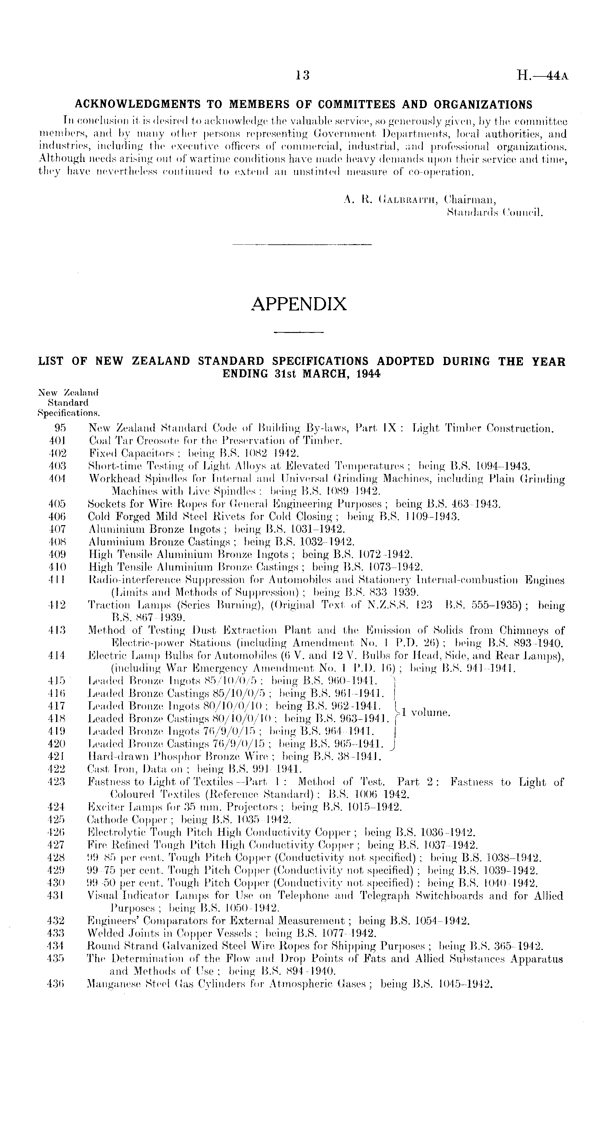 ACKNOWLEDGMENTS TO MEMBERS OF COMMITTEES AND ORGANIZATIONS In conclusion it is desired to acknowledge the valuable service, so generously given, by the committee members, and by many other persons representing Government Departments, local authorities, and industries, including the executive officers of commercial, industrial, and professional organizations. Although needs arising out of wartime conditions have made heavy demands upon their service and time, they have nevertheless continued to extend an unstinted measure of co-operation. A. R. Galbraith, Chairman, Standards Council.