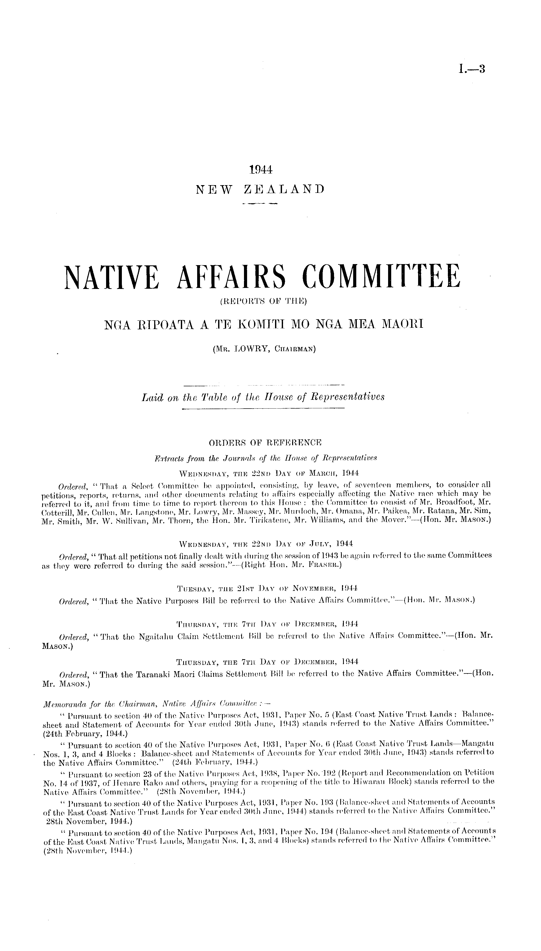 NATIVE AFFAIRS COMMITTEE (REPORTS OF THE) NGA RIPOATA A TE KOMITI MO NGA MEA MAORI (Mr. LOWRY, Chairman)