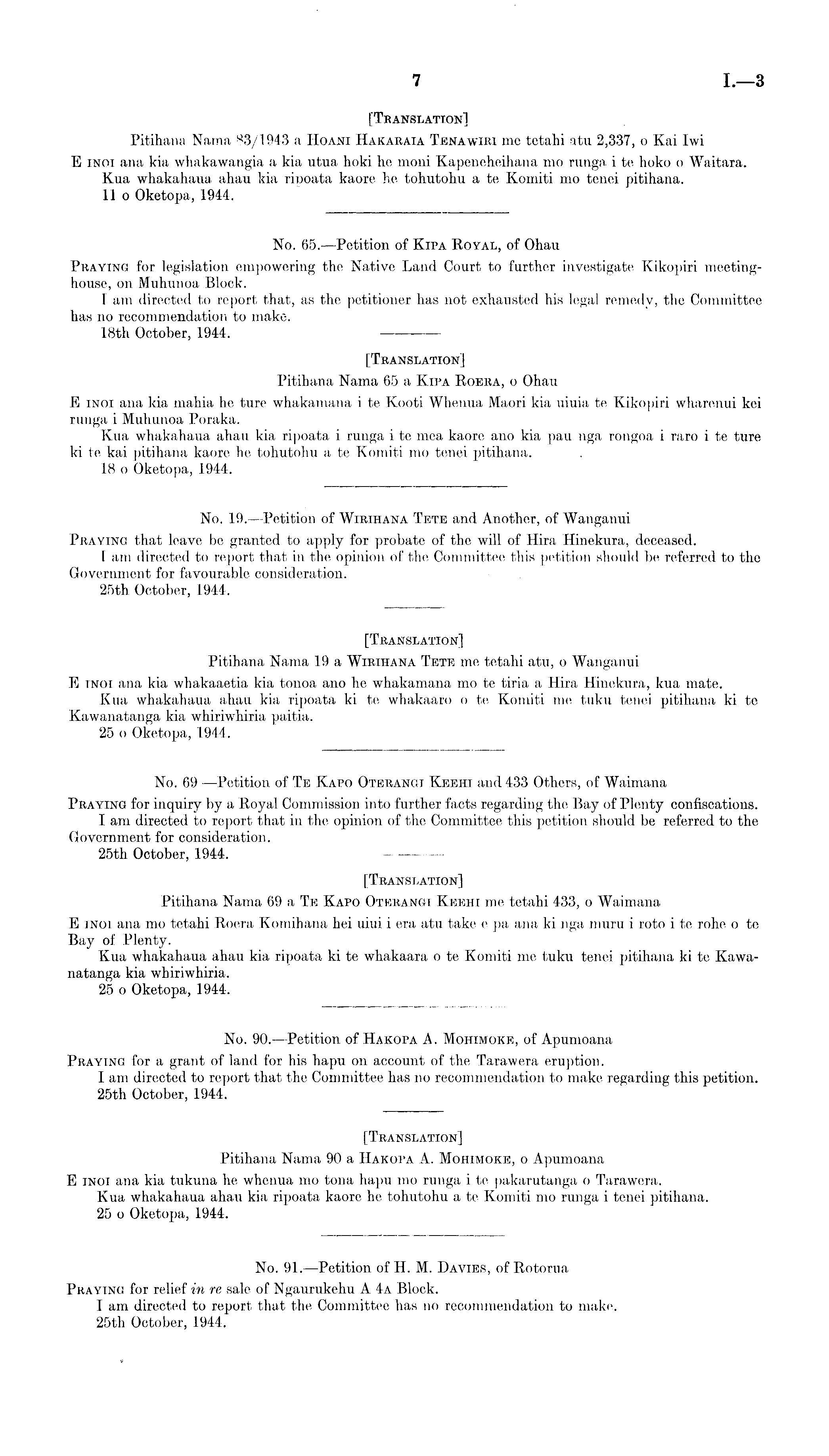 [Translation] Pitihana Nama 69 a Te Kapo Oterangi Keehi me tetahi 433, o Waimana E inoi ana mo tetahi Roera Komihana hei uiui i era atu take e pa ana ki nga muru i roto i te rohe o te Bay of Plenty. Kua whakahaua ahau kia ripoata kite whakaara o te Komiti me tuku tenei pitihana kite Kawanatanga kia whiriwhiria. 25 o Oketopa, 1944.