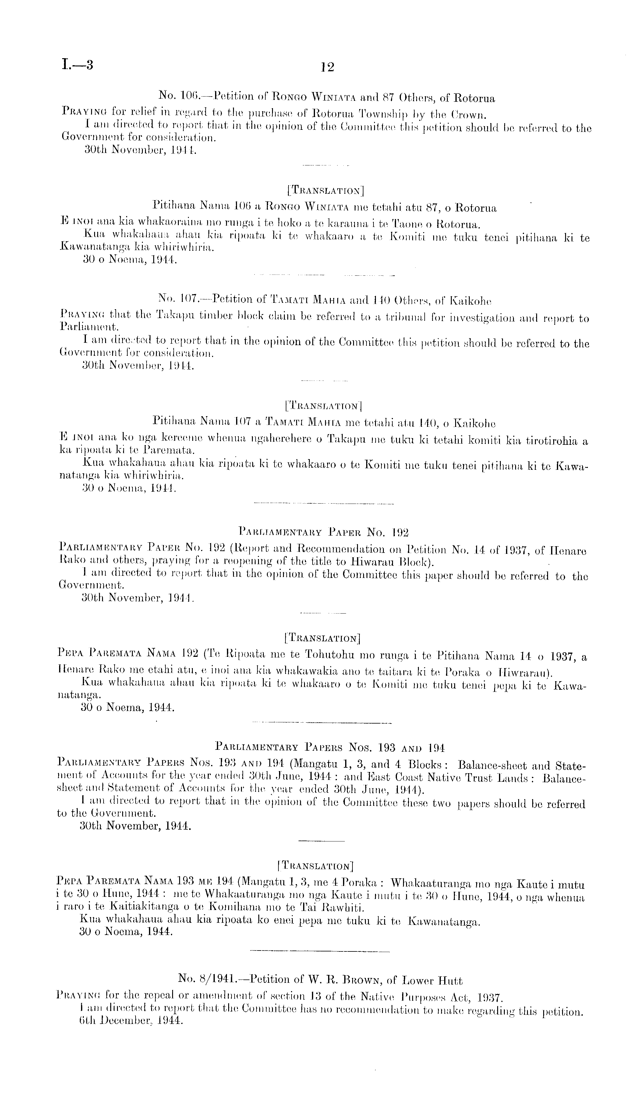 [Translation] Pepa Paremata Nama 192 (Te Ripoata mete Tohutohu mo runga i te Pitihana Nama 14 o 1937, a Henare Rako me etahi atu, e inoi ana kia whakawakia ano te taitara kite Poraka o Hiwrarau). Kua whakahaua ahau kia ripoata kite whakaaro o te Komiti me tuku tenei pepa kite Kawanatanga. 30 o Noema, 1944.