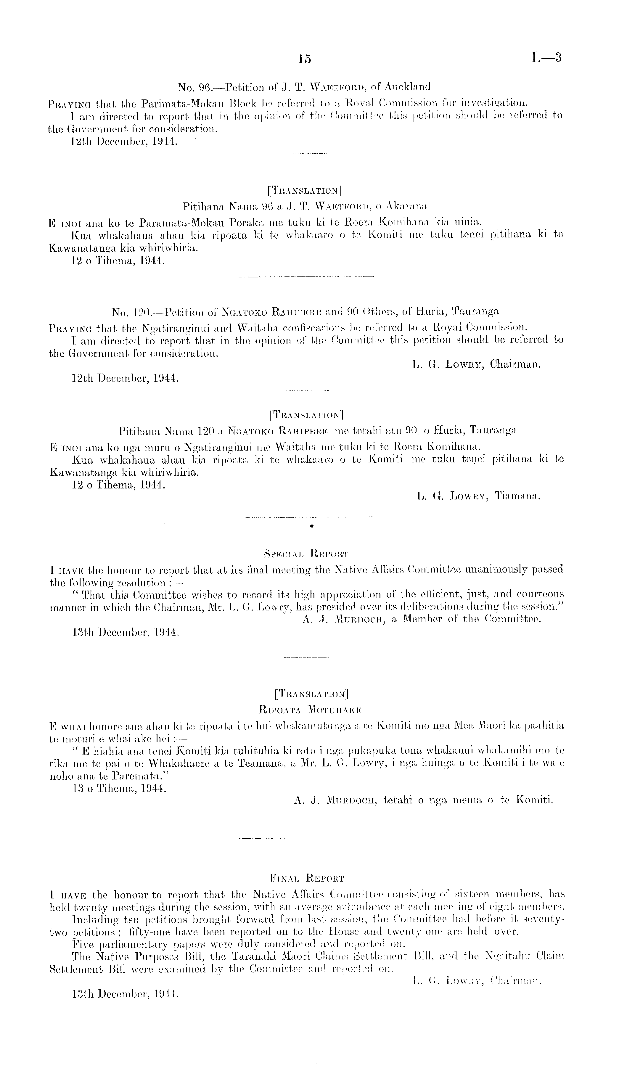 [Translation] Ripoata Motuhake E whai honoro ana ahau kite ripoata i te hui whakamutunga a te Komiti mo nga Mea Maori ka paahitia te moturi e whai ake hei " E hiahia ana tenei Komiti kia tuhituhia ki roto i nga pukapuka tona whakanui whakamihi mo te tika me to pai o te Whakahaere a te Teamana, a Mr. L. G. Lowry, i nga huinga o te Komiti i te wa e noho ana te Paremata." 13 o Tihema, 1944. A. J. Murdoch, tetahi o nga mema o te Komiti.