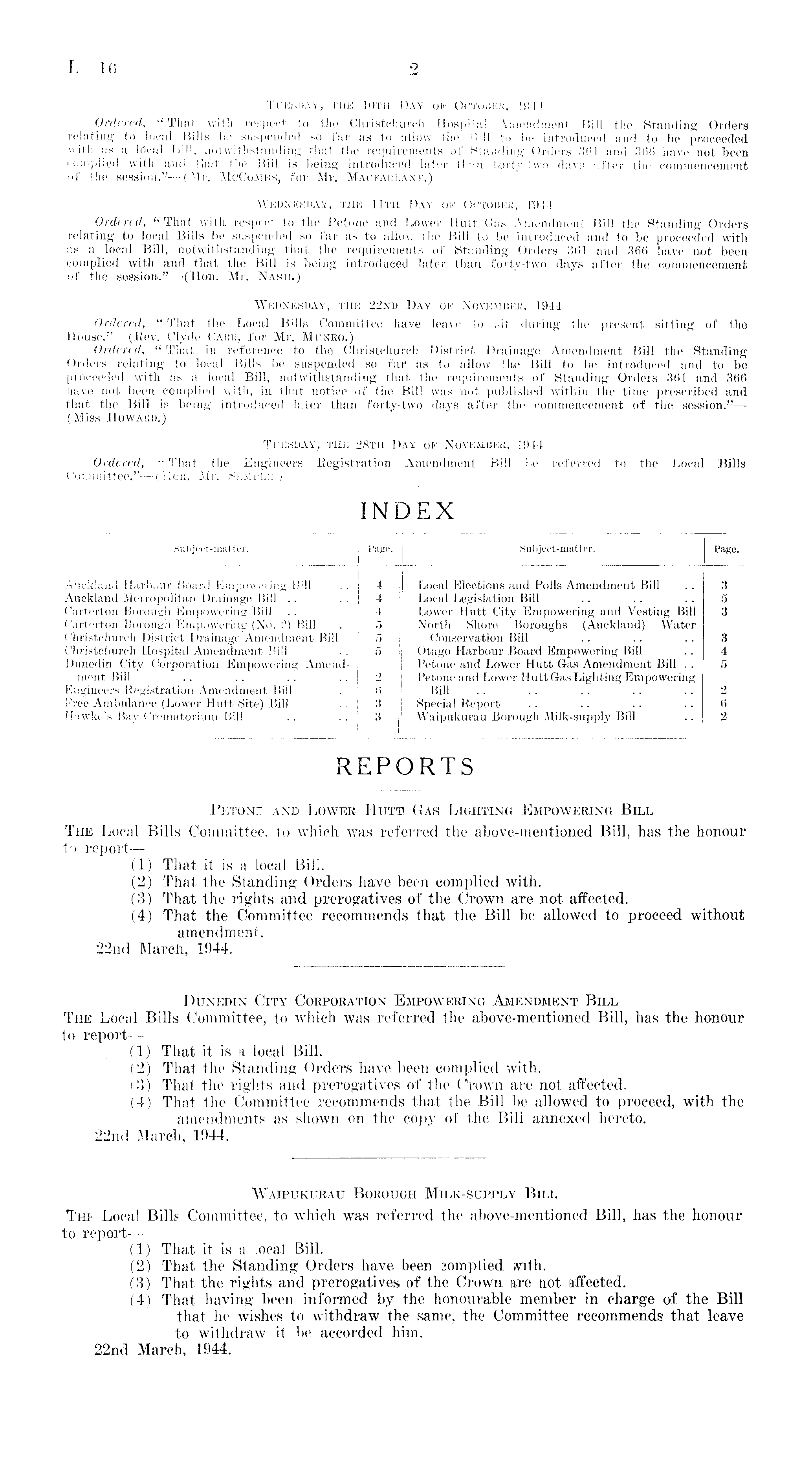 Tuesday, the 10th Day of October, 1944 Ordered, " That with respect to the Christchurch Hospital Amendment Bill the Standing Orders relating to local Bills be suspended so far as to allow the Bill to be introduced and to be proceeded with as a local Bill, notwithstanding that the requirements of Standing Orders 361 and 366 have not been complied with and that the Bill is being introduced later than forty-two days after the commencement of the session." —(Mr. McCombs, for Mr. Macfarlane.) Wednesday, the 11th Day of October, 1'944 Ordered, " That with respect to the Petone and Lower Hutt Gas Amendment Bill the Standing Orders relating to local Bills be suspended so far as to allow the Bill to be introduced and to be proceeded with as a local Bill, notwithstanding that the requirements of Standing Orders 361 and 366 have not been complied with and that the Bill is being introduced later than forty-two days after the commencement of the session." —'(Hon. Mr. Nash.) "Wednesday, the 22nd Day of November, 1944 Ordered, " That the Local Bills Committee have leave to sit during the present sitting of the House." —(Rev. Clyde Carr, for Mr. Munro.) Ordered, " That in reference to the Christchurch District Drainage Amendment Bill the Standing Orders relating to local Bills be suspended so far as to, allow the Bill to be introduced and to be proceeded with as a local Bill, notwithstanding that the requirements of Standing Orders 361 and 366 have not been complied with, in that notice of the Bill was not published within the time prescribed and that the Bill is being introduced later than forty-two days after the commencement of the session." — (Miss Howard.) Tuesday, the 28th Day of November, 1944 Ordered, " That the Engineers Registration Amendment Bill be referred to the Local Bills Committee."—(Hon. Mr. Semple.J INDEX Subject-matter. Page. j| Subject-matter. Page. Auckland Harbour Board Empowering Bill . . 4 Local Elections and Polls Amendment Bill .. 3 Auckland Metropolitan Drainage Bill .. . . 4 Local Legislation Bill .. . . .. 5 Carterton Borough Empowering Bill .. 4 Lower Hutt City Empowering and Vesting Bill 3 Carterton Borough Empowering (No. 2) Bill .. 5 North Shore Boroughs (Auckland) Water Christchurch District Drainage Amendment Bill 5 Conservation Bill .. .. .. 3 Christchurch Hospital Amendment Bill .. 5 Otago Harbour Board Empowering Bill .. 4 Dunedin City Corporation Empowering Amend- Petone and Lower Hutt Gas Amendment Bill . . 5 ment Bill .. .. .. .. 2 Petone and Lower Hutt Gas Lighting Empowering Engineers Registration Amendment Bill .. 6 Bill .. .. .. .. .. 2 Free Ambulance (Lower Hutt Site) Bill .. 3 Special Report .. .. ... 6 Hawke's Bay Crematorium Bill . . .. 3 Waipukurau Borough Milk-supply Bill .. 2 REPORTS Petone and Lower Butt Gas Lighting Empowering Bill The Local Bills Committee, to which was referred the above-mentioned Bill, has the honour to report— (1) That it is a local Bill. (2) That the Standing Orders have been complied with. (3) That the rights and prerogatives of the Crown are not affected. (4) That the Committee recommends that the Bill be allowed to proceed without amendment,. 22nd March, 1944.