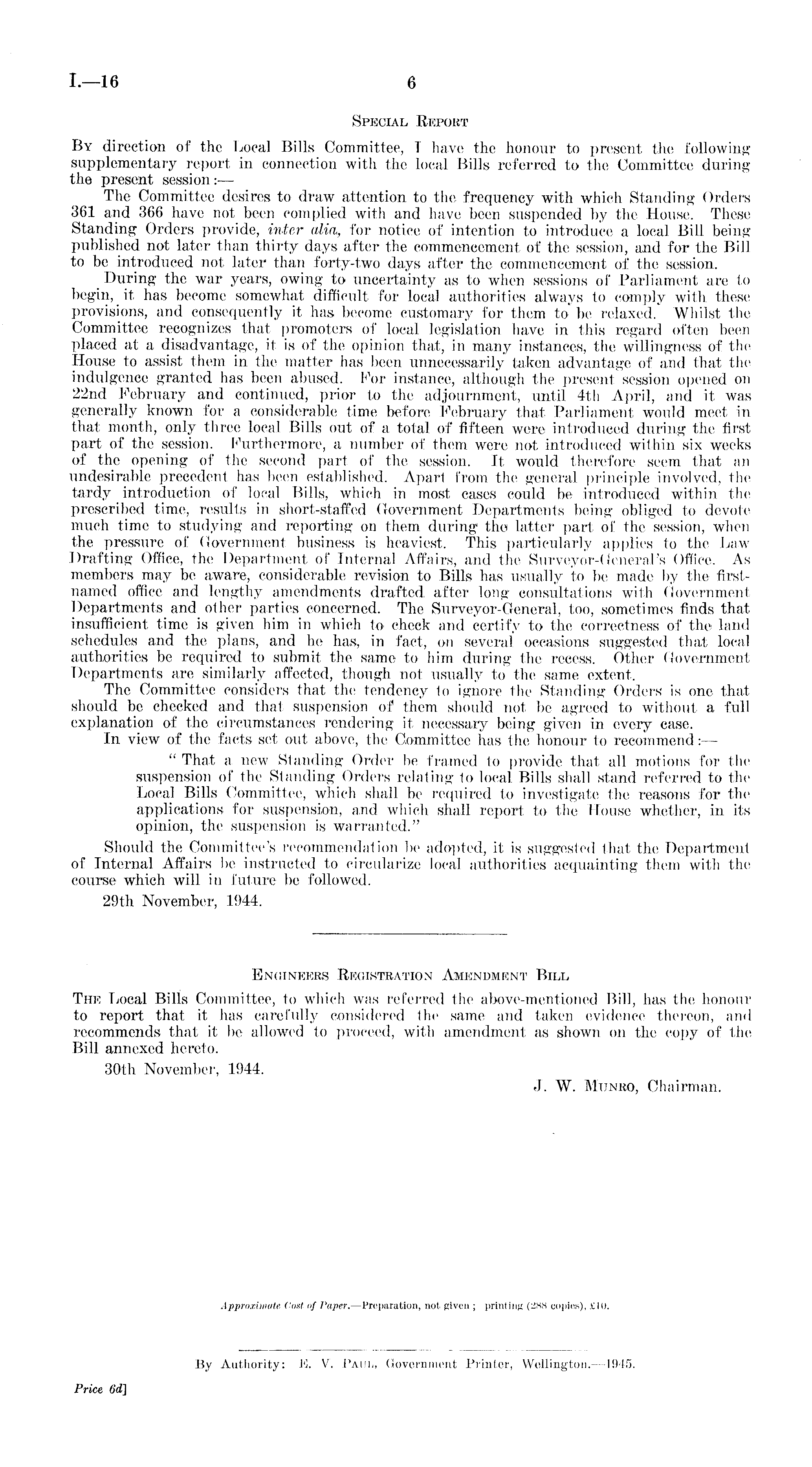 Special Report By direction of the Local Bills Committee, I have the honour to present the following supplementary report in connection with the local Bills referred to the Committee during the present session:— The Committee desires to draw attention to the frequency with which Standing Orders 361 and 366 have not been complied with and have been suspended by the House. These Standing Orders provide, inter alia,, for notice of intention to introduce a local Bill being published not later than thirty days after the commencement of the session, and for the Bill to be introduced not later than forty-two days after the commencement of the session. _ During the war years, owing to uncertainty as to when sessions of Parliament are to begin, it has become somewhat difficult for local authorities always to comply with these provisions, and consequently it has become customary for them to be relaxed. Whilst the Committee recognizes that promoters of local legislation have in this regard often been placed at a disadvantage, it is of the opinion that, in many instances, the willingness of the House to assist them in the matter has been unnecessarily taken advantage of and that the indulgence granted has been abused. For instance, although the present session opened on 2'2nd February and continued, prior to the adjournment, until 4th April, and it was generally known for a considerable time before February that Parliament would meet in that, month, only three local Bills out of a total of fifteen were introduced during the first part of the session. Furthermore, a number of them were not introduced within six weeks of the opening of the second part of the session. It would therefore seem that an undesirable precedent has been established. Apart from the general principle involved, the tardy introduction of local Bills, which in most cases could be introduced within the prescribed time, results in short-staffed Government Departments being obliged to devote much time to studying and reporting on them during the latter part of the session, when the pressure of Government business is heaviest. This particularly applies to the Law Drafting Office, the Department of Internal Affairs, and the Surveyor-General's Office. As members may be aware, considerable revision to Bills has usually to be made by the firstnamed office and lengthy amendments drafted after long consultations with Government Departments and other parties concerned. The Surveyor-General, too, sometimes finds that insufficient time is given him in which to check and certify to the correctness of the land schedules and the plans, and he has, in fact, on several occasions suggested that local authorities be required to submit the same to him. during the recess. Other Government Departments are similarly affected, though not usually to the same extent. The Committee considers that the tendency to ignore the Standing Orders is one that should be checked and that suspension of them should not be agreed to without a full explanation of the circumstances rendering it, necessary being given in every case. In view of the facts set out above, the Committee has the honour to recommend:— " That a new Standing Order be framed to provide that all motions for the suspension of the Standing Orders relating to local Bills shall stand referred to the Local Bills Committee, which shall be required to investigate the reasons for the applications for suspension, and which shall report to the House whether, in its opinion, the suspension is warranted." Should the Committee's recommendation be adopted, it is suggested that the Department of Internal Affairs be instructed to circularize local authorities acquainting them with the course which will in future be followed. 29th November, 1944.