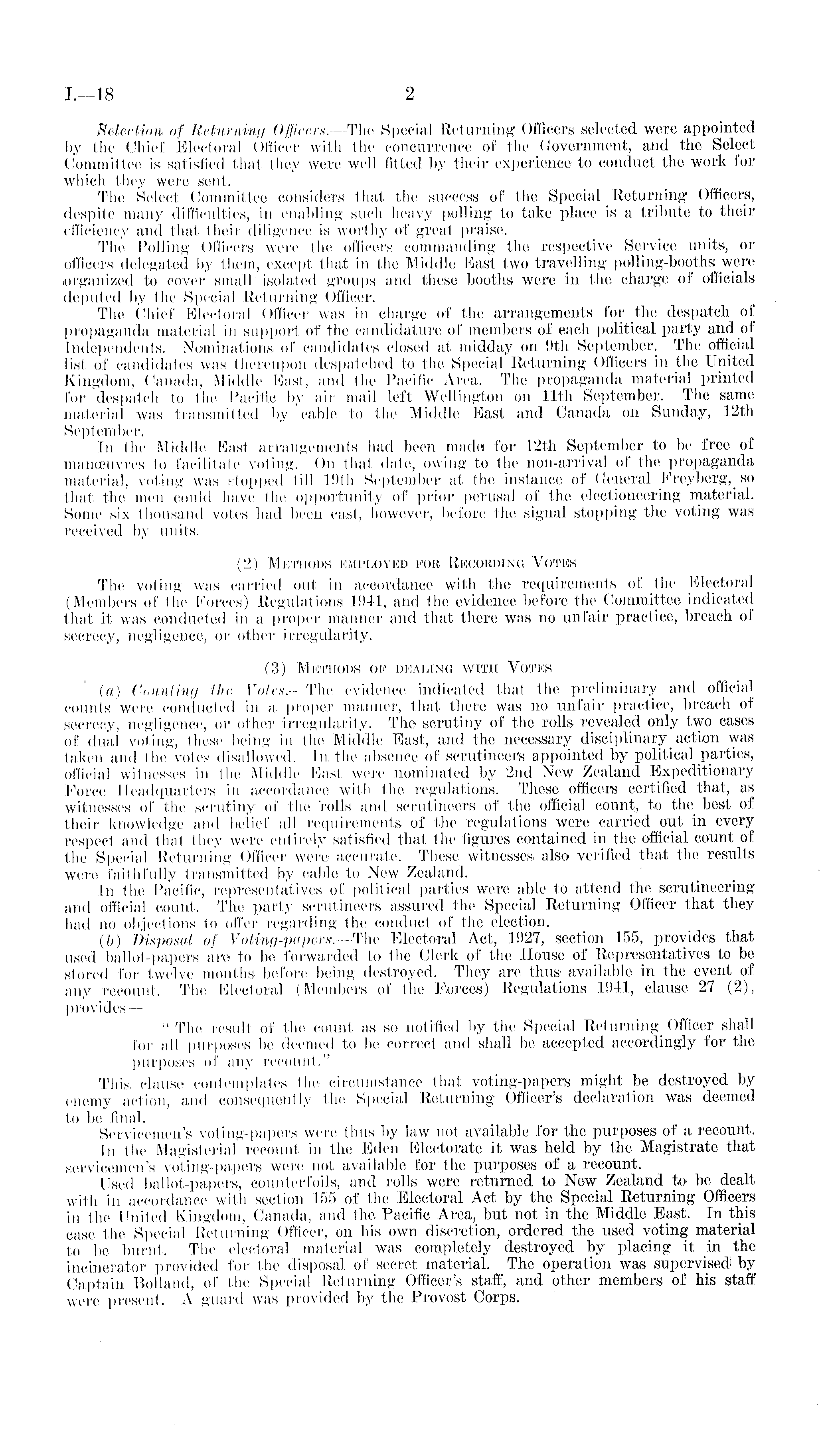 Selection of lieiurning Officers. —The Special Returning Officers selected were appointed by the Chief Electoral Officer with the concurrence of the Government, and the Select Committee is satisfied that they were well fitted by their experience to conduct the work for which they were sent. The Select Committee considers that the success of the Special Returning Officers, despite many difficulties, in enabling such heavy polling to take place is a tribute to their efficiency and that their diligence is worthy of great praise. The Polling Officers were the officers commanding the respective Service units, or officers delegated by them, except that in the Middle East two travelling polling-booths were organized to cover small'isolated groups and these booths were in the charge of officials deputed by the Special Returning Officer. The Chief Electoral Officer was in charge of the arrangements for the despatch of propaganda material in support of the candidature of members of each political party and of Independents. Nominations of candidates closed at midday on 9th September. The official list of candidates was thereupon despatched to the Special Returning Officers in the United Kingdom, Canada, Middle East, and the Pacific Area. The propaganda material printed for despatch to the Pacific by air mail left Wellington on 11th September. The same material was transmitted by cable to the Middle East and Canada on Sunday, 12th September. In the Middle East arrangements had been made for 12th September to be free of manoeuvres to facilitate voting. On that date, owing to the non-arrival of the propaganda material, voting was stopped till 19th September at the instance of General Freyberg, so that the men could have the opportunity of prior perusal of the electioneering material. Some six thousand votes had been cast, however, before the signal stopping the voting was received by units. (2) Methods employed for Recording Votes The voting was carried out in accordance with the requirements of the Electoral (Members of the Forces) Regulations 1941, and the evidence before the Committee indicated that it was conducted in a proper manner and that there was no unfair practice, breach of secrecy, negligence, or other irregularity. (3) Methods of dealing with Votes (a) Counting the Votes.- -The evidence indicated that the preliminary and official counts were conducted in a proper manner, that there was no unfair practice, breach of secrecy, negligence, or other irregularity. The scrutiny of the rolls revealed only two cases of dual voting, these being in the Middle East, and the necessary disciplinary action was taken and the votes disallowed. In; the absence of scrutineers appointed by political parties, official witnesses in the Middle Fast were nominated by 2nd New Zealand Expeditionary Force Headquarters in accordance with the regulations. These officers certified that, as witnesses of the scrutiny of the rolls and scrutineers of the official count, to the best of their knowledge and belief all requirements of the regulations were carried out in every respect and that they were entirely satisfied that the figures contained in the official count of the Special Returning Officer were accurate. These witnesses also verified that the results were faithfully transmitted by cable to New Zealand. In the Pacific, representatives of political parties were able to attend the scrutineering and official count. The party scrutineers assured the Special Returning Officer that they had no objections to offer regarding the conduct of the election. (b) Disposal of Voting-papers.—The Electoral Act, 1927, section 155, provides that used, ballot-papers are to be forwarded to the Clerk of the House of Representatives to be stored for twelve months, before being destroyed. They are thusi available in the event of any recount. The Electoral (Members of the Forces) Regulations 1941, clause 27 (2), provides— "The result of the count as so notified by the Special Returning Officer shall for all purposes be deemed to be correct and shall be accepted accordingly for the purposes of any recount." This clause contemplates the circumstance that voting-papers might be destroyed by enemy action, and consequently the Special Returning Officer's declaration was deemed to be final. Servicemen's voting-papers were thus by law not available for the purposes of a recount. Tn the Magisterial recount in the Eden Electorate it was held by the Magistrate that servicemen's voting-papers were not available for the purposes of a recount. Used ballot-papers, counterfoils, and rolls were returned to New Zealand to be dealt with in accordance with section 155 of the Electoral Act by the Special Returning Officers in the United Kingdom, Canada, and the Pacific Area, but not in the Middle East. In this case the Special Returning Officer, on his own discretion, ordered the used voting material to lie burnt, The electoral material was completely destroyed by placing it in the incinerator provided for the disposal of secret material. The operation was supervised by Captain Bolland, of the Special Returning Officer's staff, and other members of his staff were present. A guard was provided by the Provost Corps.