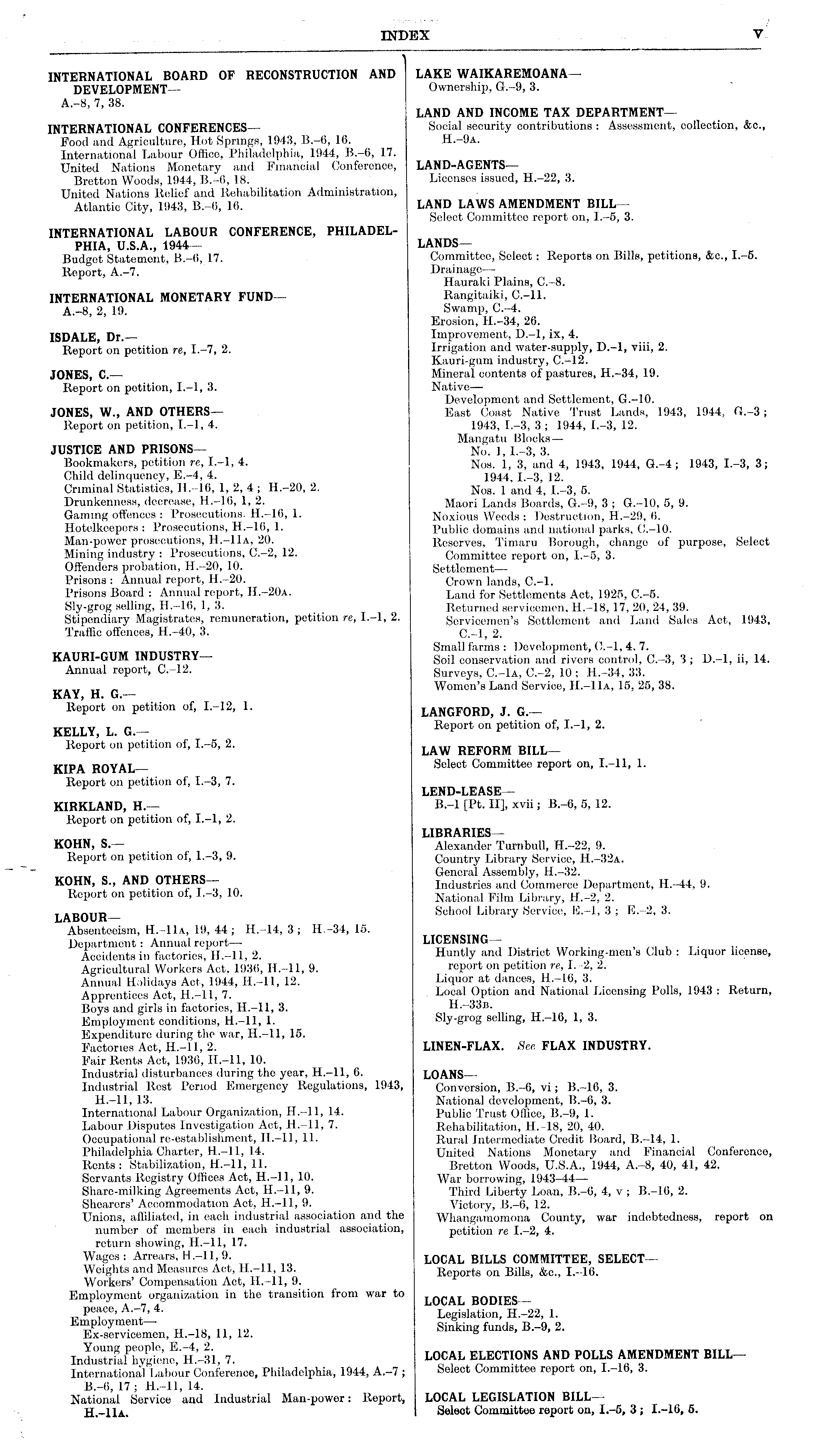 LAKE WAIKAREMOANA Ownership, G.-9, 3. LAND AND INCOME TAX DEPARTMENT— Social security contributions : Assessment, collection, &c., H.-9a. LAND-AGENTS— Licenses issued, H.-22, 3. LAND LAWS AMENDMENT BILL— Select Committee report on, 1.-5, 3. LANDS Committee, Select: Reports on Bills, petitions, &c., 1.-5. Drainage — Hauralci Plains, C.-8. Rangitaiki, C.-11. Swamp, C.-4. Erosion, H.-34, 26. Improvement, D.-l, ix, 4. Irrigation and water-supply, D.-l, viii, 2. Kauri-gum industry, C.-i2. Mineral contents of pastures, H.-34, 19. Native — Development and Settlement, G.-10. East Coast Native Trust Lands, 1943, 1944, G.-3 ; 1943, 1.-3, 3 ; 1944, 1.-3, 12. Mangatu Blocks No. 1, 1.-3, 3. Nos. 1, 3, and 4, 1943, 1944, G.-4; 1943, 1.-3, 3; 1944, 1.-3, 12. Nos. 1 and 4, 1.-3, 5. Maori Lands Boards, G.-9, 3 ; G.-10, 5, 9. Noxious Weeds : Destruction, H.-29, 6. Public domains and national parks, C.-10. Reserves, Timaru Borough, change of purpose, Select Committee report on, 1.-5, 3. Settlement— Crown lands, C.-l. Land for Settlements Act, 1925, C.-5. Returned servicemen. H.-18, 17, 20, 24, 39. Servicemen's Settlement and Land Sales Act, 1943, C.-l, 2. Small farms : Development, C.-l, 4. 7. Soil conservation and rivers control, C.-3, 3 ; D.-l, ii, 14. Surveys, C.-la, C.-2, 10 ; H.-34, 33. Women's Land Service, H.-11a, 15, 25, 38. LANGFORD, J. G.— Report on petition of, 1.-l, 2. LAW REFORM BILL— Select Committee report on, I.—ll, 1. LEND-LEASE—-8.-l [Pt. ll], xvii; 8.-6, 5, 12. LIBRARIES Alexander Turnbull, H.-22, 9. Country Library Service, H.-32a. General Assembly, H.-32. Industries and Commerce Department, H.-44, 9. National Film Library, H.-2, 2. School Library Service, E.-l, 3 ; E.-2, 3. LICENSING— Huntly and District Working-men's Club : Liquor license, report on petition re, I. -2, 2. Liquor at dances, H.-16, 3. Local Option and National Licensing Polls, 1943 : Return, H.-33b. Sly-grog selling, H.-16, 1, 3. LINEN-FLAX. See FLAX INDUSTRY. LOANS— Conversion, 8.-6, vi; 8.-16, 3. National development, 8.-6, 3. Public Trust Office, 8.-9, 1. Rehabilitation, H.-18, 20, 40. Rural Intermediate Credit Board, 8.-14, 1. United Nations Monetary and Financial Conference, Bretton Woods, U.S.A., 1944, A.-8, 40, 41, 42. War borrowing, 1943-44 — Third Liberty Loan, 8.-6, 4, v ; 8.-16, 2. Victory, 8.-6, 12. Whangamomona County, war indebtedness, report on petition re 1.-2, 4. LOCAL BILLS COMMITTEE, SELECT— Reports on Bills, &c., 1.-16. LOCAL BODIES— Legislation, H.-22, 1. Sinking funds, 8.-9, 2. LOCAL ELECTIONS AND POLLS AMENDMENT BILL— Select Committee report on, 1.-16, 3. LOCAL LEGISLATION BILLSelect Committee report on, 1.-5, 3 ; 1.-16, 5.