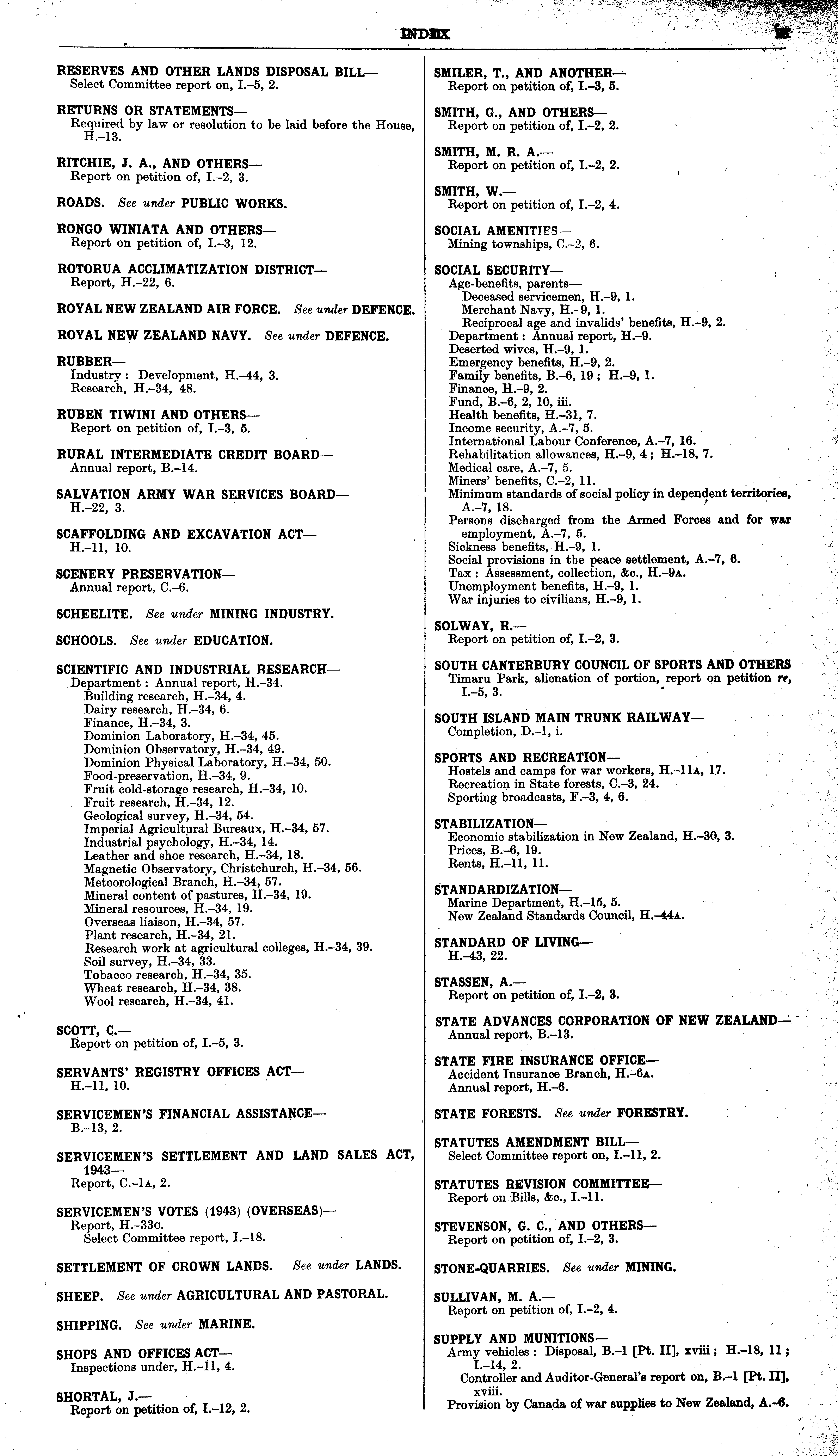 SMILER, T., AND ANOTHER— Report on petition of, 1.-3, 5. SMITH, G., AND OTHERS— Report on petition of, 1.-2, 2. SMITH, M. R. A.— Report on petition of, 1.-2, 2. SMITH, W.— Report on petition of, 1.-2, 4. SOCIAL AMENITIFS — Mining townships, C.-2, 6. SOCIAL SECURITY— Age-benefits, parents — Deceased servicemen, H.-9, 1. Merchant Navy, H.-9, 1. Reciprocal age and invalids' benefits, H.-9, 2. Department : Annual report, H.-9. Deserted wives, H.-9, 1. Emergency benefits, H.-9, 2. Family benefits, 8.-6, 19 ; H.-9, 1. Finance, H.-9, 2. Fund, 8.-6, 2, 10, iii. Health benefits, H.-31, 7. Income security, A.-7, 5. International Labour Conference, A.-7, 16. Rehabilitation allowances, H.-9, 4 ; H.-18, 7. Medical care, A.-7, 5. Miners' benefits, C.-2, 11. Minimum standards of social policy in dependent territories, A.-7, 18. Persons discharged from the Armed Forces and for war employment, A.-7, 5. Sickness benefits, H.-9, 1. Social provisions in the peace settlement, A.-7, 6. Tax : Assessment, collection, &c., H.-9a. Unemployment benefits, H.-9, 1. War injuries to civilians, H.-9, 1. SOLWAY, R.— Report on petition of, 1.-2, 3. SOUTH CANTERBURY COUNCIL OF SPORTS AND OTHERS Timaru Park, alienation of portion, report on petition re, 1.-5, 3. SOUTH ISLAND MAIN TRUNK RAILWAY— Completion, D.-l, i. SPORTS AND RECREATION— Hostels and camps for war workers, H.-11a, 17. Recreation in State forests, C.-3, 24. Sporting broadcasts, F.-3, 4, 6. STABILIZATION— Economic stabilization in New Zealand, H.-30, 3. Prices, 8.-6, 19. Rents, H.—ll, 11. STANDARDIZATION— Marine Department, H.-15, 5. New Zealand Standards Council, H.-44a. STANDARD OF LIVING— H.-43, 22. STASSEN, A.— Report on petition of, 1.-2, 3. STATE ADVANCES CORPORATION OF NEW ZEALAND— Annual report, 8.-13. STATE FIRE INSURANCE OFFICE— Accident Insurance Branch, H.-6a. Annual report, H.-6. STATE FORESTS. See under FORESTRY. STATUTES AMENDMENT BILL— Select Committee report on, 1.-11, 2. STATUTES REVISION COMMITTEE— Report on Bills, &c., 1.-11. STEVENSON, G. C., AND OTHERS— Report on petition of, 1.-2, 3. STONE-QUARRIES. See under MINING. SULLIVAN, M. A.— Report on petition of, 1.-2, 4. SUPPLY AND MUNITIONS— Army vehicles : Disposal, 8.-l [Pt. ll], xviii; H.-18, 11 ; 1.—14, 2. Controller and Auditor-General's report on, 8.-l [Pt. ll], xviii. Provision by Canada of war supplies to New Zealand, A.-6.
