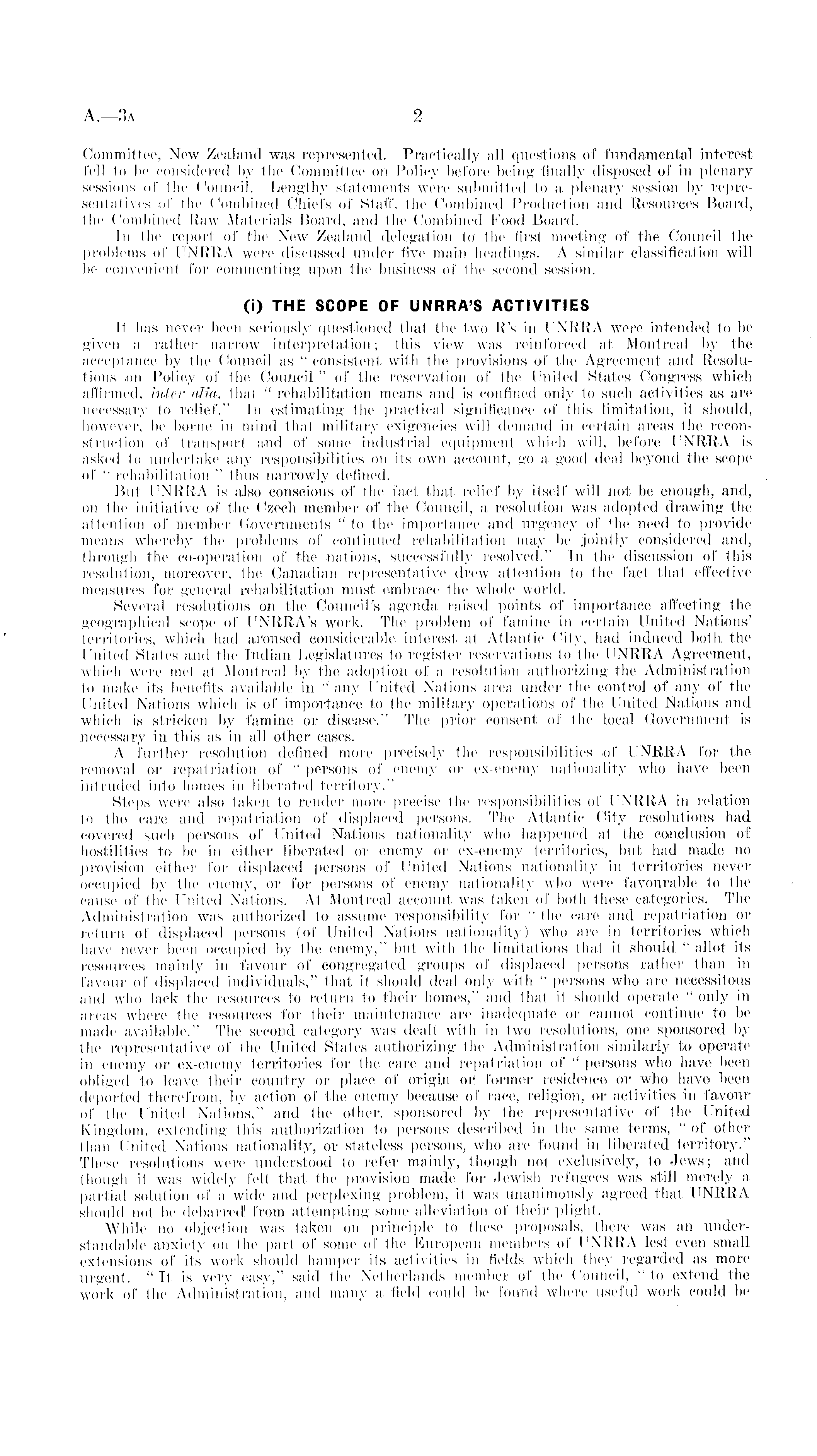 Committee, New Zealand was represented. Practically all questions of fundamental interest fell to be considered by the Committee on Policy before being finally disposed of in plenary sessions of the Council. Lengthy statements were submitted to a plenary session by representatives of the Combined Chiefs of Staff, the Combined Production and Resources Board, the Combined Raw Materials Board, and the Combined Food Board. In the report of the New Zealand delegation to' the first meeting of the Council the problems of UNRRA were discussed under five main headings. A similar classification will bo convenient for commenting upon the business of the second session. (i) THE SCOPE OF UNRRA'S ACTIVITIES It lias never been seriously questioned that the two R's in UNRRA were intended to be given a rather narrow interpretation; this view was reinforced at Montreal by the acceptance by the Council as " consistent with the provisions of the Agreement and Resolutions on Policy of the Council " of the reservation of the United States Congress which affirmed, inter alia, that " rehabilitation means and is confined only to such activities as are necessary to relief." In estimating the practical significance of this limitation, it should, however, be borne in mind that military exigencies will demand in certain areas the reconstruction of transport and of some industrial equipment which will, before UNRRA is asked to undertake any responsibilities on its own account, go a. good deal beyond the scope of " rehabilitation " thus narrowly defined. But UNRRA is also conscious of the fact that relief by itself will not be enough, and, on the initiative of the Czech member of the Council, a resolution was adopted drawing the attention of member Governments " to the importance and urgency of the need to provide means whereby the problems of continued rehabilitation may be jointly considered and, through the co-operation of the nations, successfully resolved." In the discussion of this resolution, moreover, the Canadian representative drew attention to the fact that effective measures for general rehabilitation must embrace the whole world. Several resolutions on the Council's agenda raised, points of importance affecting the geographical scope of UNRRA's work. The problem of famine in certain United Nations' territories, which had aroused considerable interest at Atlantic City, had induced both the United States and the Indian Legislatures to register reservations to the UNRRA Agreement, which were met at Montreal by the adoption of a resolution authorizing the Administration to make its benefits available in " any United Nations area under the control of any of the United Nations which is of importance to the military operations of the United Nations and which is stricken by famine or disease." The prior consent of the local Government is necessary in this as in all other cases. A further resolution defined more precisely the responsibilities of UNRRA for the removal or repatriation of " persons of enemy or ex-enemy nationality who have been intruded into homes in liberated territory." Steps were also taken to render more precise the responsibilities of UNRRA in relation to the care and repatriation of displaced persons. The Atlantic City resolutions had covered such persons of United Nations nationality who happened at the conclusion of hostilities to be in either liberated or enemy or ex-enemy territories, but had made no provision either for displaced persons of United Nations nationality in territories never occupied by the enemy, or for persons of enemy nationality who were favourable to the cause of the United Nations, At Montreal account was taken of both these categories. The Administration was authorized to assume responsibility for " the care and repatriation or return of displaced persons (of United Nations nationality) who are in territories which have never been occupied by the enemy," but with the limitations that it should " allot its resources mainly in favour of congregated groups of displaced persons rather than in favour of displaced individuals," that it should deal only with " persons who are necessitous and who lack the resources to return to their homes," and that it should operate " only in areas where the resources for their maintenance are inadequate or cannot continue to be made available." The second category was dealt with in two resolutions, one sponsored by the representative of the United States authorizing the Administration similarly to operate in enemy or ex-enemy territories for the care and repatriation of " persons who have been obliged to leave their country or place of origin op former residence or who have been deported therefrom, by action of the enemy because of race, religion, or activities in favour of the United Nations," and the other, sponsored by the representative of the United Kingdom, extending this authorization to personal described in the same terms, " of other than United Nations nationality, or stateless persons, who are found in liberated territory." These resolutions were understood to refer mainly, though not exclusively, to Jews; and though it was widely felt: that the provision made for Jewish refugees was still merely a partial solution of a wide and perplexing problem, it was unanimously agreed that UNRRA should not be debarred! from attempting some alleviation of their plight. While no objection was taken on principle to these proposals, there was an understandable anxiety on the part of some of the European members of UNRRA lest even small extensions of its work should hamper its activities in fields which they regarded as more urgent. "It. is very easy," said the Netherlands member of the Council, "to extend the work of the Administration, and many a field could be found where useful work could be