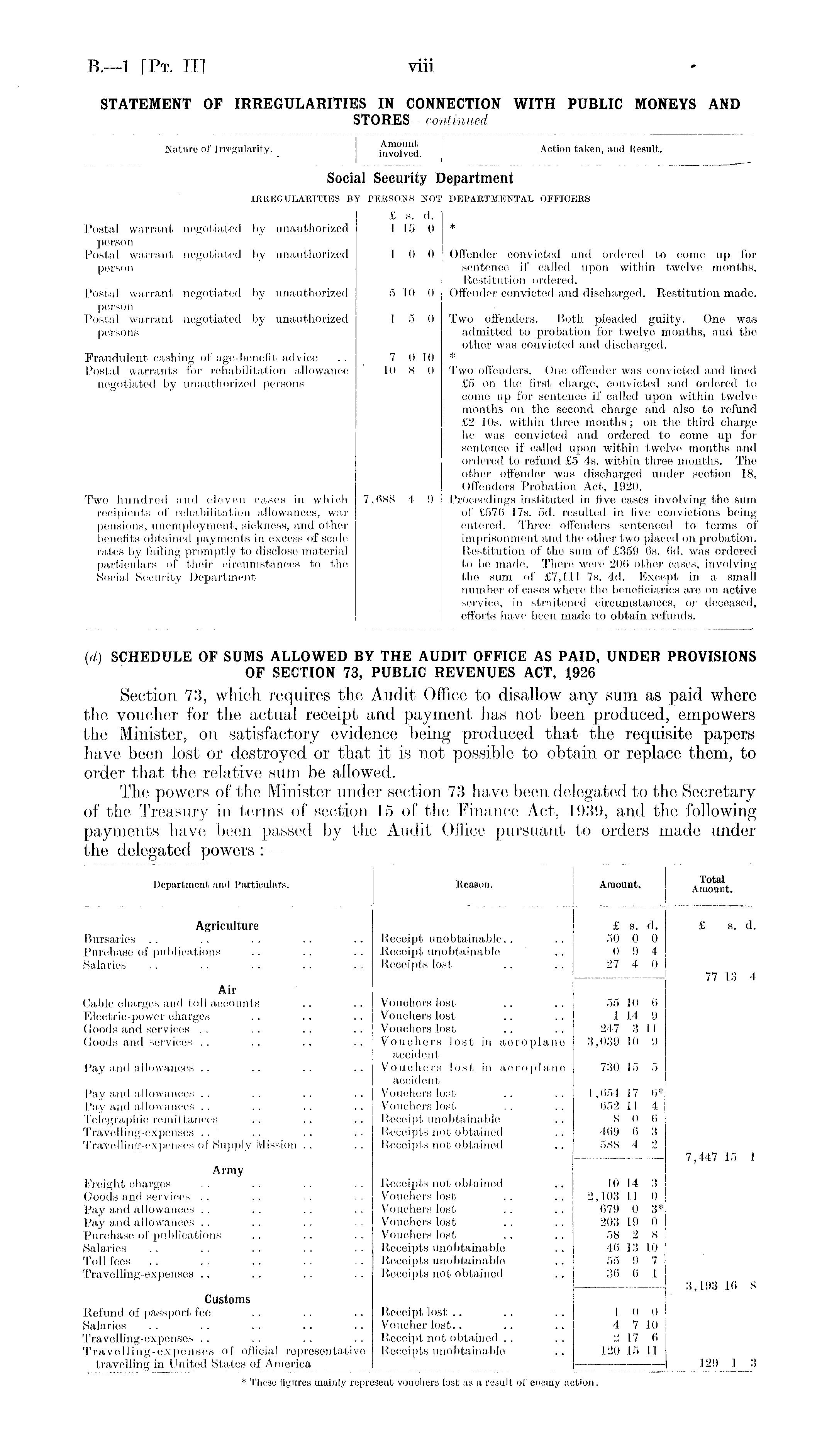 (d) SCHEDULE OF SUMS ALLOWED BY THE AUDIT OFFICE AS PAID, UNDER PROVISIONS OF SECTION 73, PUBLIC REVENUES ACT, 1926 Section 73, which requires the Audit Office to disallow any sum as paid where the voucher for the actual receipt and payment has not been produced, empowers the Minister, on satisfactory evidence being produced that the requisite papers have been lost or destroyed or that it is not possible to obtain or replace them, to order that the relative sum be allowed. The powers of the Minister under section 73 have been delegated to the Secretary of the Treasury in terms of section 15 of the Finance Act, 1939, and the following payments have been passed by the Audit Office pursuant to orders made under the delegated powers