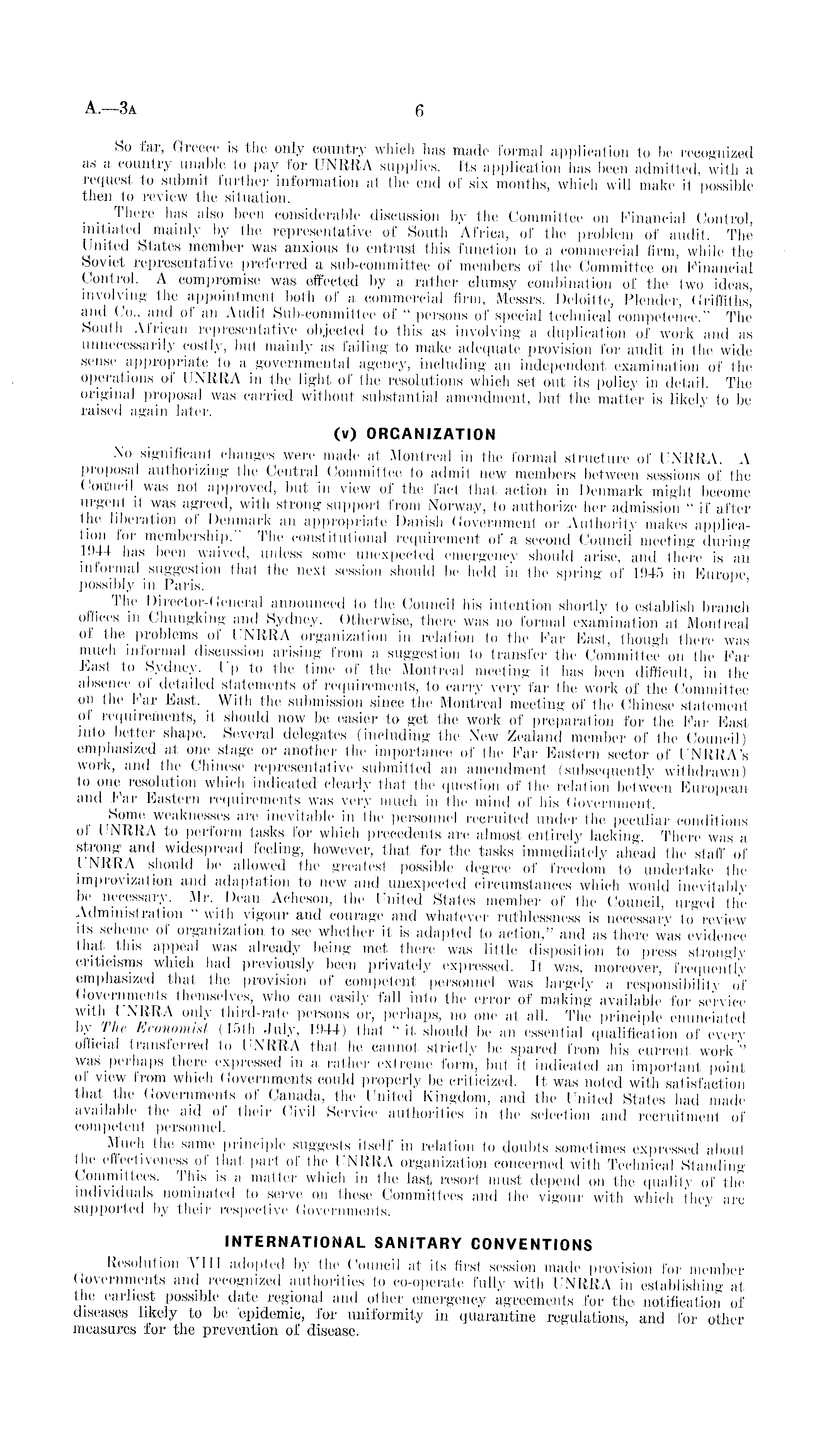 So far, Greece is the only country which has made formal application to be recognized as a country unable to pay for UNRRA supplies. Its application has been admitted, with a request to submit further information at the end of six months, which will make it possible then to review the situation. . . . There has also been considerable discussion by tiie Committee on Financial Control, initiated mainly by the representative of South Africa, of the problem of audit. The United States member was anxious to entrust this function to a commercial firm, while the Soviet representative preferred a sub-committee of members of the Committee on Financial Control. A compromise was effected by a rather clumsy combination of the two ideas, involving the appointment both of a commercial firm, Messrs. Deloitte, Plender, Griffiths, and Co., and of an Audit Sub-committee of " persons of special technical competence." The South African representative objected to this as involving a duplication of work and as unnecessarily costly, but mainly as failing to make adequate provision for audit in the wide sense appropriate to a governmental agency, including an independent examination of the operations of UNRRA in the light of the resolutions which set out its policy in detail. The original proposal was carried without substantial amendment, but the matter is likely to be raised again later. (v) ORGANIZATION No significant changes were made at Montreal in the formal structure of UNRRA. A proposal authorizing the Central Committee to admit new members between sessions of the Council was not approved, but in view of the fact that action in Denmark might become urgent it was agreed, with strong support from Norway, to authorize her admission " if after the liberation of Denmark an appropriate Danish Government or Authority makes application 1 01 membership. Ihe constitutional requirement of a second Council meeting during 1944 has been waived, unless some unexpected emergency should arise, and there is an informal suggestion that the next session should be held in the spring of 1945 in Europe possibly in Paris. ' ' The Director-General announced to the Counted his intention shortly to establish branch offices in Chungking and Sydney. Otherwise, there was no formal examination at Montreal of the problems of UNRRA organization in relation to the Far East, though there was much informal discussion arising from a suggestion to transfer the Committee on the Far East to Sydney. Up to the time of the Montreal meeting it lias been difficult, in the absence of detailed statements of requirements, to carry very far the work of the Committee on the Far East. With the submission since the Montreal meeting of the Chinese statement of requirements, it should now be easier to get the work of preparation for the Far East into hotter shape. Several delegates (including the New Zealand member of the Council) emphasized at one stage or another the importance of the Far Eastern sector of UNRRA's work, and the Chinese representative submitted an amendment (subsequently withdrawn) to one resolution which indicated clearly that the question of the relation between European and Far Eastern requirements was very much in the mind of his Government. Some weaknesses are inevitable in the personnel recruited under the peculiar conditions oi UNRRA to perform tasks for which precedents are almost entirely lacking. There was a strong and widespread feeling, however, that for the tasks immediately ahead the staff of UNRRA should bo allowed the greatest possible degree of freedom to undertake 1 lie improvization and adaptation to new and unexpected circumstances which would inevitably be necessary. Mr. Dean Acheson, the United States member of the Council, urged the Administration with vigour and courage and whatever ruthlessness is necessary to review its scheme of organization to see whether it is adapted to action," and as there was evidence that this appeal was already being met there was little disposition to press strongly criticisms which had previously been privately expressed. It was, moreover, frequently emphasized that the provision of competent personnel was largely a responsibility of Governments themselves, who can easily fall into the error of making available for service with UNRRA only third-rate persons or, perhaps, no one at all. The principle enunciated by The Economist (15th July, 1944) that "it should be an essential qualification of every official transferred to UNRRA that lie cannot strictly be spared from his current work" was perhaps there expressed in a rather extreme form, but it indicated an important point of view from which Governments could properly be criticized. It was noted with satisfaction that the Governments oi' Canada, the United Kingdom, and the United States had made available the aid of their Civil Service authorities in the selection and recruitment of competent personnel. Much the same principle suggests itself in relation to doubts sometimes expressed about the effectiveness of that part of the UNRRA organization concerned with Technical Standing Committees. This is a matter which in the last resort must depend on the quality of the individuals nominated to serve on these Committees and the vigour with which they are supported by their respective Governments. INTERNATIONAL SANITARY CONVENTIONS Resolution VIII adopted by the Council at its first session made provision for member Governments and recognized authorities to co-operate fully with UNRRA in establishing at the earliest possible date regional and other emergency agreements for the notification of diseases likely to be epidemic, for uniformity in quarantine regulations, and for other measures for the prevention of disease.