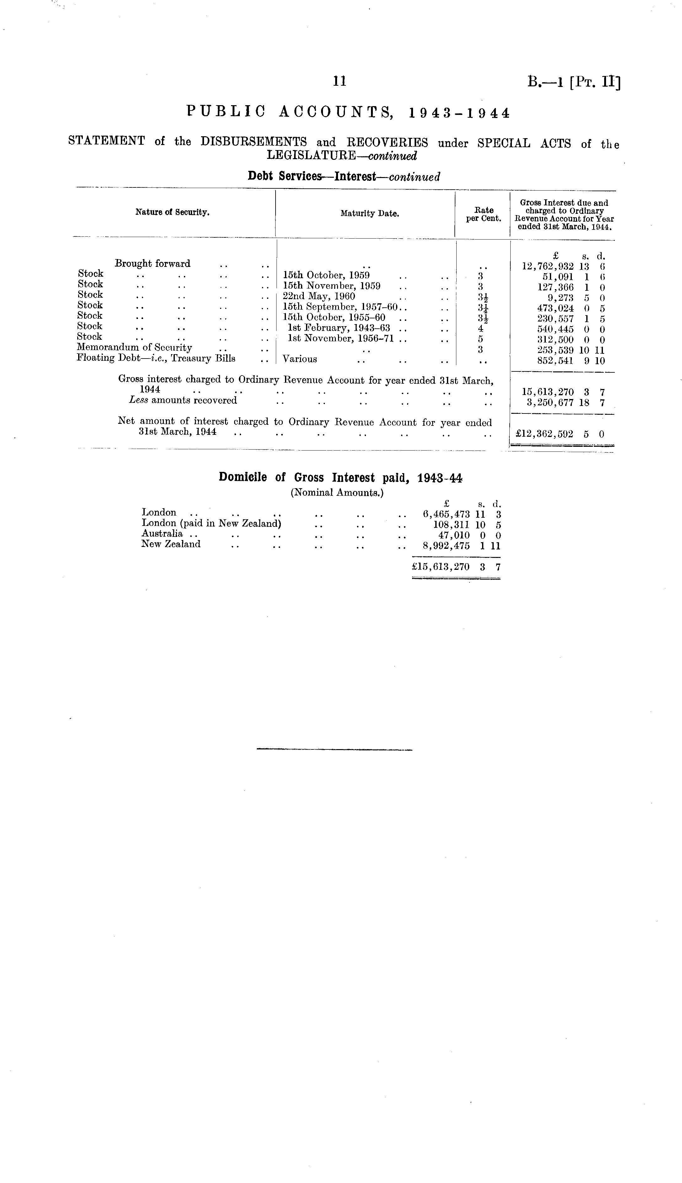 Domicile of Gross Interest paid, 1943-44 (Nominal Amounts.) £ s. d. London .. .. .. .. .. .. 6,465,473 11 3 London (paid in New Zealand) .. .. .. 108,311 10 5 Australia .. .. .. .. .. .. 47,010 0 0 New Zealand .. .. .. .. .. 8,992,475 111 £15,613,270 3 7