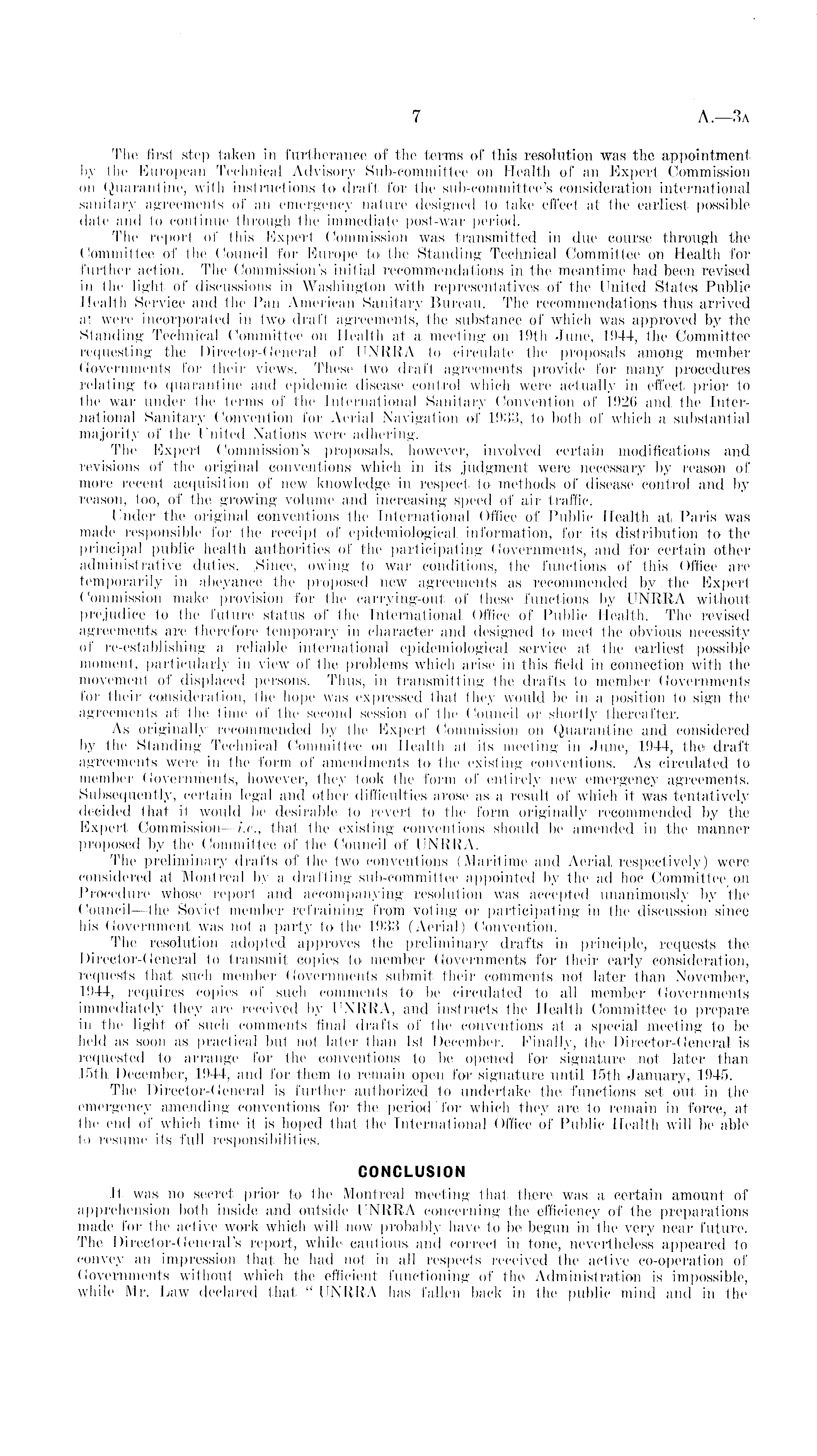 The first step taken in furtherance of the terms of this resolution was the appointment by the European Technical Advisory Sub-committee on Health of an Expert Commission on Quarantine, with instructions to draft for the sub-committee's consideration international sanitary agreements of an emergency nature designed to lake effect at the earliest possible date and to continue through the immediate post-war period. The report of this Expert Commission was transmitted in due course through the Committee of the Council for Europe to the Standing Technical Committee on Health for further action. The Commission's initial recommendations in the meantime had been revised in the light of discussions in Washington with representatives of the United States Public Health Service and the Pan American Sanitary Bureau. The recommendations thus arrived at were incorporated in two draft agreements, the substance of which was approved by the Standing Technical Committee on Health at a meeting 011 19th June, 1944, the Committee requesting the [)irector-( ien era! of UNRRA to circulate the proposals among member Governments for their views. These two draft agreements provide for many procedures relating to quarantine and epidemic disease control which were actually in effect prior to the war under the terms of the International Sanitary Convention of 1926 and, the International Sanitary Convention for Aerial Navigation of 1933, to both of which a substantial majority of the United Nations were adhering. The Expert Commission's proposals, however, involved certain modifications and revisions of the original conventions which in its judgment were necessary by reason of more recent acquisition of new knowledge in respect to methods of disease control and by reason, too, of the growing volume; find increasing speed of air traffic. Under the original conventions the International Office of Public Health at Paris was made responsible for the receipt of epidemiological information, for its distribution to the principal public health authorities of the participating Governments, and for certain other administrative duties. .Since, owing to war conditions, the functions of this Office are temporarily in abeyance the proposed new agreements as recommended by the Expert Commission make provision for the carrying-out of these functions by UNRRA withoutprejudice to the future status of the International Office of Public Health. The revised agreements are therefore temporary in character and designed to meet the obvious necessity of re-establishing a reliable international epidemiological service at the earliest possible moment, particularly in view of the problems which arise in this field in connection with the movement of displaced persons. Thus, in transmitting the drafts to member Governments for their consideration, (he hope was expressed that they would be in a position to sign the agreements at the time of the second session of the Council or shortly thereafter. As originally recommended by the Expert Commission on Quarantine and considered by the Standing Technical Committee on Health at its meeting in June, 1944, the draft agreements were in the form of amendments to the existing conventions. As circulated to member Governments, however, they took the form of entirely new emergency agreements. Subsequently, certain legal and other difficulties arose as a result of which it was tentatively decided that it would be desirable 1o revert to the form originally recommended by the Expert Commission —i.e., that the existing conventions should be amended in the manner proposed by the Committee of the Council of UNRRA. The preliminary drafts of the two conventions (Maritime and Aerial, respectively) were considered at Montreal by a drafting sub-committee appointed by the ad hoc Committee on Procedure whose report and accompanying resolution was accepted unanimously by the Council—the Soviet member refraining from voting or participating in the discussion since his Government was not a party to the 1933 (Aerial) Convention. The resolution adopted approves the preliminary drafts in principle, requests the Director-General to transmit copies to member Governments for their early consideration, requests that such member Governments submit their comments not later than November, 1944, requires copies of such comments to be circulated to all member Governments immediately they are received by UNRRA, and instructs the Health Committee to prepare in the light of such comments final drafts of the conventions at a special meeting to be held as soon as practical but not later than Ist December. Finally, the Director-General is requested to arrange for the conventions to be opened for signature not later than 15th. December, 1944, and for them to remain open for signature until 15th January, 1945. The Director-General is further authorized to undertake the functions set out in the emergency amending conventions for the period for which they are to remain in force, at the end of which time it is hoped that the International Office of Public Health will be able to resume its full responsibilities. CONCLUSION It was no secret prior to the Montreal meeting that there was a certain amount of apprehension both inside and outside UNRRA concerning the efficiency of the preparations made for the active work which will now probably have to be begun in the very near future. The Director-General's report, while cautious and correct in tone, nevertheless appeared to convey an impression that he had not in all respects received the active co-operation of Governments without which the efficient functioning of the Administration is impossible, while Mr. Law declared that " UNRRA has fallen back in the public mind and in the