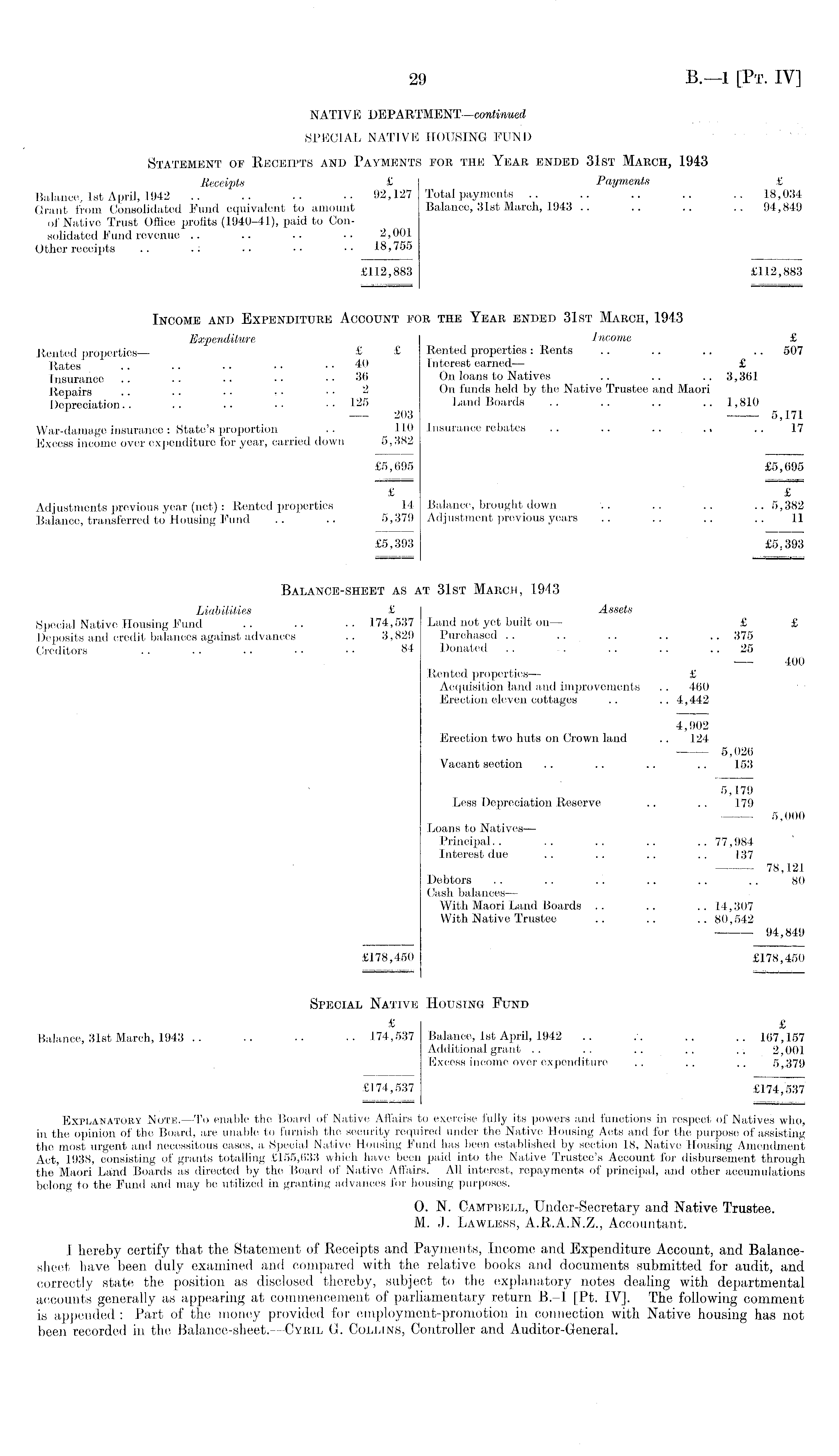 NATIVE DEPARTMENT —continued SPECIAL NATIVE HOUSING FUND Statement of Receipts and Payments for the Year ended 31st March, 1943 Receipts £ Payments £ Balance, Ist April, 1942 .. .. .. .. -92,127 Total payments .. .. .. .. .. 18,034 Grant from Consolidated Fund equivalent to amount Balance, 31st March, 1943 .. .. .. .. 04,849 of Native Trust Office profits (1940-41), paid to Consolidated Fund revenue .. .. .. • ■ 2, 001 Other receipts .. .1 ■■ 18,755 £112,883 £112,883 Income and Expenditure Account for the Year ended 31st March, 1943 Expenditure Income £ Rented properties— £ £ Rented properties: Rents .. .. .. 507 Rates .. ■. • • • ■ .. 40 Interest earned — £ Insurance .. .. .. .. ..36 On loans to Natives .. .. .. 3,361 Repairs .. .. . • ■ • . . 2 On funds held by the Native Trustee and Maori Depreciation.. .. .. •• 125 Land Boards .. .. .. ..1,810 — 203 5,171 War-damage insurance: State's proportion .. 110 Insurance rebates .. .. .. ~ .. 17 Excess income over expenditure for year, carried down 5,382 £5,695 £5,695 £ £ Adjustments previous year (net) : Rented properties 14 Balance, brought down .. .. .. .. 5,382 Balance, transferred to Housing Fund .. .. 5,379 Adjustment previous years .. .. .. .. 11 £5,393 £5.393 Balance-sheet as at 31st March, 1943 Liabilities £ Assets Special Native Housing Fund .. .. •• 174,537 Land not yet built on— £ £ Deposits and credit balances against advances .. 3,829 Purchased .. .. .. .. .. 375 Creditors .. .. .. • • ■ • 84 Donated . . . .. . . 25 400 Rented properties — £ Acquisition land and improvements .. 460 Erection eleven cottages .. .. 4,442 4,902 Erection two huts on Crown land .. 124 5,026 Vacant section .. .. .. .. 153 5,179 Less Depreciation Reserve .. .. 179 5,000 Loans to Natives— Principal.. .. .. .. .. 77,984 Interest due .. .. .. .. 137 i 78,121 Debtors . . .. . . .. .. .. 80 Cash balances — With Maori Land Boards .. .. .. 14,307 With Native Trustee .. .. .. 80,542 94,849 £178,450 £178,450 Special Native Housing Fund £ £ Balance, 31st March, 1943 .. .. •• •• 174,537 Balance, Ist April, 1942 .. . . .. .. 167,157 Additional grant .. .. .. .. . . 2,001 Excess income over expenditure .. .. 5,379 £174,537 £174,537 Explanatory Note.—To enable the Board of Native Affairs to exercise fully its powers and functions in respect of Natives who, in the opinion of the Board, are unable to furnish the security required under the Native Housing Acts and for the purpose of assisting the most urgent and necessitous cases, a Special Native Housing Fund has been established by section 18, Native Housing Amendment Act, 1938, consisting of grants totalling £155,633 which have been paid into the Native Trustee's Account for disbursement through the Maori Land Boards as directed by the Board of Native Affairs. All interest, repayments of principal, and other accumulations belong to the Fund and may be utilized in granting advances for housing purposes. O. N. Campbell, Under-Secretary and Native Trustee. M. J. Lawless, A.R.A.N.Z., Accountant. I hereby certify that the Statement of Receipts and Payments, Income and Expenditure Account, and Balancesheet have been duly examined and compared with the relative books and documents submitted for audit, and correctly state the position as disclosed thereby, subject to the explanatory notes dealing with departmental accounts generally as appearing at commencement of parliamentary return 8.1 [Pt. IV]. The following comment is appended : Part of the money provided for employment-promotion in connection with Native housing has not been recorded in the Balance-sheet. —Cyril G. Collins, Controller and Auditor-General.