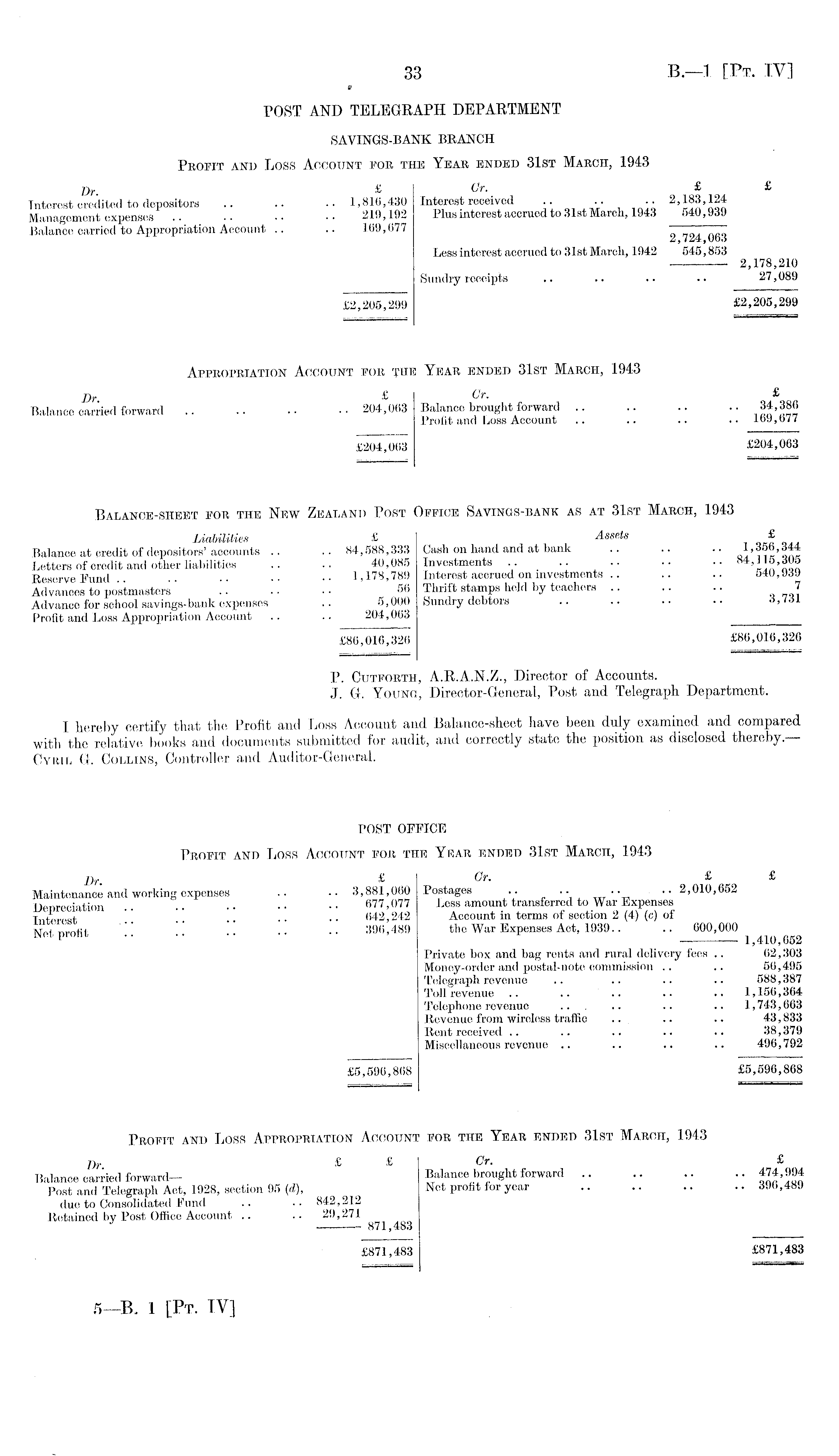 POST AND TELEGRAPH DEPARTMENT SAVINGS-BANK BRANCH Profit and Loss Account toe the Year ended 31st March, 1943 Dr £ Gr. £ £ Interest credited to depositors 1,816,430 Interest received .. ■ • •• 2,183,124 Management expenses .. .. 219,192 Plus interest accrued to 31st March, 1943 540,939 Balance carried to Appropriation Account .. .. 109,677 Z j / A 4: j UDo Less interest accrued to 31st March, 1942 54.5,853 2,178,210 Sundry receipts .. .. . • •• 27,089 £2,205,299 £2,205,299 Appropriation Account for the Year ended 31st March, 1943 j) r £ Gr. £ Balance carried forward 204,063 Balance brought forward 34,380 Profit and Loss Account .. .. .. ..169,677 £204,063 £204,063 Balance-sheet for the New Zealand Post Office Savings-bank as at 31st March, 1943 Liabilities £ £ Balance at credit of depositors'accounts .. 84,588,333 Cash on hand and at bank .. .. 1,350,344 Letters of credit and other liabilities .. .. 40,085 Investments 84,115,305 Reserve Fund .. •• 1,178,789 Interest accrued on investments .. .. .. 540,939 Advances to postmasters' 56 Thrift stamps held by teachers 7 Advance for school savings-bank expenses .. 5,000 Sundry debtors .. .. ' ' Profit and Loss Appropriation Account .. .. 204, 063 £86,016,326 £86,016,326 P. Cutforth, A.R.A.N.Z., Director of Accounts. J. G. Young, Director-General, Post and Telegraph Department. I hereby certify that the Profit and Loss Account and Balance-sheet have been duly examined and compared with, the relative books and documents submitted for audit, and correctly state the position as disclosed thereby. Cyril G. Collins, Controller and Auditor-General. POST OFFICE Profit and Loss Account for the Ykar ended 31st March, 1943 £ Gr. £ £ Maintenance and working expenses .. .. 3,881,060 Postages .. .. .. .. 2,010,652 iWwHtion .. .. •• 677,077 Less amount transferred to War Expenses Tntfirfiat " '! .. .. .. 642,242 Account in terms of section 2 (4) (c) of Ttfrf nrnfit " ... 396,489 the War Expenses Act, 1939.. .. 600,000 JNet proni .. •• 1,410,652 Private box and bag rents and rural delivery fees .. 62,303 Money-order and postal-note commission .. .. 56,495 Telegraph revenue .. .. .. .. 588,387 Toll revenue .. .. .. .. .. 1,156,364 Telephone revenue .. .. 1,743,663 Revenue from wireless traffic .. .. .. 43,833 Rent received .. .. .. .. .. 38,379 Miscellaneous revenue .. .. .. .. 496,792 £5,596,868 £5,596,868 Profit and Loss Appropriation Account for the Year ended 31st March, 1943 J) r £ £ Gr. £ Balance carried forward- Balance brought forward 474,994 Post apd Telegraph Act, 1928, section 95 (d), Net profit for year .. .. .. ..396,489 due to Consolidated Fund .. •• 842,212 Retained by Post Office Account .. .. 29,271 — 871,483 £871,483 £871,483
