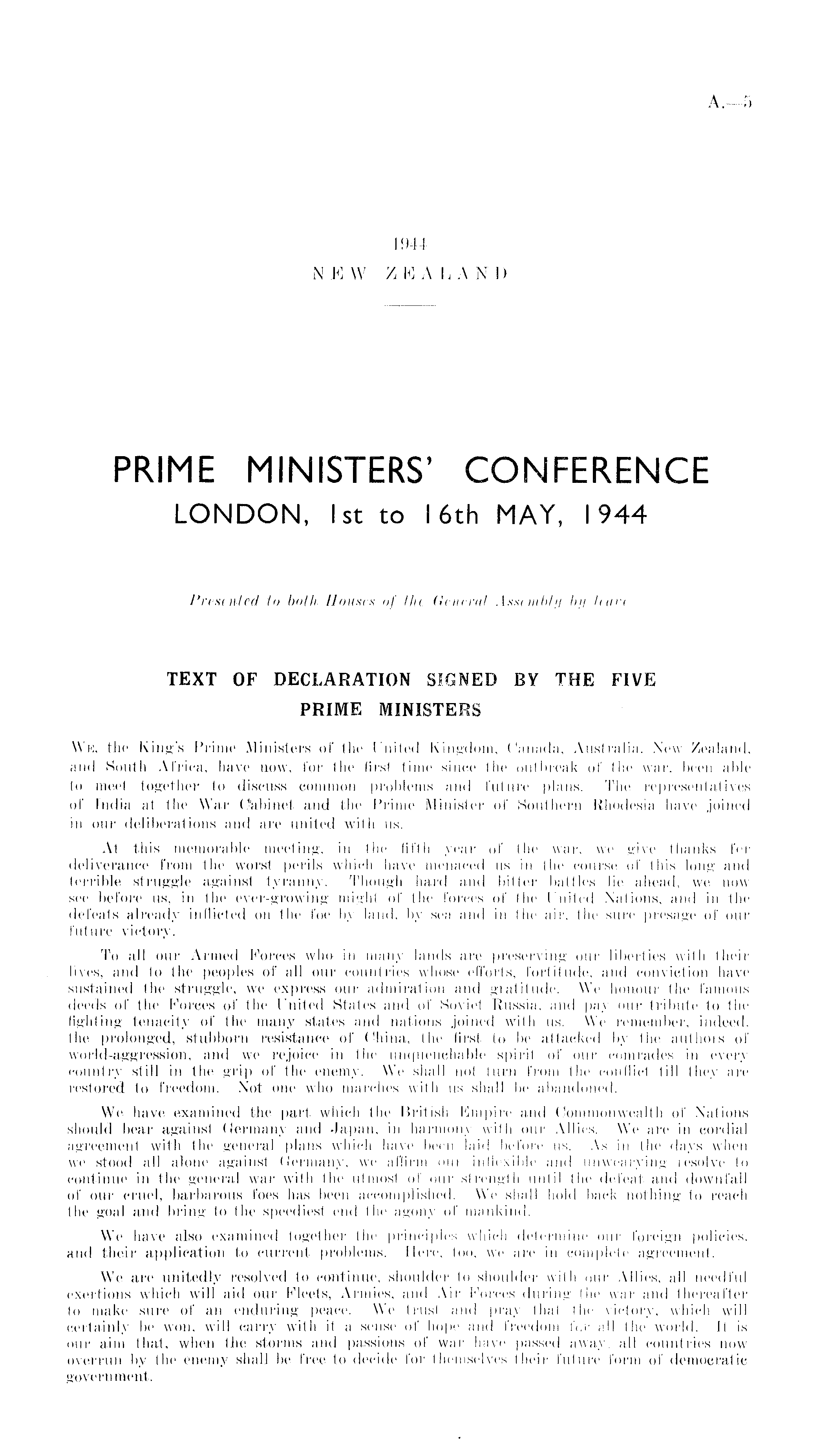 TEXT OF DECLARATION SIGNED BY THE FIVE PRIME MINISTERS We, the King's Prime Ministers of the United Kingdom, Canada, Australia, New Zealand, and South Africa, have now, for the first time since the outbreak of the war, been able to meet together to discuss common problems and future plans. The representatives of India at the War Cabinet and the Prime Minister of Southern Rhodesia have joined in our deliberations and are united with us. At this memorable meeting, in the fifth year of the war, we give thanks for deliverance from the worst perils which have menaced us in the course of this long and terrible struggle against tyranny. Though hard and bitter battles lie ahead, we now see before us, in the ever-growing might of the forces of the United Nations, and in the defeats already inflicted on the foe by land, by sea. and in the air, the sure presage of our future victory. To all our Armed Forces who in many lands are preserving our liberties with their lives, and to the peoples of all our countries whose efforts, fortitude, and conviction have sustained the struggle, we express our admiration and gratitude. We honour the famous deeds of the Forces of the United States and of Soviet Russia, and pay our tribute to the fighting tenacity of the many states and nations joined with us. We remember, indeed, the prolonged, stubborn resistance of China, the first to be attacked by the authors of world-aggression, and we rejoice in the unquenchable spirit of our comrades in every country still in the grip of the enemy. We shall not turn from the conflict till they are restored to freedom. Not one who marches with us shall be abandoned. We have examined the part which the British Empire and Commonwealth of Nations should bear against Germany and Japan, in harmony with our Allies. We are in cordial agreement with the general plans which have been laid before us. As in the days when we stood all alone against Germany, we affirm our inflexible and unwearying resolve to continue in the general war with the utmost of our strength until the defeat and downfall of our cruel, barbarous foes has been accomplished. We shall hold back nothing to reach the goal and bring to the speediest end the agony of mankind. We have also examined together the principles which determine our foreign policies, and their application to current problems. Here, too, we are in complete agreement. We are unitedly resolved to continue, shoulder to shoulder with our Allies, all needful exertions which will aid our Fleets, Armies, and Air Forces during the war and thereafter to make sure of an enduring peace. We trust and pray that the victory, which will certainly be won, will carry with it a sense of hope and freedom for all the world. It is our aim that, when the storms and passions of war have passed away, all countries now overran by the enemy shall be free to decide for themselves their future form of democratic government.