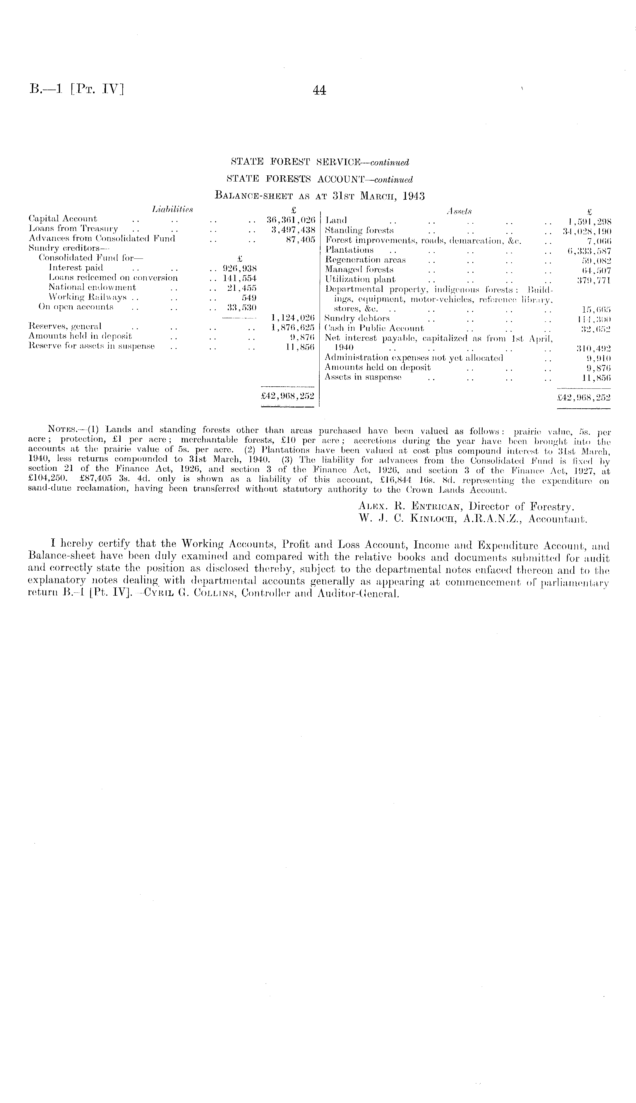 STATE FOREST SERVlCE—continued STATE FORESTS ACCOUNT—continued Balance-sheet as at 31st March, 1943 Liabilities £ Assets £ Capital Account .. .. .. .. 36,361,026 Land .. .. .. .. .. 1,091,298 Loans from Treasury .. .. .. .. 3,497,438 Standing forests .. .. .. .. 34'028'190 Advances from Consolidated Fund .. .. 87,405 Forest improvements, roads, demarcation, &c. .. 7,066 Sundry creditors— Plantations .. .. .. .. .. 6,333,587 Consolidated Fund for— £ Regeneration areas .. .. .. .. 59,082 Interest paid .. .. 926,938 Managed forests .. .. .. .. 64,507 Loans redeemed on conversion .. 141,554 Utilization plant .. .. .. .. 379^771 National endowment .. .. 21,455 Departmental property, indigenous forests: BuildWorking Railways .. . . . . 549 ingg, equipment, motor-vehicles, reference library, On open accounts .. .. .. 33,530 stores, &c. .. .. .. .. .. 15,665 ■ 1,124,026 Sundry debtors .. .. .. .. 114,300 Reserves, general .. .. .. .. 1,876,625 Cash in Public Account .. .. .. 32,652 Amounts held in deposit .. .. .. 9,876 Net interest payable, capitalized as from Ist April, Reserve for assets in suspense .. .. .. 11,856 1940 .. .. .. 310 492 Administration expenses not yet allocated .. 9,910 Amounts held on deposit .. .. .. 9,876 Assets in suspense . . .. . . ~ 11,856 £42,968,252 £42,968,252 Notes.—(l) Lands and standing forests other than areas purchased have been valued as follows : prairie value, ss. per acre; protection, £1 per acre; merchantable forests, £10 per acre; accretions during the year have been brought into the accounts at the prairie value of ss. per acre. (2) Plantations have been valued at cost plus compound interest to 31st March, 1940, less returns compounded to 31st March, 1940. (3) The liability for advances from the Consolidated Fund is fixed by section 21 of the Finance Act, 1926, and section 3 of the Finance Act, 1926, and section 3 of the Finance Act, 1927, at £104,250. £87,405 3s. 4d. only is shown as a liability of this account, £16,844 1 68. Bd. representing the expenditure 011 sand-dune reclamation, having been transferred without statutory authority to the Crown Lands Account. Alex. E. Entrican, Director of Forestry. W. J. C. Kinlocii, A.E.A.N.Z., Accountant. I hereby certify that the Working Accounts, Profit and Loss Account, Income and Expenditure Account, and Balance-sheet have been duly examined and compared with the relative books and documents submitted for audit and correctly state the position as disclosed thereby, subject to the departmental notes enfaced thereon and to the explanatory notes dealing with departmental accounts generally as appearing at commencement of parliamentary return 8.-l [Pt. IV].— Cyril G. Collins, Controller and Auditor-General.