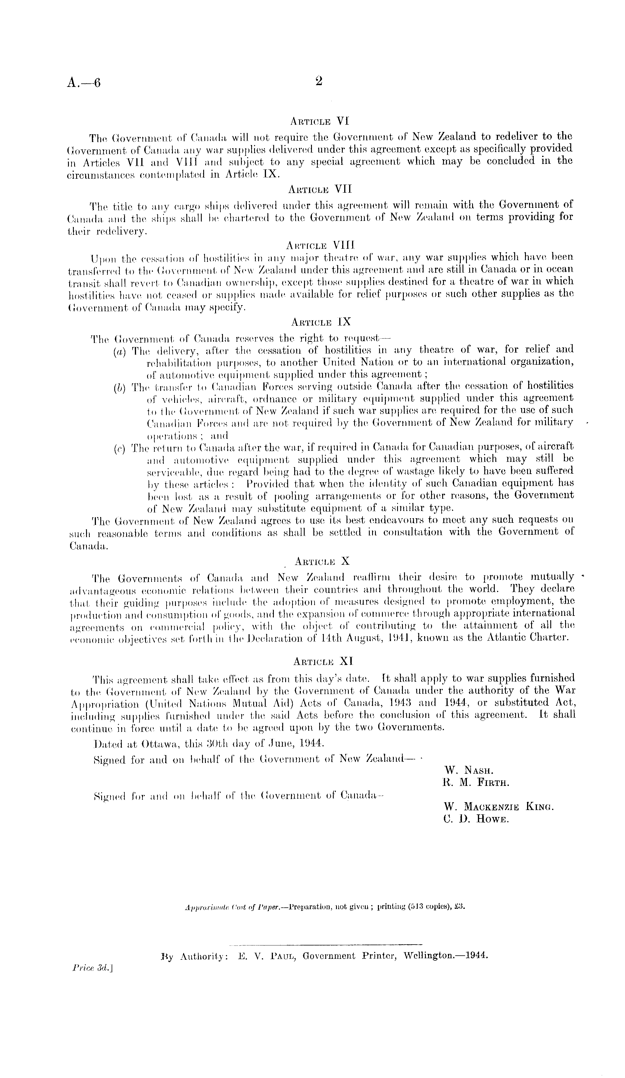 Article VI The Government of Canada will not require the Government of New Zealand to redeliver to the Government of Canada any war supplies delivered under this agreement except as specifically provided in Articles YII and VIII and subject to any special agreement which may be concluded in the circumstances contemplated in Article IX. Article VII The title to any cargo ships delivered under this agreement will remain with the Government of Canada and the ships shall be chartered to the Government of New Zealand on terms providing for their redelivery. Article VIII Upon the cessation of hostilities in any major theatre of war, any war supplies which have been transferred to the Government of New Zealand under this agreement and are still in Canada or in ocean transit shall revert to Canadian ownership, except those supplies destined for a theatre of war in which hostilities have not ceased or supplies made available for relief purposes or such other supplies as the Government of Canada may specify. Article IX The Government of Canada reserves the right to request — (a) The delivery, after the cessation of hostilities in any theatre of war, for relief and rehabilitation purposes, to another United Nation or to an international organization, of automotive equipment supplied under this agreement; (b) The transfer to Canadian Forces serving outside Canada after the cessation of hostilities of vehicles, aircraft, ordnance or military equipment supplied under this agreement to the Government of New Zealand if such war supplies are required for the use of such Canadian Forces and are not required by the Government of New Zealand for military operations ; and (c) The return to Canada after the war, if required in Canada for Canadian purposes, of aircraft and automotive equipment supplied under this agreement which may still be serviceable, due regard being had to the degree of wastage likely to have been suffered by these articles : Provided that when the identity of such Canadian equipment has been lost as a result of pooling arrangements or for other reasons, the Government of New Zealand may substitute equipment of a similar type. The Government of New Zealand agrees to use its best endeavours to meet any such requests on such reasonable terms and conditions as shall be settled in consultation with the Government of Canada. Article X The Governments of Canada and New Zealand reaffirm their desire to promote mutually advantageous economic relations between their countries and throughout the world. They declare that their guiding purposes include the adoption of measures designed to promote employment, the production and consumption of goods, and the expansion of commerce through appropriate international agreements on commercial policy, with the object of contributing to the attainment of all the economic objectives set forth in the Declaration of 14th August, 1941, known as the Atlantic Charter. Article XI This agreement shall take effect as from this day's date. It shall apply to war supplies furnished to the Government of Now Zealand by the Government of Canada under the authority of the War Appropriation (United Nations Mutual Aid) Acts of Canada, 1943 and 1944, or substituted Act, including supplies furnished under the said Acts before the conclusion of this agreement. It shall continue in force until a date to be agreed upon by the two Governments. Dated at Ottawa, this 30th day of June, 1944. Signed for and on behalf of the Government of New Zealand —• • W. Nash. R. M. Firth. Signed for and on behalf of the Government of Canada— W. Mackenzie King. C. D. Howe.