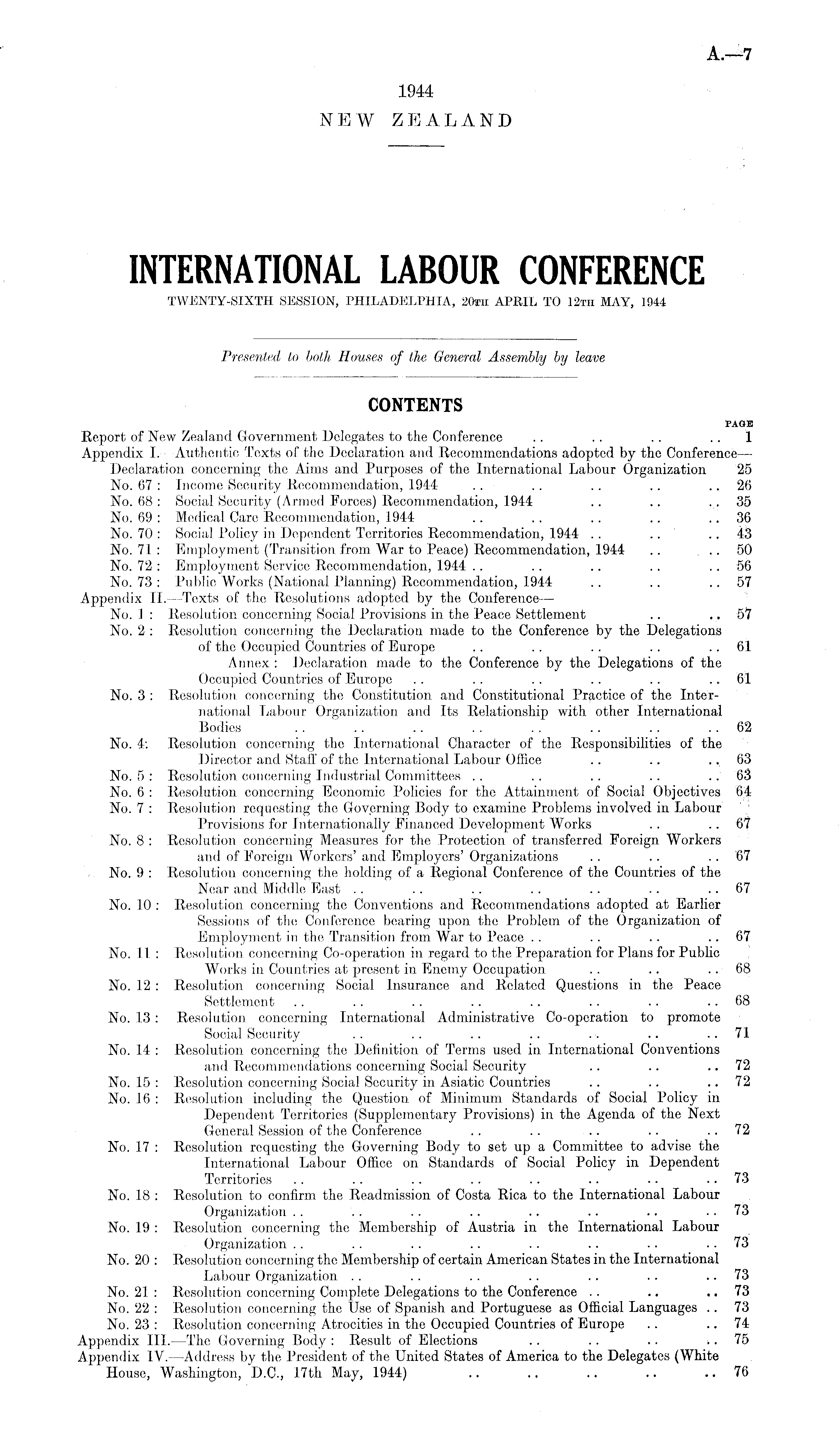 INTERNATIONAL LABOUR CONFERENCE TWENTY-SIXTH SESSION, PHILADELPHIA, 20th APRIL TO 12th MAY, 1944
