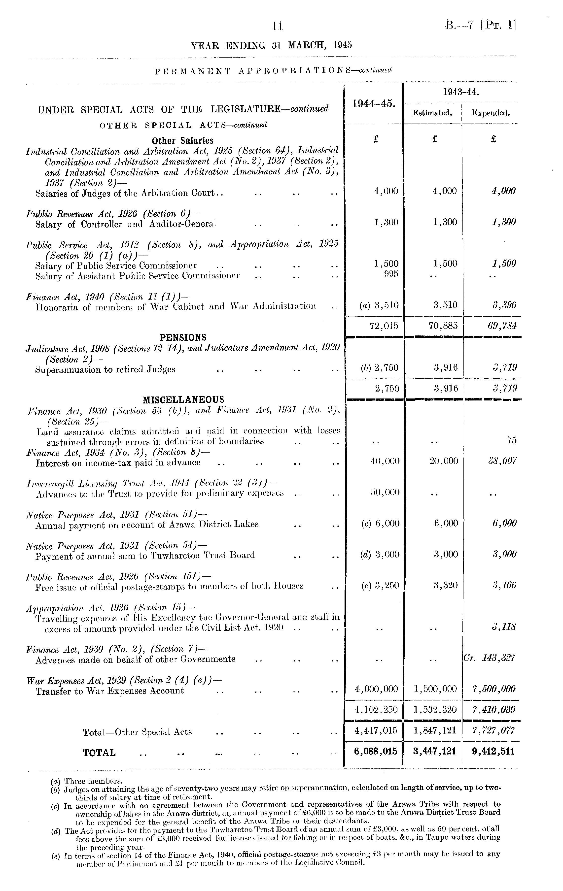 1943-44. UNDER SPECIAL ACTS OF THE LEGISLATURE—continued 1944-45. Expended. OTHER SPECIAL A C T S—continued Other Salaries £ £ £ Industrial Conciliation and Arbitration Act, 1925 (Section 64), Industrial Conciliation and Arbitration Amendment Act (No. 2), 1937 (Section 2), and Industrial Conciliation and Arbitration Amendment Act (No. 3), 1937 (Section 2) — Salaries of Judges of the Arbitration Court.. .. .. •• 4,000 4,000 4,000 Public Revenues Act, 1926 (Section 6) — Salary of Controller and Auditor-General .. •• 1,300 1,300 1,300 Public Service Act, 1912 (Section 8), and Appropriation Act, 1925 (Section 20 (1) (a)) — Salary of Public Service Commissioner .. .. .. .. 1,500 1,500 1,500 Salary of Assistant Public Service Commissioner .. .. .. 995 Finance Act, 1940 (Section 11 (1)) — Honoraria of members of War Cabinet and War Administration .. (a) 3,510 3,510 3,396 72,015 70,885 69,784 PENSIONS —— — — Judicature Act, 1908 (Sections 12-14), and Judicature Amendment Act, 1920 (Section 2) — Superannuation to retired Judges .. .. •• •• (6) 2,750 3,916 3,719 2,750 3,916 3,719 MISCELLANEOUS —- Finance Act, 1930 (Section 53 (b)), and Finance Act, 1931 (No. 2), (Section 25) — Land assurance claims admitted and paid in connection with losses sustained through errors in definition of boundaries .. .. .. . ■ 75 Finance Act, 1934 (No. 3), (Section 8) — Interest on income-tax paid in advance .. .. .. .. 40,000 20,000 38,007 Invercargill Licensing Trust Act, 1944 (Section 22 (3)) — Advances to the Trust to provide for preliminary expenses .. .. 50,000 Native Purposes Act, 1931 (Section 51) — Annual payment on account of Arawa District Lakes .. .. (c) 6,000 6,000 6,000 Native Purposes Act, 1931 (Section 54) — Payment of annual sum to Tuwharetoa Trust Board .. .. (d) 3,000 3,000 3,000 Public Revenues Act, 1926 (Section 151) — Free issue of official postage-stamps to members of both Houses .. (e) 3,250 3,320 3,166 Appropriation Act, 1926 (Section 15) — Travelling-expenses of His Excellency the Governor-General and staff in excess of amount provided under the Civil List Act, 1920 .. .. .. .. 3,118 Finance Act, 1930 (No. 2), (Section 7) — Advances made on behalf of other Governments .. .. .. .. .. Cr. 143,327 War Expenses Act, 1939 (Section 2 (4) (e) ) — Transfer to War Expenses Account .. .. •• •. 4,000,000 1,500,000 7,500,000 4,102,250 1,532,320 7,410,039 Total-Other Special Acts 4,417,015 1,847,121 7,727,077 TOTAL 6,088,015 j 3,447,121 9,412,511