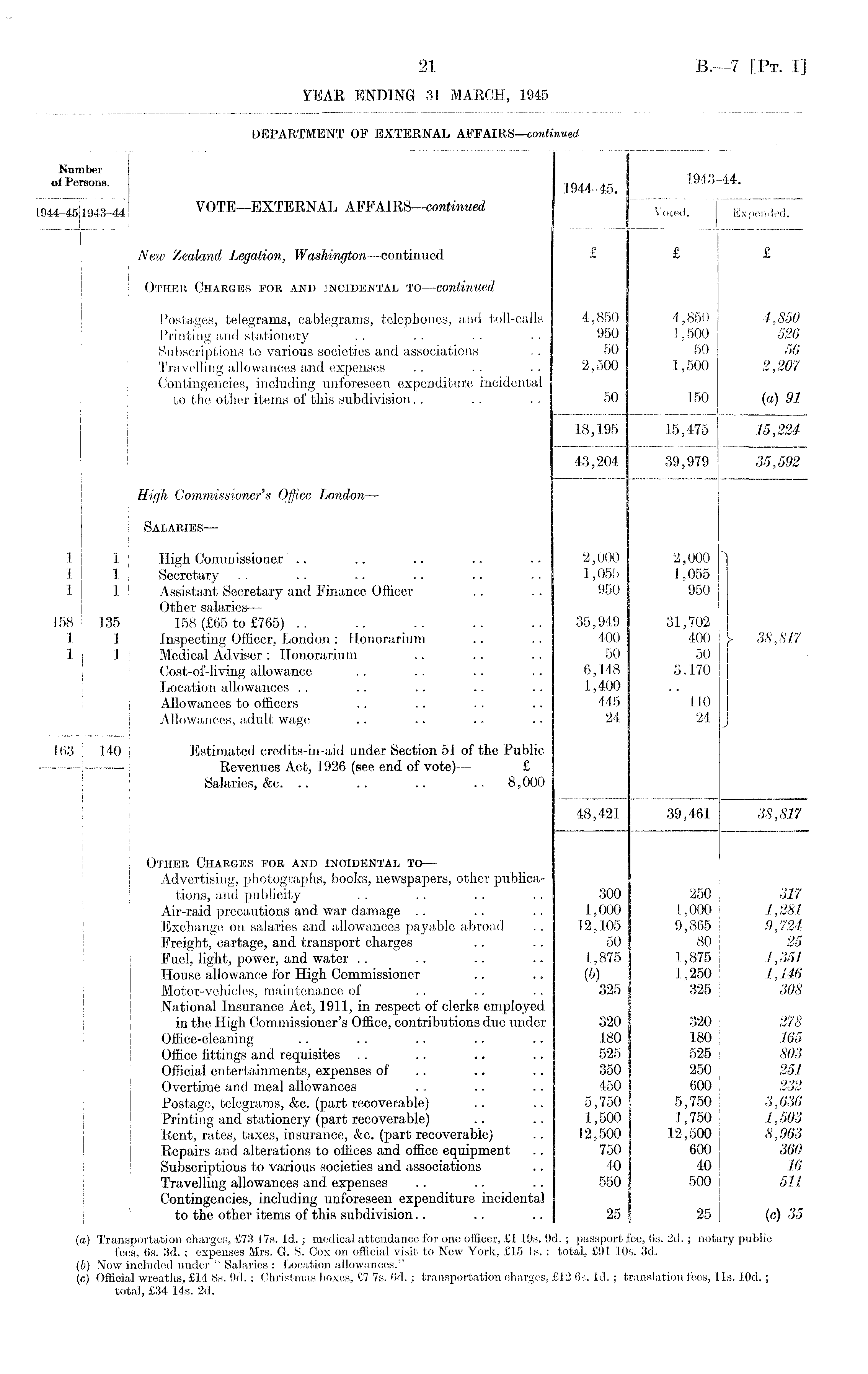Number of Persons. 1911 15 1943-4:4. 1944—451943-44 VOTE—EXTERNAL AFFAIRS continued Voted. ~| Expended. New Zealand Legation, Washington—continued £ £ £ Other Charges for and incidental to —continued Postages, telegrams, cablegrams, telephones, and toll-calls 4,850 4,850 4,850 Printing and stationery .. .. .. .. 950 1,500 526 Subscriptions to various societies and associations .. 50 50 56 Travelling allowances and expenses .. .. .. 2,500 1,500 2,207 Contingencies, including unforeseen expenditure incidental to the other items of this subdivision.. .. .. 50 150 (a) 91 18,195 15,475 15,224 43,204 39,979 35,592 | High Commissioner's Office London — | Salaries — 1 1 | High Commissioner .. .. .. .. .. 2,000 2,000 1 1 j Secretary .. .. .. .. .. .. 1,055 1,055 1 1 Assistant Secretary and Finance Officer .. .. 950 950 OT* OQIQTIOQ™— 158 135 158 (£65 to £765) 35,949 31,702 1 1 Inspecting Officer, London.: Honorarium .. .. 400 400 38,817 1 1 | Medical Adviser: Honorarium .. .. .. 50 50 Cost-of-living allowance .. .. .. .. 6,148 3,170 Location allowances .. .. .. .. .. 1,400 Allowances to officers .. .. .. .. 445 110 Allowances, adult wage .. .. .. .. 24 24 163 140 | Estimated credits-in-aid under Section 51 of the Public Revenues Act, 1926 (see end of vote) — £ Salaries, &c. .. .. .. .. 8,000 48,421 39,461 38,817 Other Charges for and incidental to — Advertising, photographs, books, newspapers, other publications, and publicity .. .. .. .. 300 250 317 Air-raid precautions and war damage .. .. .. 1,000 1,000 1,281 Exchange on salaries and allowances payable abroad .. 12,105 9,865 9,724 Freight, cartage, and transport charges .. .. 50 80 25 Fuel, light, power, and water .. .. .. .. 1,875 1,875 1,351 House allowance for High Commissioner .. .. (b) 1,250 1,146 Motor-vehicles, maintenance of .. .. .. 325 325 308 National Insurance Act, 1911, in respect of clerks employed in the High Commissioner's Office, contributions due under 320 320 278 Office-cleaning .. .. .. .. .. 180 180 .165 Office fittings and requisites .. .. .. .. 525 525 803 Official entertainments, expenses of .. .. .. 350 250 251 Overtime and meal allowances .. .. .. 450 600 232 Postage, telegrams, &c. (part recoverable) .. .. 5,750 5,750 3,636 Printing and stationery (part recoverable) .. .. 1,500 1,750 1,503 Rent, rates, taxes, insurance, &c. (part recoverable) .. 12,500 12,500 8,963 Repairs and alterations to offices and office equipment .. 750 600 360 Subscriptions to various societies and associations .. 40 40 16 Travelling allowances and expenses .. .. .. 550 500 511 Contingencies, including unforeseen expenditure incidental to the other items of this subdivision.. .. .. 25 25 (c) 35