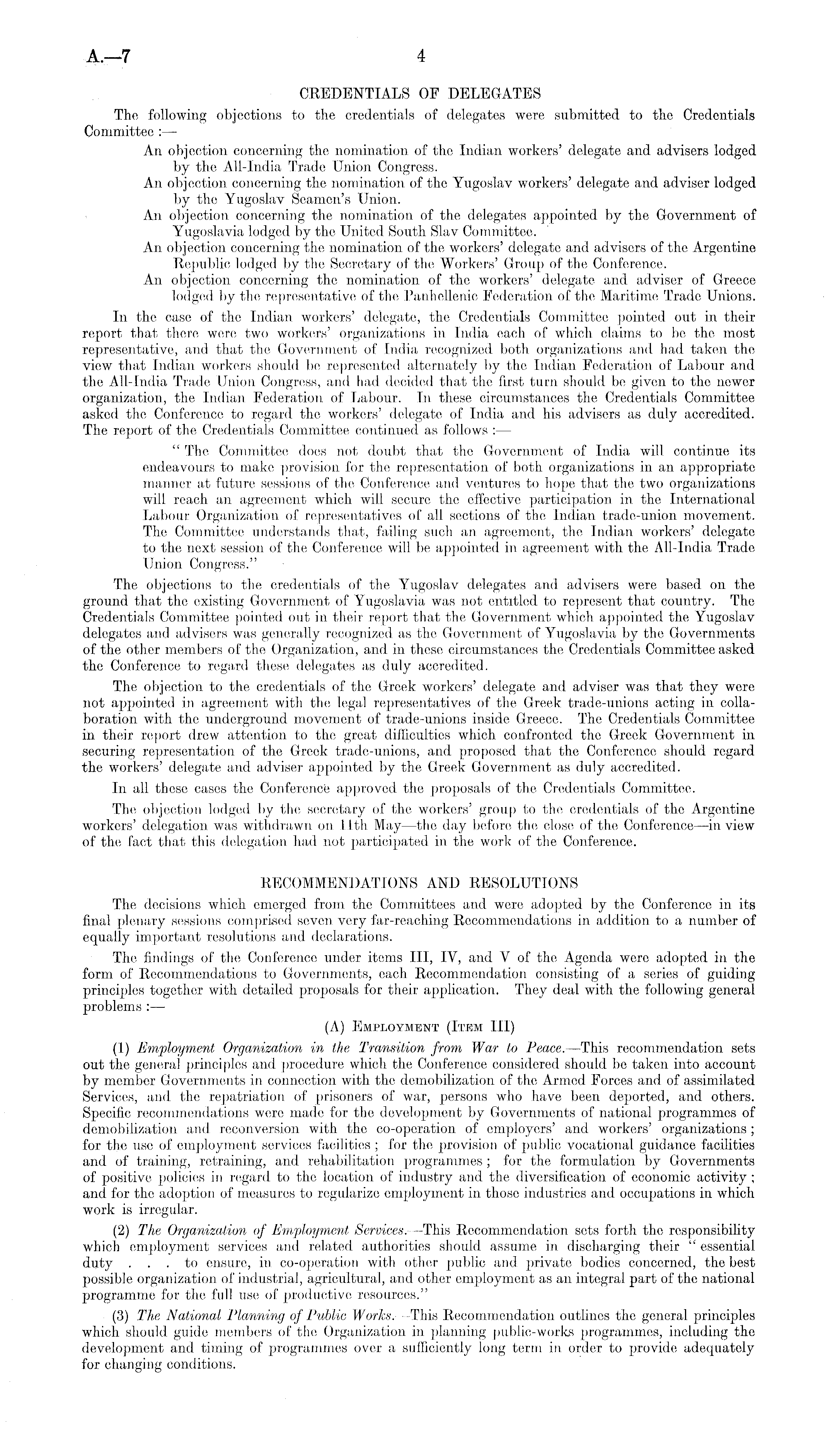 CREDENTIALS OE DELEGATES The following objections to the credentials of delegates were submitted to the Credentials Committee :— An objection concerning the nomination of the Indian workers' delegate and advisers lodged by the All-India Trade Union Congress. An objection concerning the nomination of the Yugoslav workers' delegate and adviser lodged by the Yugoslav Seamen's Union. An objection concerning the nomination of the delegates appointed by the Government of Yugoslavia lodged by the United South Slav Committee. An objection concerning the nomination of the workers' delegate and advisers of the Argentine Republic lodged by the Secretary of the Workers' Group of the Conference. An objection concerning the nomination of the workers' delegate and adviser of Greece lodged by the representative of the Panhellenic Federation of the Maritime Trade Unions. In the case of the Indian workers' delegate, the Credentials Committee pointed out in their report that there were two workers' organizations in India each of which claims to be the most representative, and that the Government of India recognized both organizations and had taken the view that Indian workers should be represented alternately by the Indian Federation of Labour and the All-India Trade Union Congress, and had decided that the first turn should be given to the newer organization, the Indian Federation of Labour. In these circumstances the Credentials Committee asked the Conference to regard the workers' delegate of India and his advisers as duly accredited. The report of the Credentials Committee continued as follows :— " The Committee does not doubt that the Government of India will continue its endeavours to make provision for the representation of both organizations in an appropriate manner at future sessions of the Conference and ventures to hope that the two organizations will reach an agreement which will secure the effective participation in the International Labour Organization of representatives of all sections of the Indian trade-union, movement. The Committee understands that, failing such an agreement, the Indian workers' delegate to the next session of the Conference will be appointed in agreement with the All-India Trade Union Congress." The objections to the credentials of the Yugoslav delegates and advisers were based on the ground that the existing Government of Yugoslavia was not entitled to represent that country. The Credentials Committee pointed out in their report that the Government which appointed the Yugoslav delegates and advisers was generally recognized as the Government of Yugoslavia by the Governments of the other members of the Organization, and in these circumstances the Credentials Committee asked the Conference to regard these delegates as duly accredited. The objection to the credentials of the Greek workers' delegate and adviser was that they were not appointed in agreement with the legal representatives of the Greek trade-unions acting in collaboration with the underground movement of trade-unions inside Greece. The Credentials Committee in their report drew attention to the great difficulties which confronted the Greek Government in securing representation of the Greek trade-unions, and proposed that the Conference should regard the workers' delegate and adviser appointed by the Greek Government as duly accredited. In all these cases the Conference approved the proposals of the Credentials Committee. The objection lodged by the secretary of the workers' group to the credentials of the Argentine workers' delegation was withdrawn on 11th May —the day before the close of the Conference —in view of the fact that this delegation had not participated in the work of the Conference. RECOMMENDATIONS AND RESOLUTIONS The decisions which emerged from the Committees and were adopted by the Conference in its final plenary sessions comprised seven very far-reaching Recommendations in addition to a number of equally important resolutions and declarations. The findings of the Conference under items 111, IV, and V of the Agenda wore adopted in the form of Recommendations to Governments, each Recommendation consisting of a series of guiding principles together with detailed proposals for their application. They deal with the following general problems : — (A) Employment (Item III) (1) Employment Organization in the Transition from War to Peace.—This recommendation sets out the general principles and procedure which the Conference considered should be taken into account by member Governments in connection with the demobilization of the Armed Forces and of assimilated Services, and the repatriation of prisoners of war, persons who have been deported, and others. Specific recommendations were made for the development by Governments of national programmes of demobilization and reconversion with the co-operation of employers' and workers' organizations ; for the use of employment services facilities ; for the provision of public vocational guidance facilities and of training, retraining, and rehabilitation programmes ; for the formulation by Governments of positive policies in regard to the location of industry and the diversification of economic activity ; and for the adoption of measures to regularize employment in those industries and occupations in which work is irregular. (2) The Organization of Employment Services. —This Recommendation sets forth the responsibility which employment services and related authorities should assume in discharging their " essential duty ... to ensure, in co-operation with other public and private bodies concerned, the best possible organization of industrial, agricultural, and other employment as an integral part of the national programme for the full use of productive resources." (3) The National Planning of Public Works.--This Recommendation outlines the general principles which should guide members of the Organization in planning public-works programmes, includ