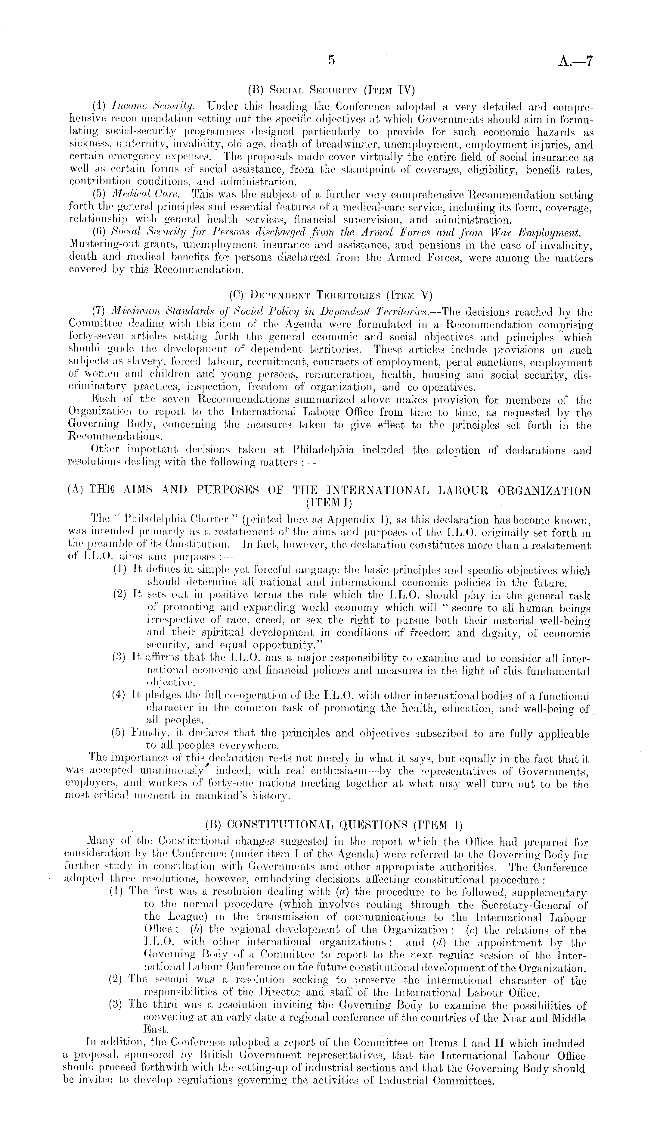 (B) Social Security (Item IV) (4) Income Security. -Under this heading the Conference adopted a very detailed and comprehensive recommendation setting out the specific objectives at which Governments should aim in formulating social-security programmes designed particularly to provide for such economic hazards as sickness, maternity, invalidity, old age, death of breadwinner, unemployment, employment injuries, and certain emergency expenses. The proposals made cover virtually the entire field of social insurance as well as certain forms of social assistance, from the standpoint of coverage, eligibility, benefit rates, contribution conditions, and administration. (5) Medical Care.—This was the subject of a further very comprehensive Recommendation setting forth the general principles and essential features of a medical-care service, including its form, coverage, relationship with general health services, financial supervision, and administration. (6) Social Security for Persons discharged from the Armed Forces and from War Employment.— Mustering-out grants, unemployment insurance and assistance, and pensions in the case of invalidity, death and medical benefits for persons discharged from the Armed Forces, were among the matters covered by this Recommendation. (0) Dependent Territories (Item V) (7) Minimum Standards of Social Policy in Dependent Territories. —The decisions reached by the Committee dealing with this item of the Agenda were formulated in a Recommendation comprising forty-seven articles setting forth the general economic and social objectives and principles which should guide the development of dependent territories. These articles include provisions on such subjects as slavery, forced labour, recruitment, contracts of employment, penal sanctions, employment of women and children and young persons, remuneration, health, housing and social security, discriminatory practices, inspection, freedom of organization, and co-operatives. Each of the seven Recommendations summarized above makes provision for members of the Organization to report to the International Labour Office from time to time, as requested by the Governing Body, concerning the measures taken to give effect to the principles set forth in the Recommendations. Other important decisions taken at Philadelphia included the adoption of declarations and resolutions dealing with the following matters :— (A) THE AIMS AND PURPOSES OF THE INTERNATIONAL LABOUR ORGANIZATION (ITEM I) The " Philadelphia Charter " (printed here as Appendix I), as this declaration has become known, was intended primarily as a restatement of the aims and purposes of the 1.L.0. originally set forth in the preamble of its Constitution. In fact, however, the declaration constitutes more than a restatement of 1.L.0. aims and purposes : — (1) It defines in simple yet forceful language the basic principles and specific objectives which should determine all national and international economic policies in the future. (2) It sets out in positive terms the role which the 1.L.0. should play in the general task of promoting and expanding world economy which will " secure to all human beings irrespective of race, creed, or sex the right to pursue both their material well-being and their spiritual development in conditions of freedom and dignity, of economic security, and equal opportunity." (3) It affirms that the 1.L.0. has a major responsibility to examine and to consider all international economic and financial policies and measures in the light of this fundamental objective. (4) It pledges the full co-operation of the 1.L.0. with other international bodies of a functional character in the common task of promoting the health, education, and' well-being of all peoples. . (5) Finally, it declares that the principles and objectives subscribed to are fully applicable to all peoples everywhere. The importance of rests not merely in what it says, but equally in the fact that it was accepted unanimously indeed, with real enthusiasm —by the representatives of Governments, employers, and workers of forty-one nations meeting together at what may well turn out to be the most critical moment in mankind's history. (B) CONSTITUTIONAL QUESTIONS (ITEM I) Many of the Constitutional changes suggested in the report which the Office had prepared for consideration by the Conference (under item I of the Agenda) were referred to the Governing Body for further study in consultation with Governments- and other appropriate authorities. The Conference adopted three resolutions, however, embodying decisions affecting constitutional procedure :— (1) The first was a resolution dealing with (a) the procedure to be followed, supplementary to the normal procedure (which involves routing through the Secretary-General of the League) in the transmission of communications to the International Labour Office ; (b) the regional development of the Organization ; (c) the relations of the 1.L.0. with other international organizations; and (d) the appointment by the Governing Body of a Committee to report to the next regular session of the International Labour Conference on the future constitutional development of the Organization. (2) The second was a resolution seeking to preserve the international character of the responsibilities of the Director and staff of the International Labour Office. (3) The third was a resolution inviting the Governing Body to examine the possibilities of convening at an early date a regional conference of the countries of the Near and Middle East. In addition, the Conference adopted a report of the Committee on Items I and II which included a proposal, sponsored by British Government representatives, that the International Labour Office should proceed forthwith with the setting-up of industrial sections and that the Governing Body should be invited to develop regulations governing the activities of Industrial Committees.