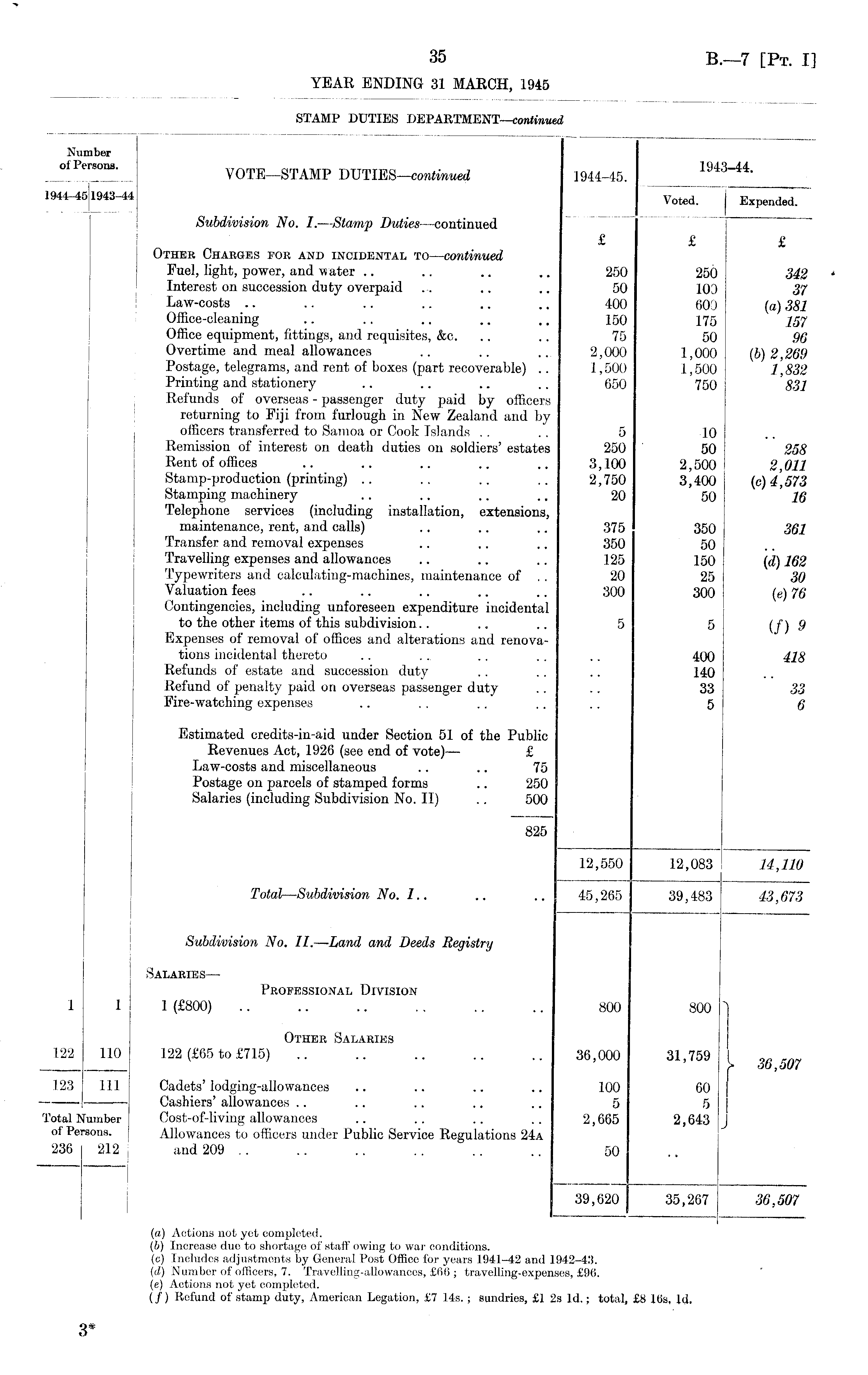 (а) Actions not yet completed. (б) Increase due to shortage of staff owing to war conditions. (c) Includes adjustments by General Post Office for years 1941-42 and 1942-41!. (d) Number of officers, 7. Travelling-allowances, £66 ; travelling-expenses, £96. (e) Actions not yet completed. (/) Refund of stamp duty, American Legation, £7 145.; sundries, £1 2s Id.; total, £8 16s, 14.