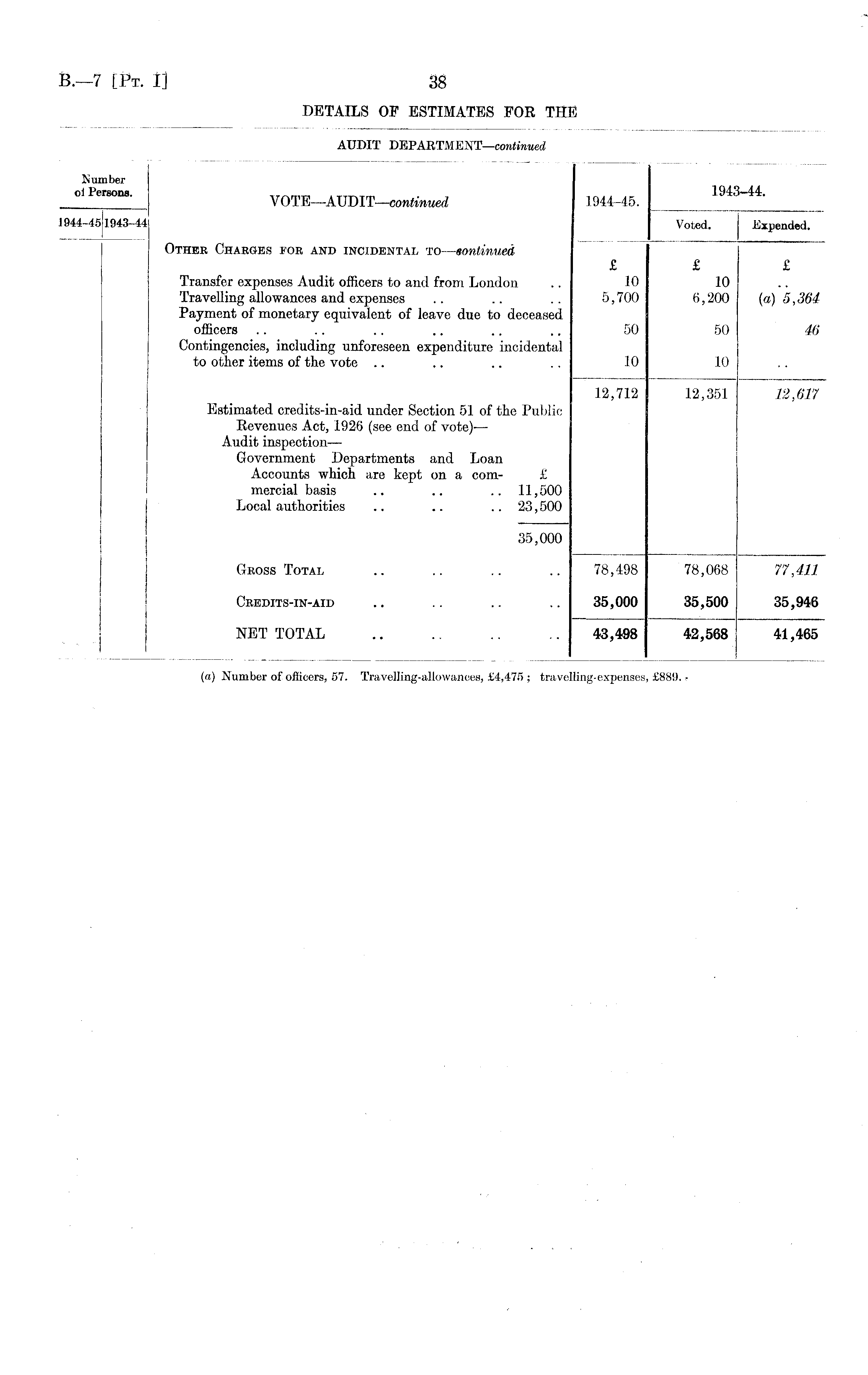 Number 01 PerSODS ' VOTE—AUDIT—continued 1944-45. 1943-44. 1944-451943-44 Voted. Expended. Other Charges for and incidental to —sontinued £ £ £ Transfer expenses Audit officers to and from London .. 10 10 Travelling allowances and expenses .. .. .. 5,700 6,200 (a) 5,364 Payment of monetary equivalent of leave due to deceased officers .. .. .. .. .. .. 50 50 46 Contingencies, including unforeseen expenditure incidental to other items of the vote .. .. .. .. 10 10 12,712 12,351 12,617 Estimated credits-in-aid under Section 51 of the Public Revenues Act, 1926 (see end of vote)— Audit inspection— Government Departments and Loan Accounts which are kept on a com- £ mercial basis .. .. .. 11,500 Local authorities .. .. .. 23,500 35,000 Gross Total .. .. .. .. 78,498 78,068 77,411 Credits-in-aid .. .. .. 35,000 35,500 35,946 NET TOTAL .. .. .. 43,498 42,568 41,465