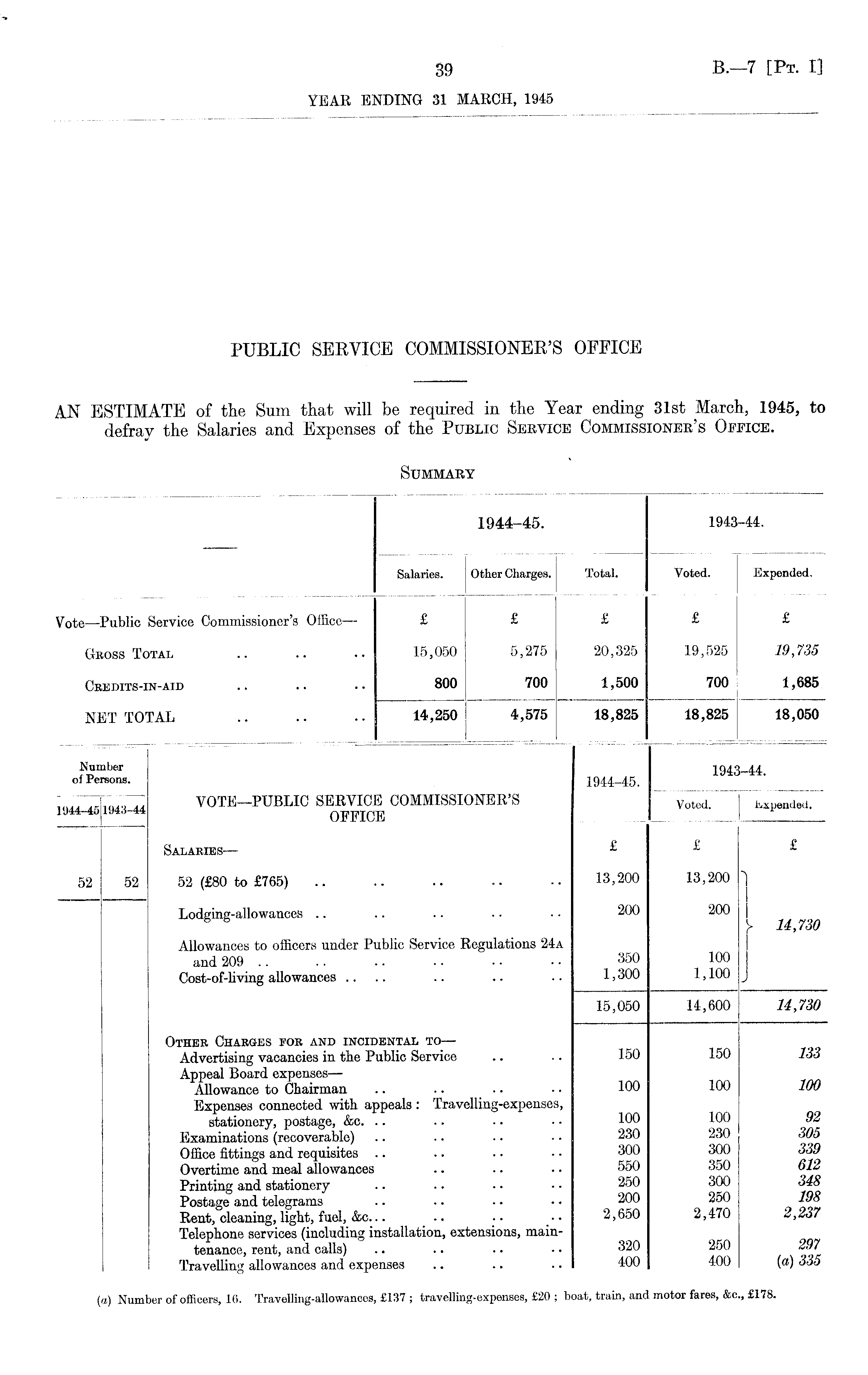 AN ESTIMATE of the Sum that will be required in the Year ending 31st March, 1945, to defray the Salaries and Expenses of the Public Service Commissioner's Office. Summary